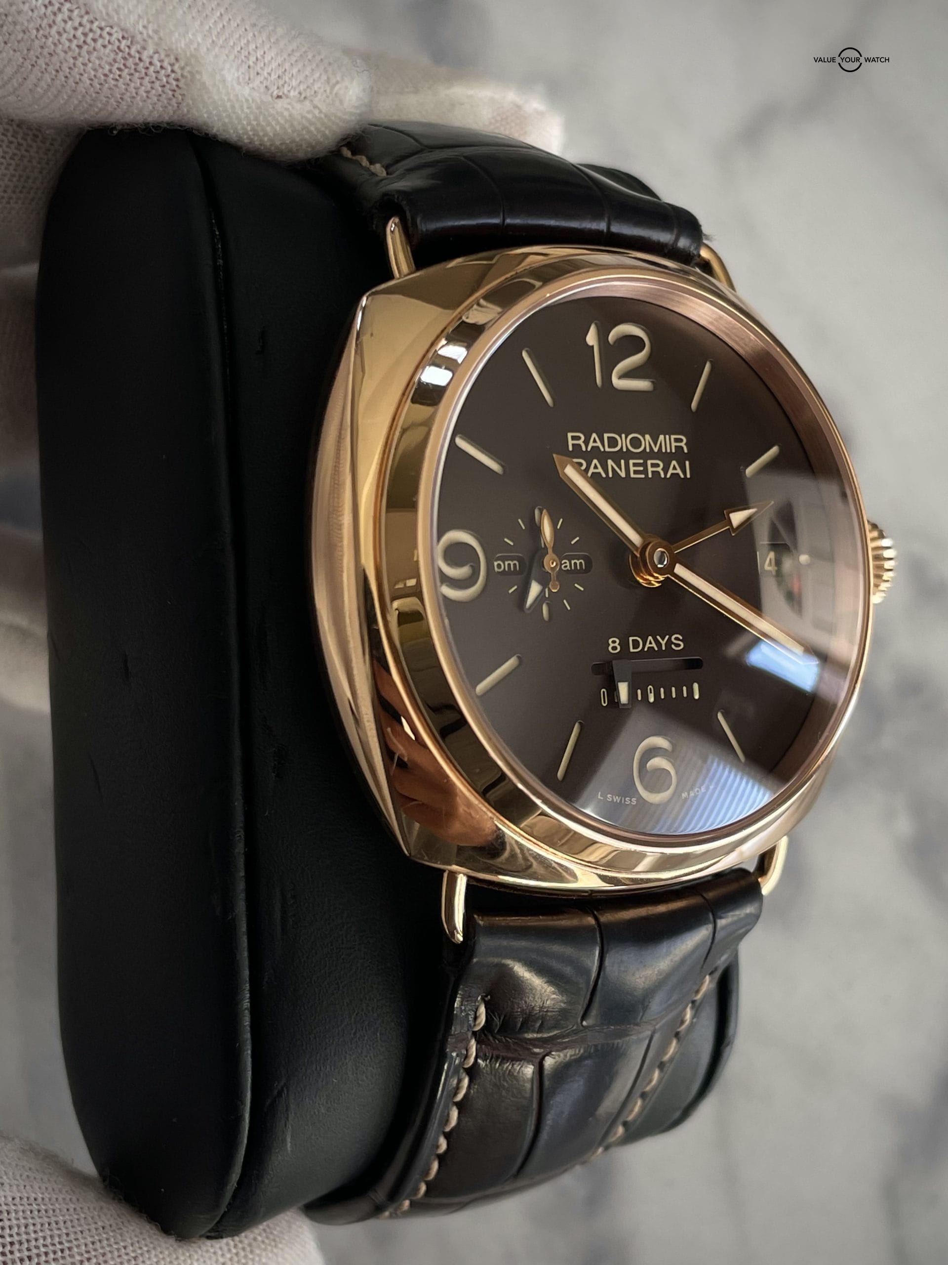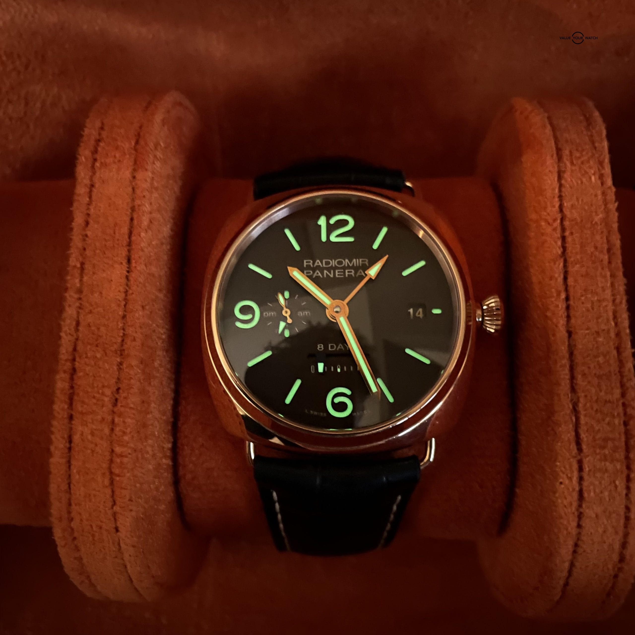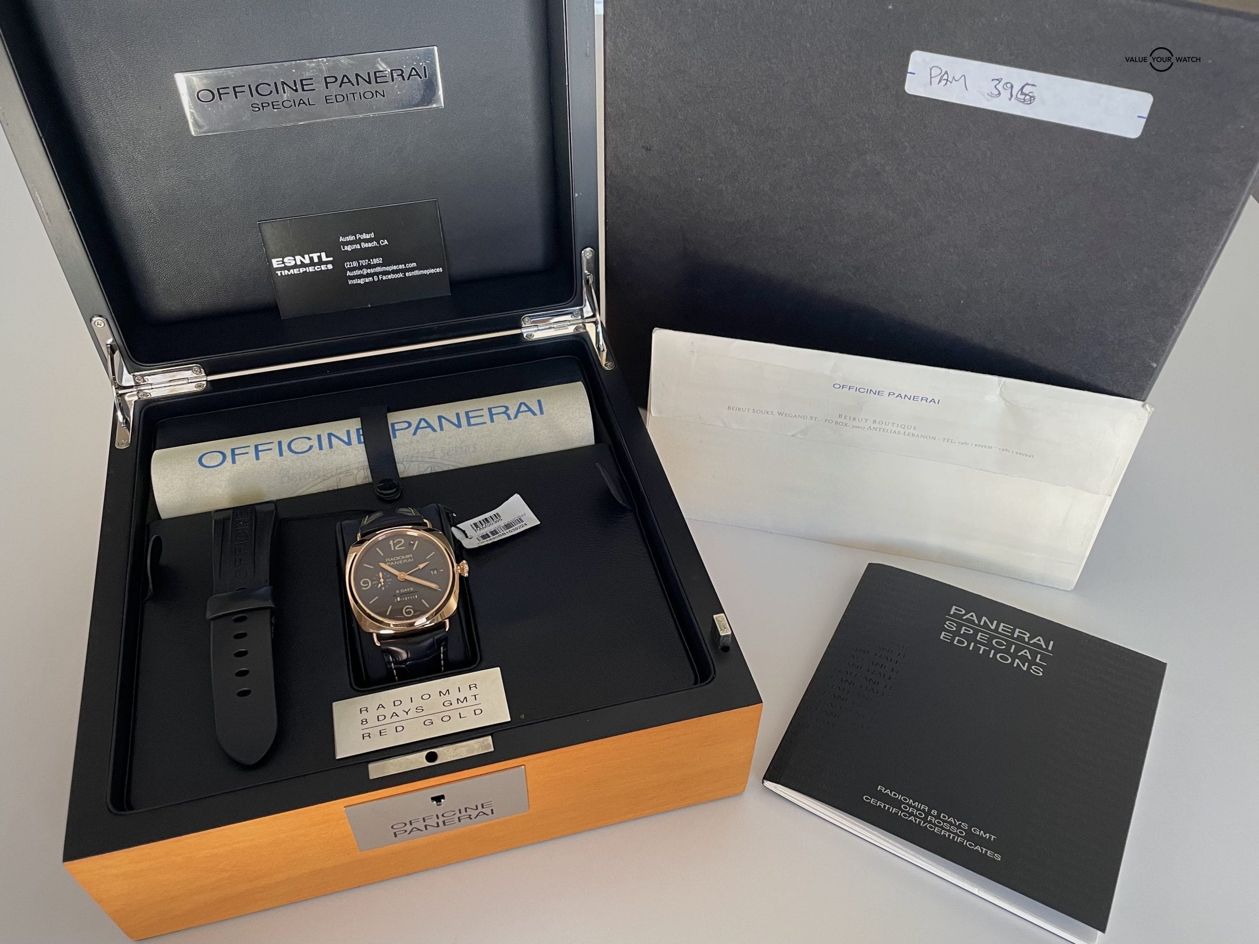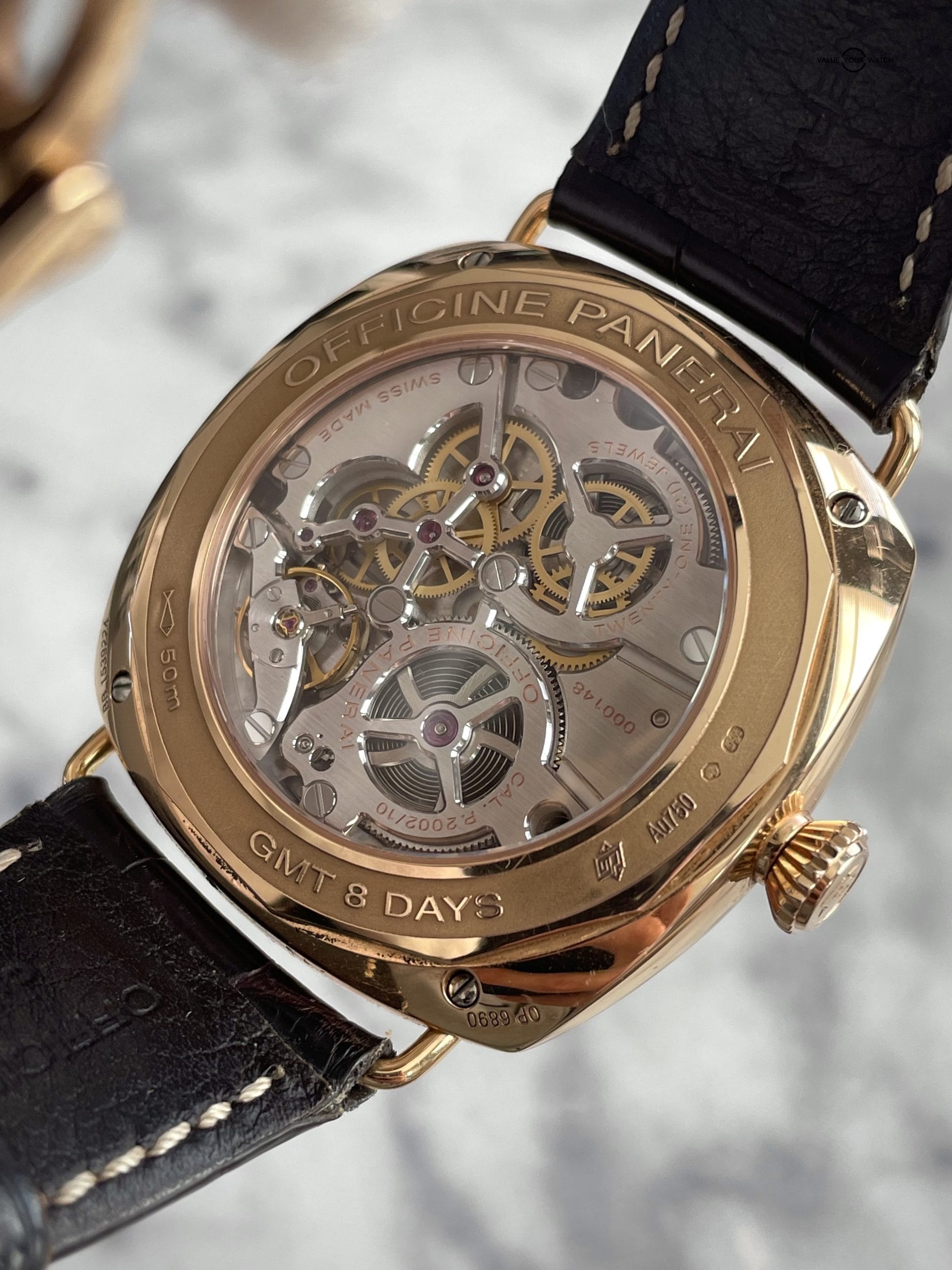 Hey everyone! I would like to offer you my rare and beautiful brown dial 45mm 18kt Rose Gold Panerai Radiomir 8 Days GMT Oro Rosso PAM00395 – Complete Set with original $33.7K MSRP