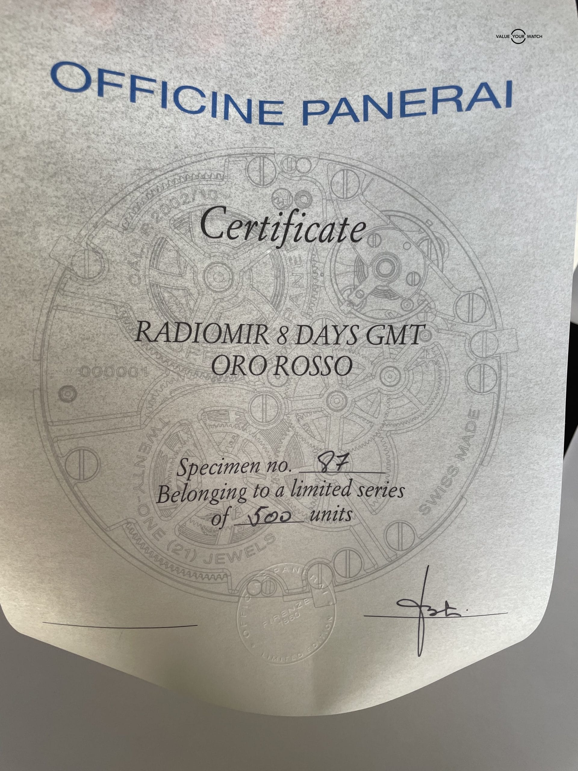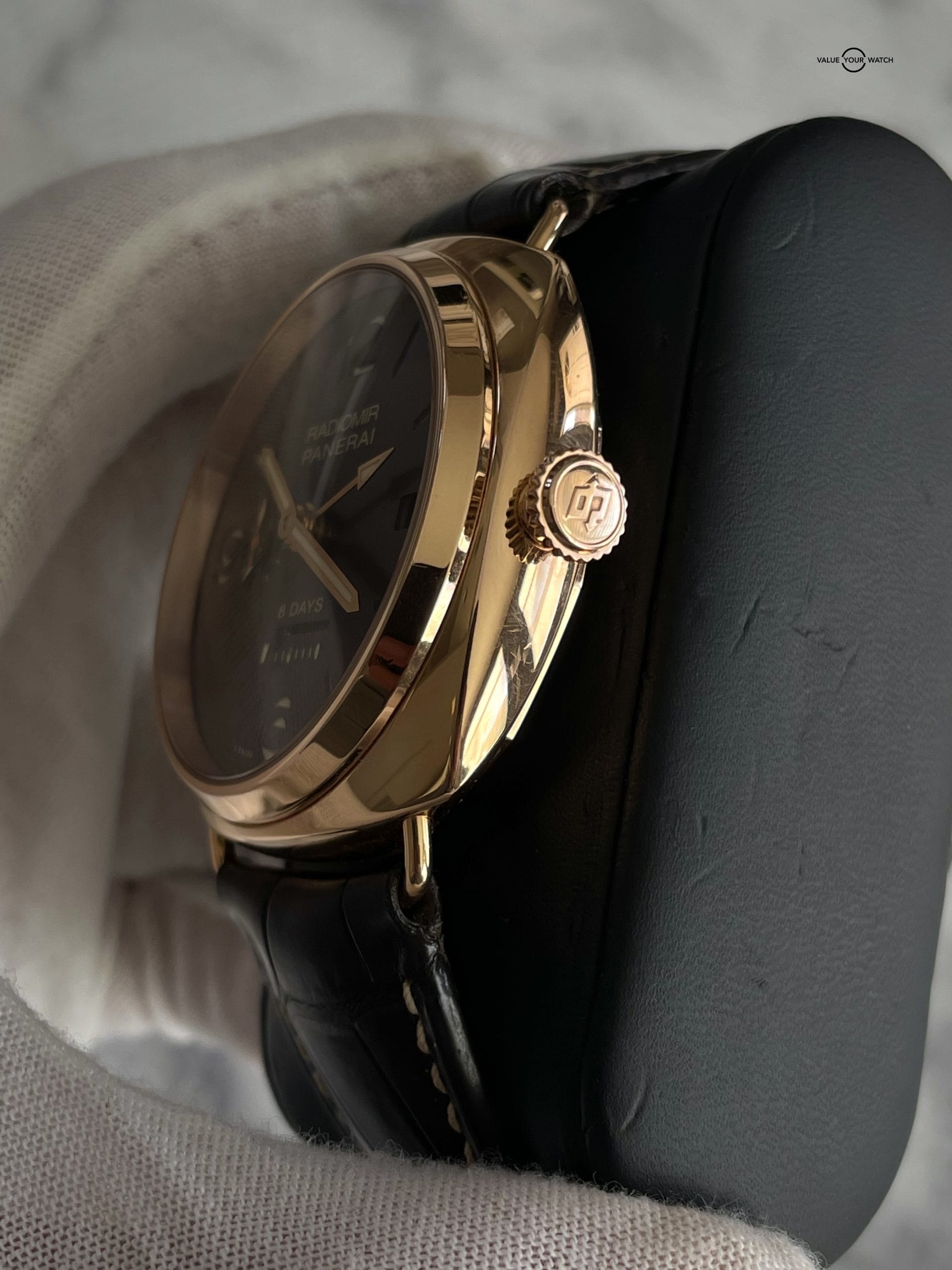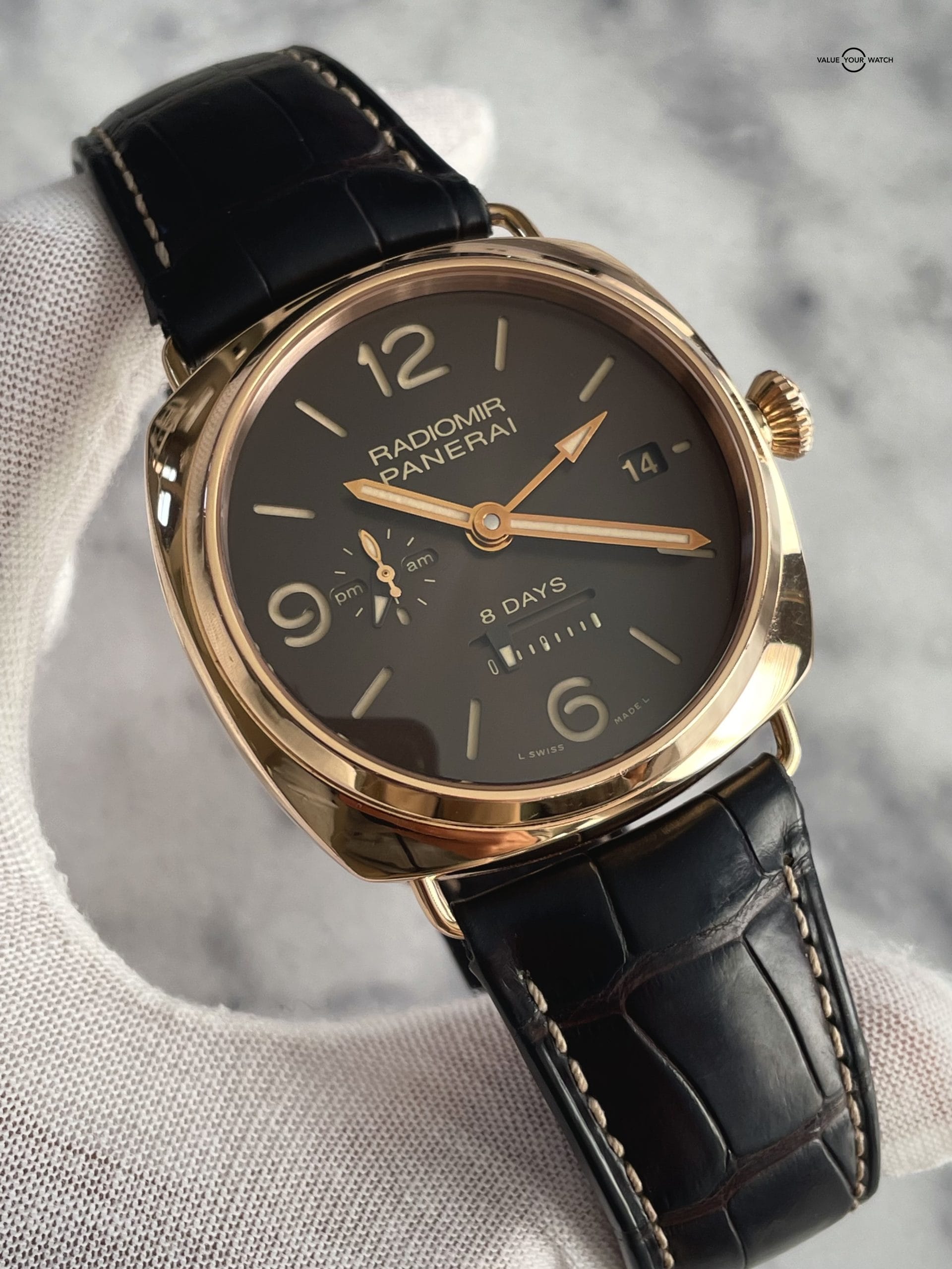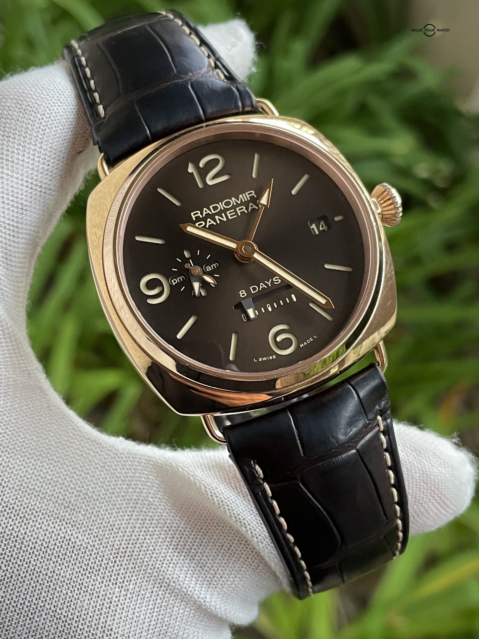 Hey everyone! I would like to offer you my rare and beautiful brown dial 45mm 18kt Rose Gold Panerai Radiomir 8 Days GMT Oro Rosso PAM00395 – Complete Set with original $33.7K MSRP
