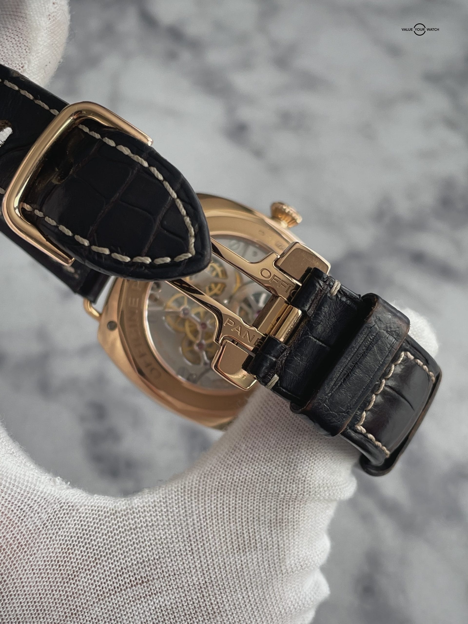 Movement: Hand-wound mechanical with skeletonized bridges, P.2002/10 calibre, created by Panerai