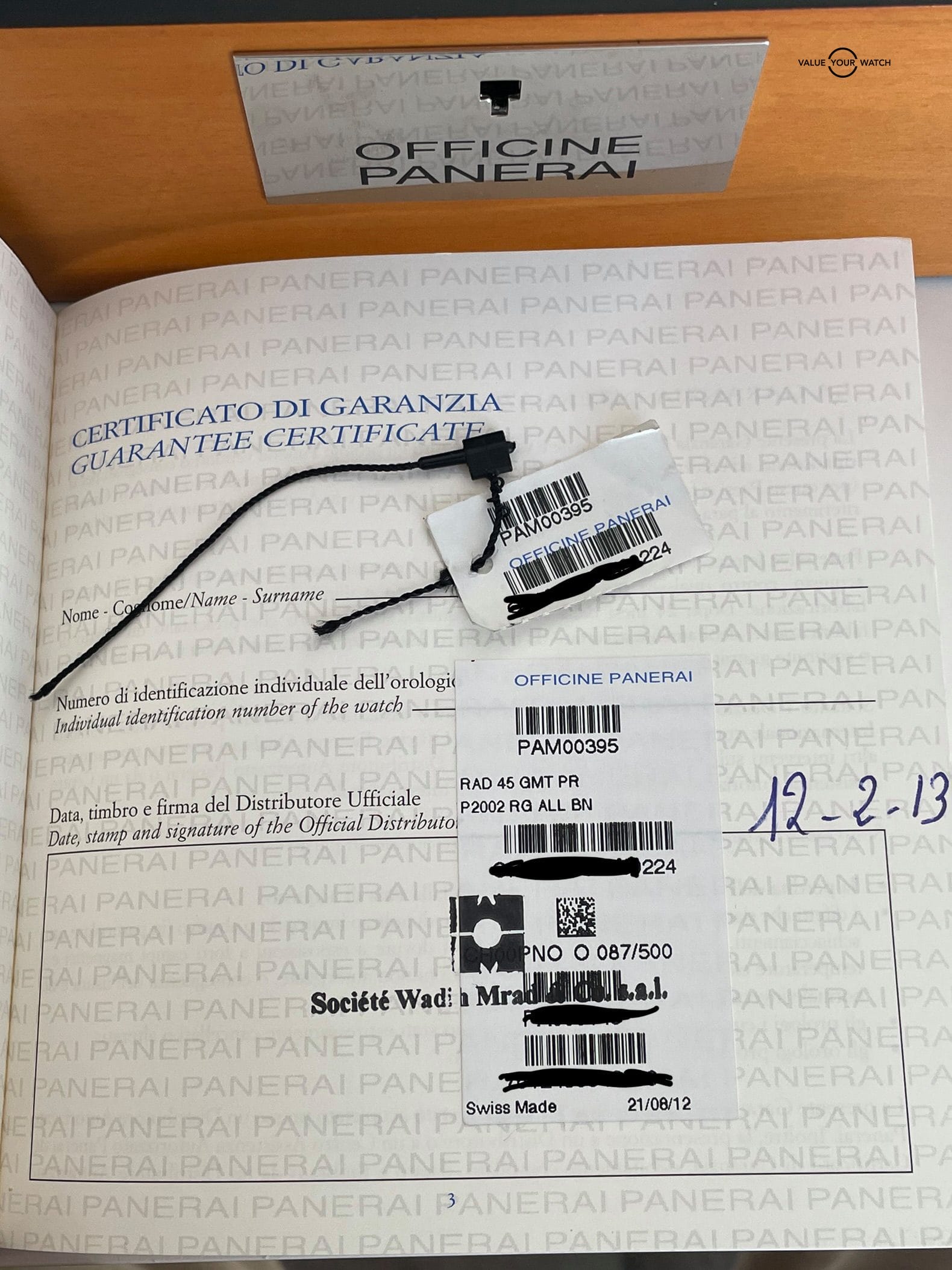 This set comes complete with – Black Outter Box, Panerai Wooden Presentation Box, 2 Panerai Bands (leather alligator & black rubber), Panerai Stamped Certificate, Panerai Certificates Book, original Panerai Receipt, & Panerai Hang-Tag