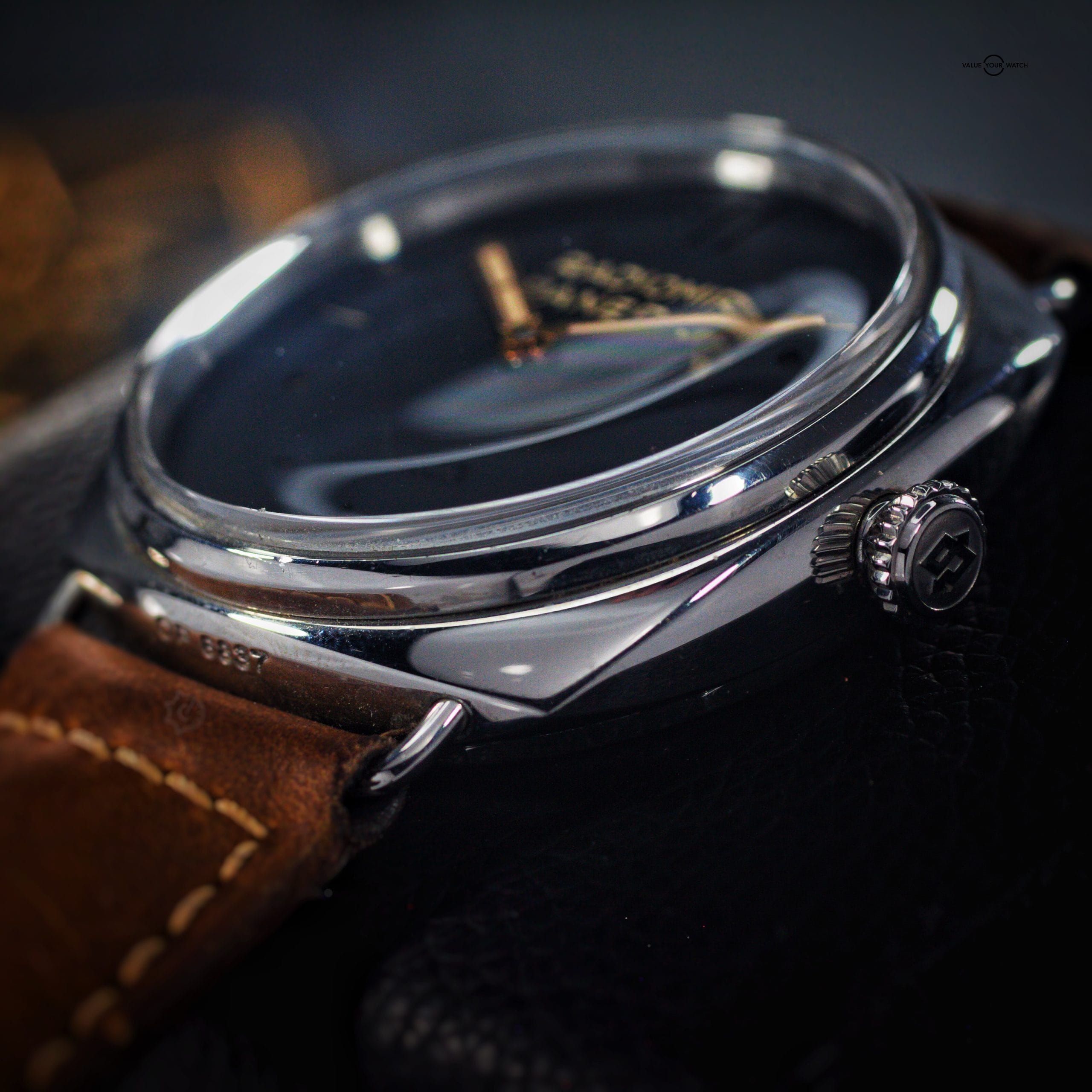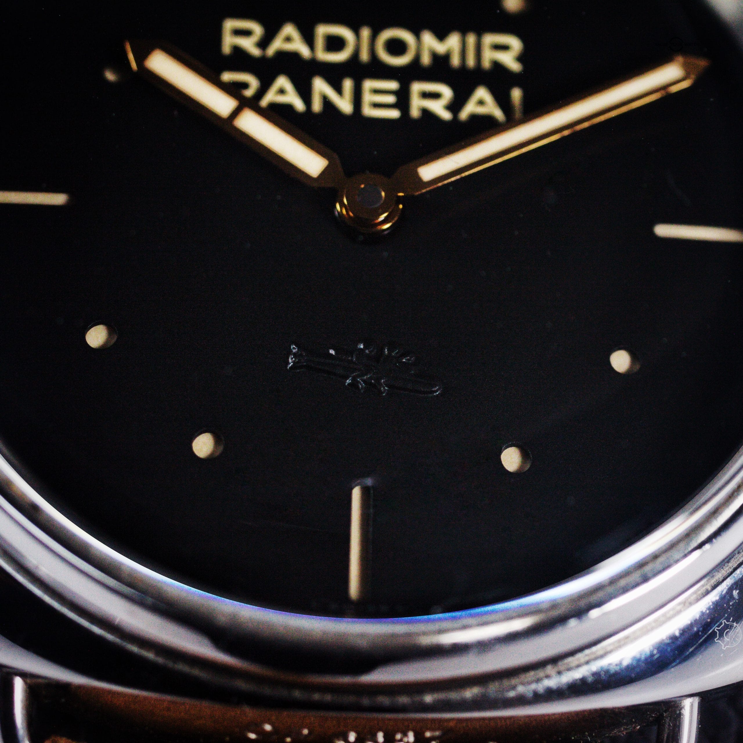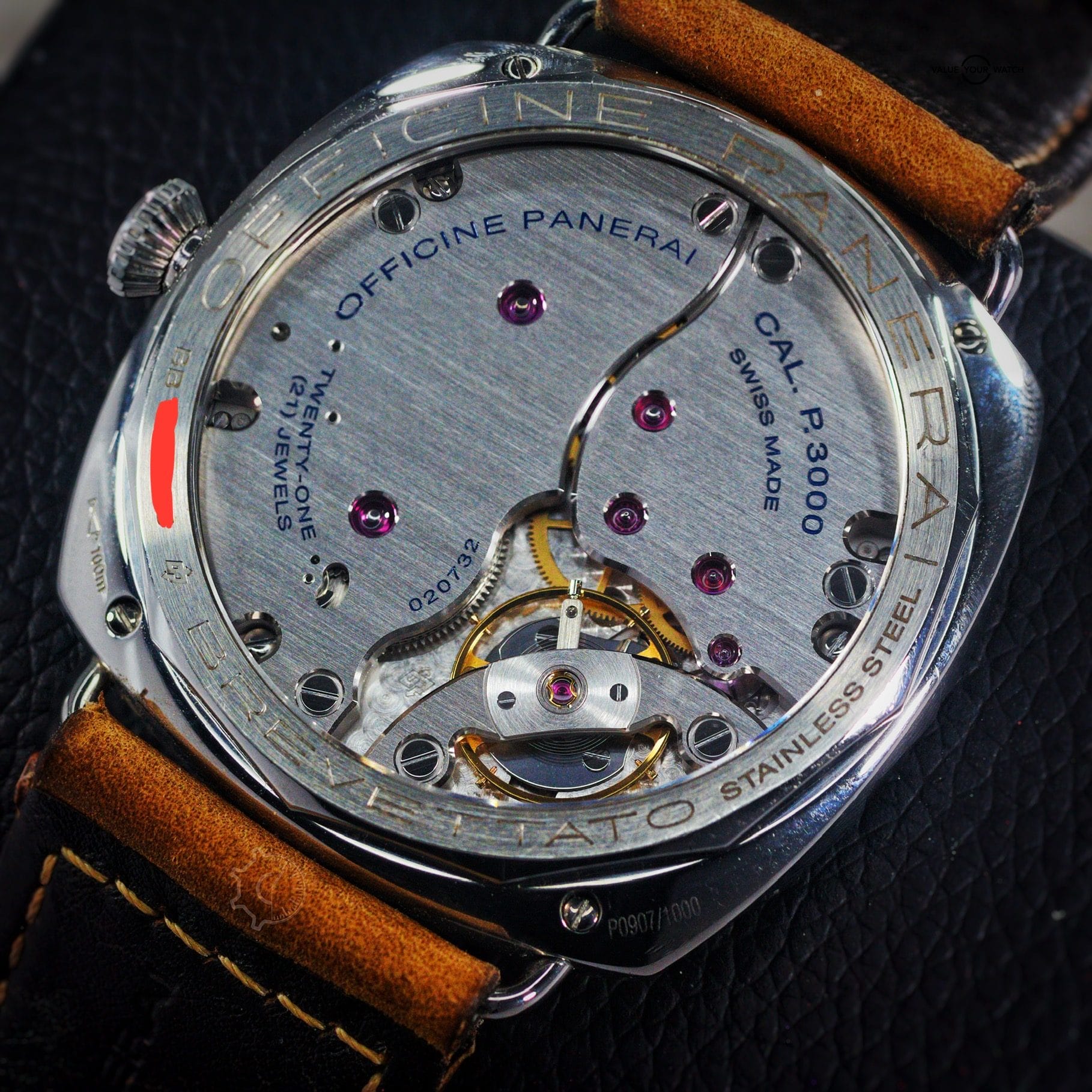 This watch has a beautiful black sandwich dial. Upon the dial at the 6 o’clock position is the Siluro a lenta corsa (ENG: slow running torpedo) on the dial. The case gives a very retro feel, harkening back to the early days of the Italian Navy & Panerai’s relationship. The timepiece has a 3 day power reserve, perfect for everyday wear. The exhibition caseback lets you see the beautiful manual wind in-house P3000 movement.