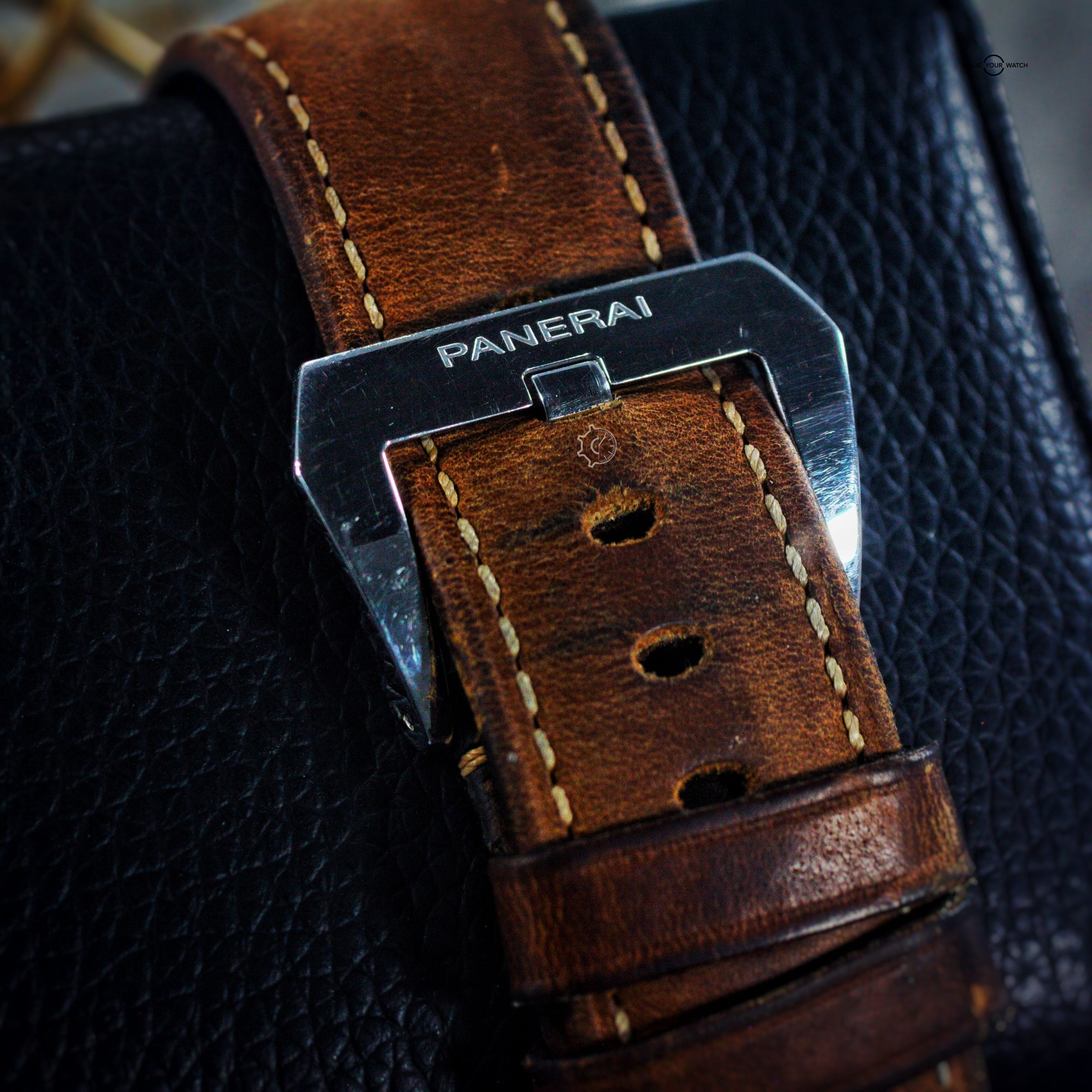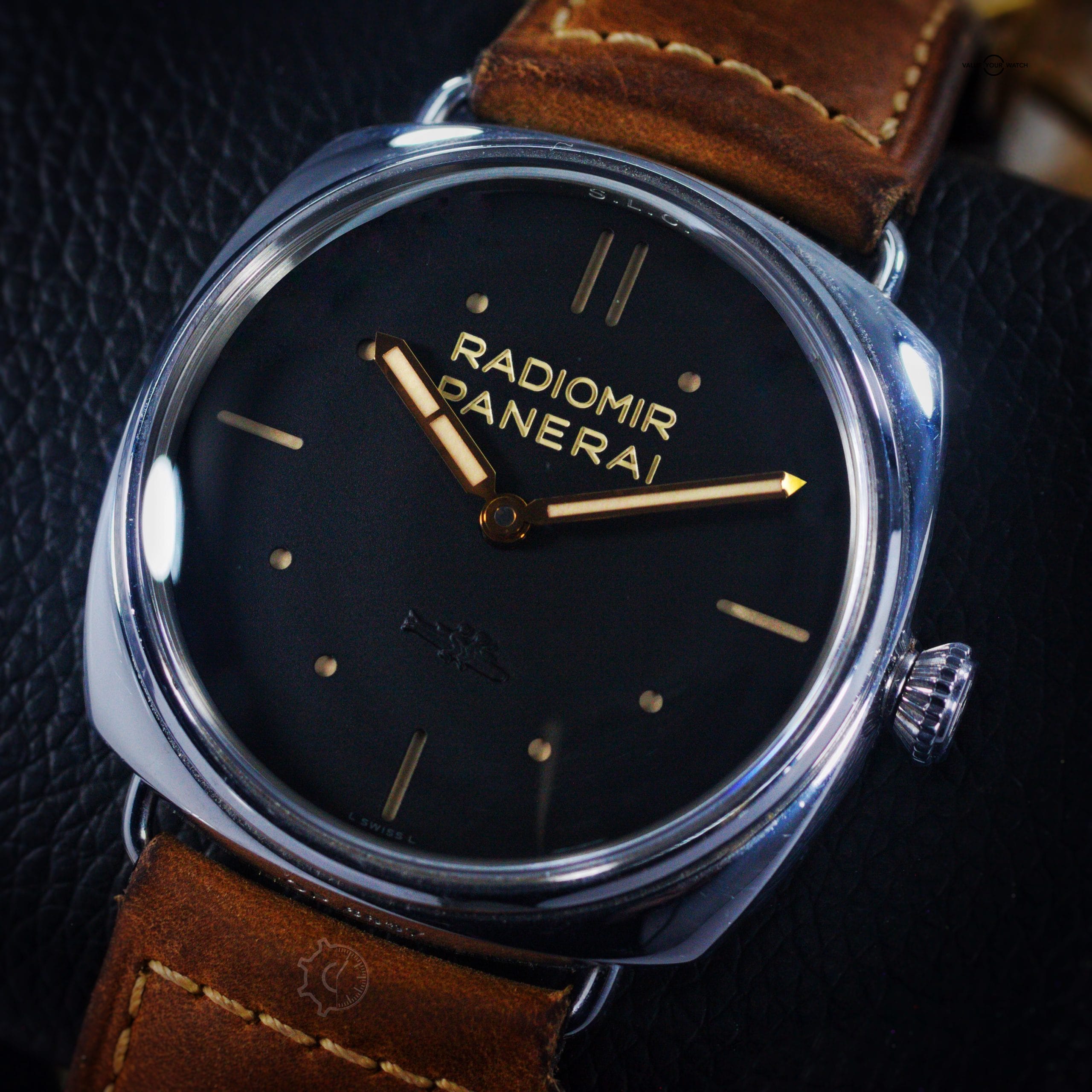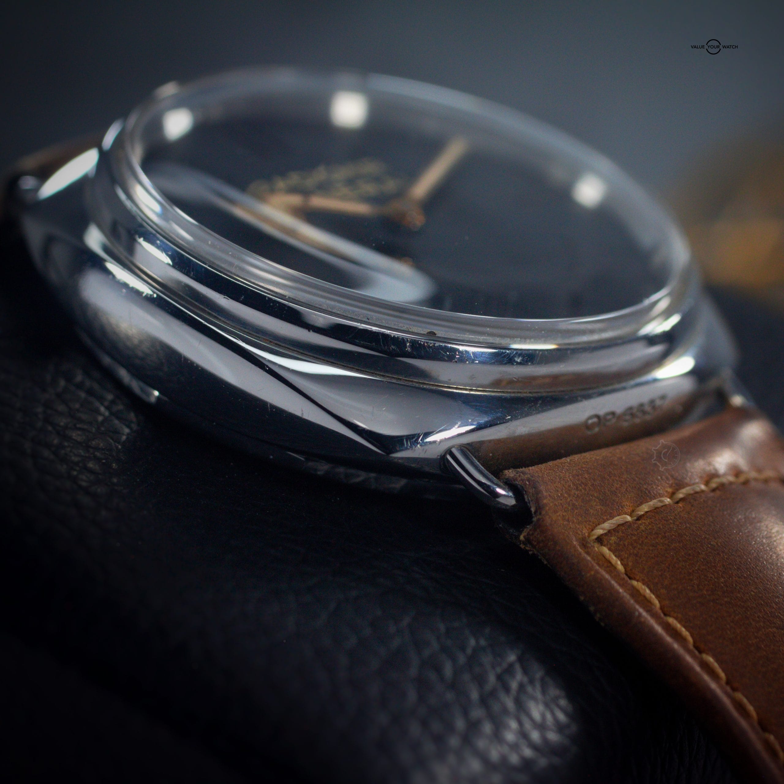 This watch has a beautiful black sandwich dial. Upon the dial at the 6 o’clock position is the Siluro a lenta corsa (ENG: slow running torpedo) on the dial. The case gives a very retro feel, harkening back to the early days of the Italian Navy & Panerai’s relationship. The timepiece has a 3 day power reserve, perfect for everyday wear. The exhibition caseback lets you see the beautiful manual wind in-house P3000 movement.