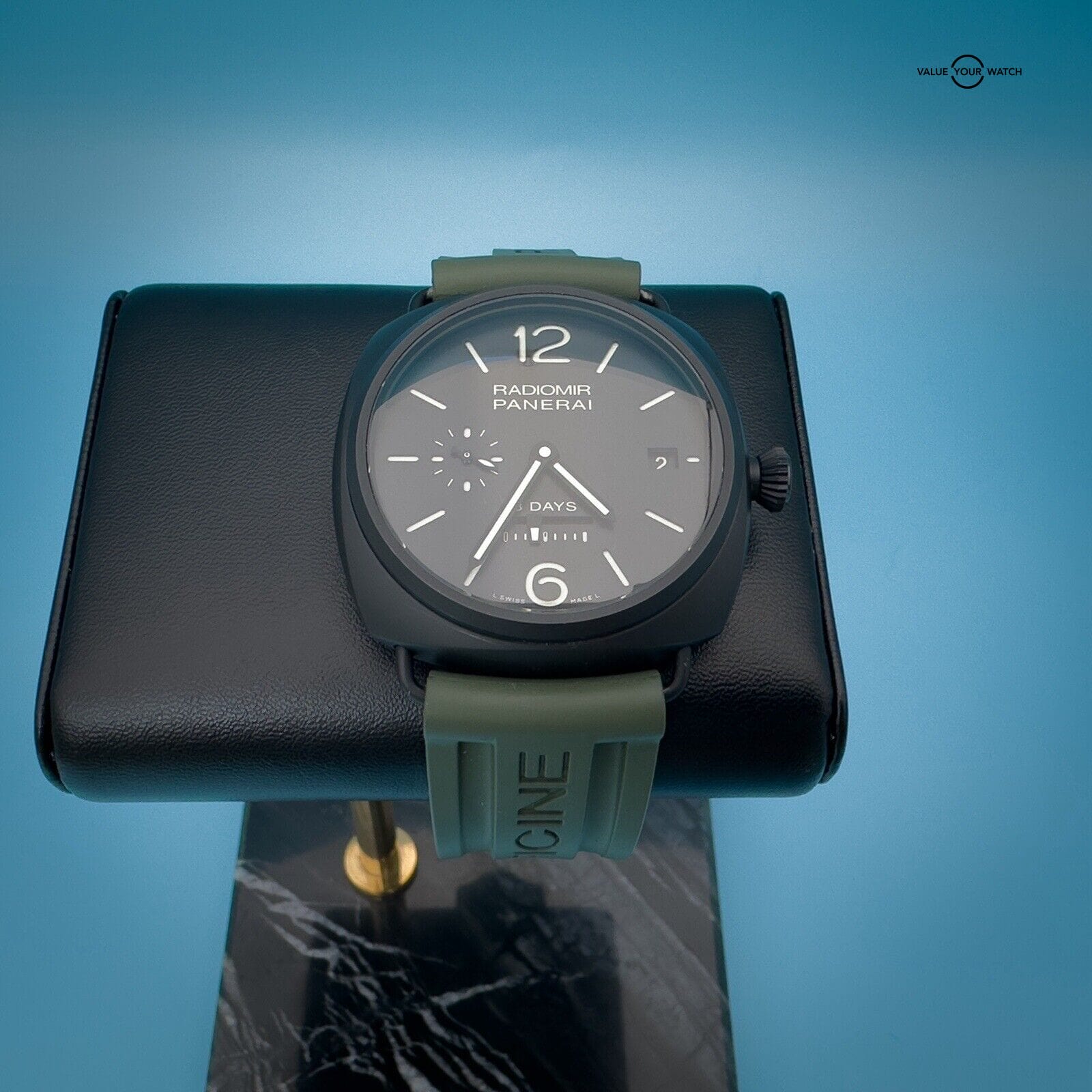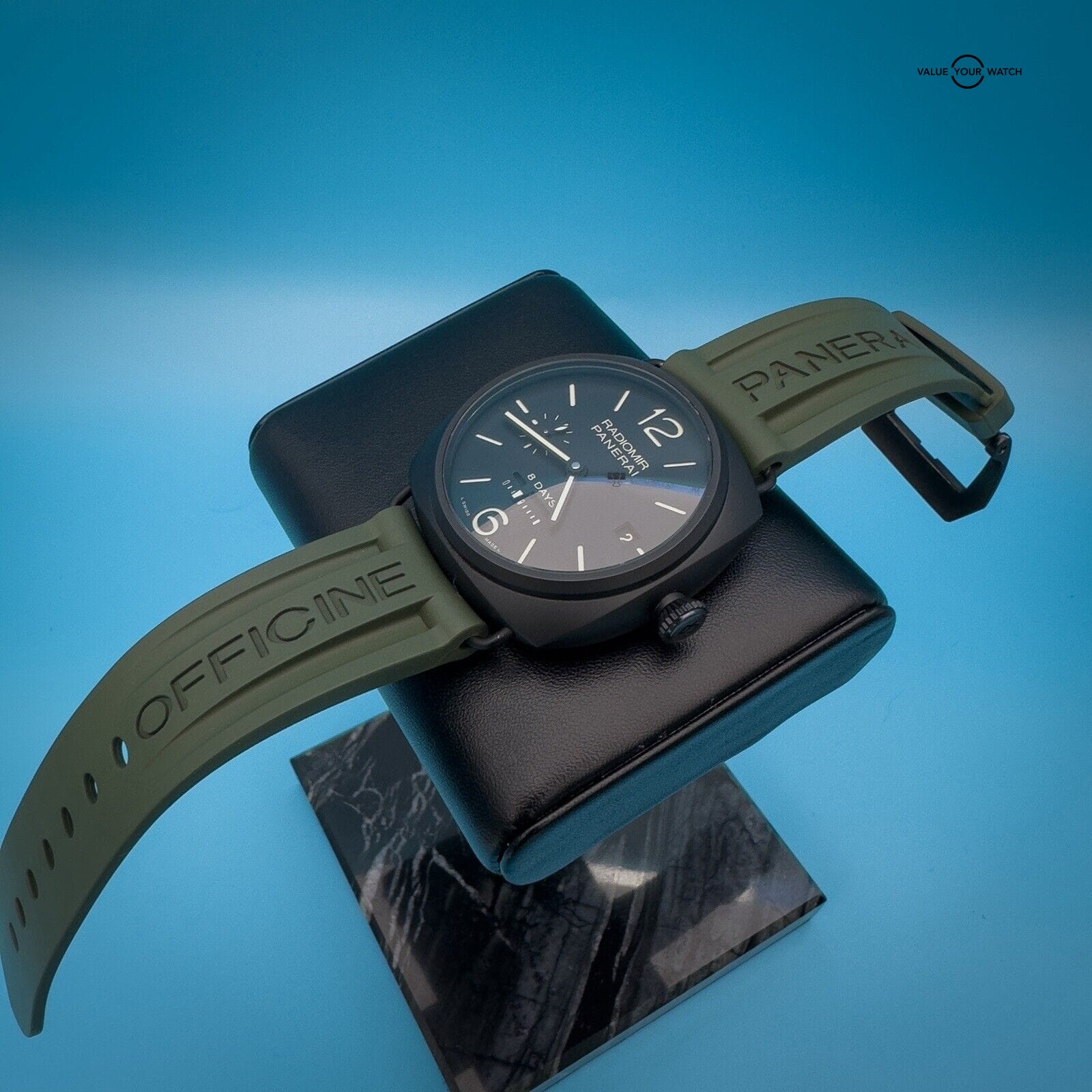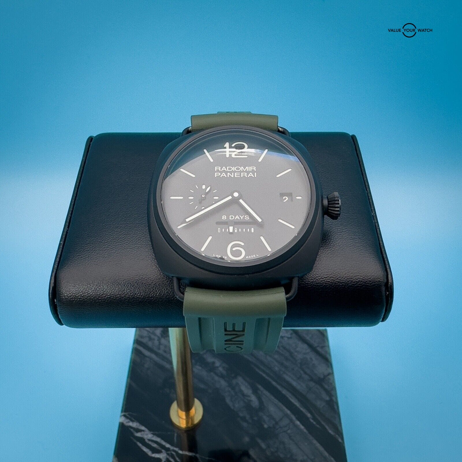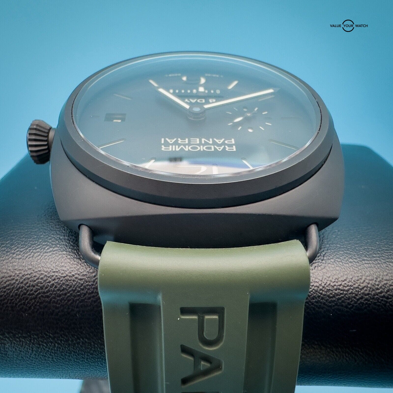 This watch is in excellent condition with only a scuff on the buckle. It comes with 2 Panerai two-piece straps, green rubber and its original black calfskin strap featuring a unique sueded treatment that’s truly unique to this watch, as well as its box, papers, and instructions manual.