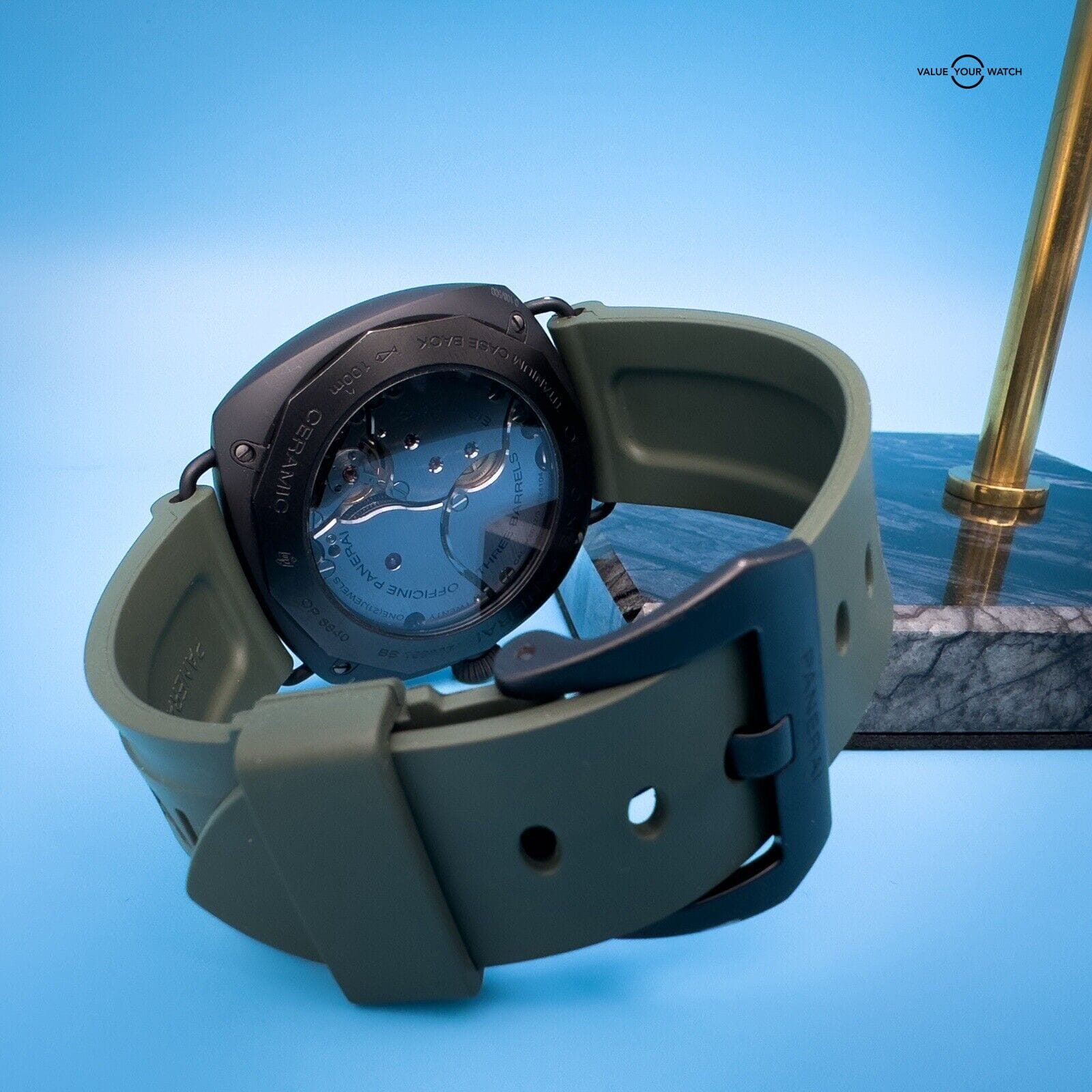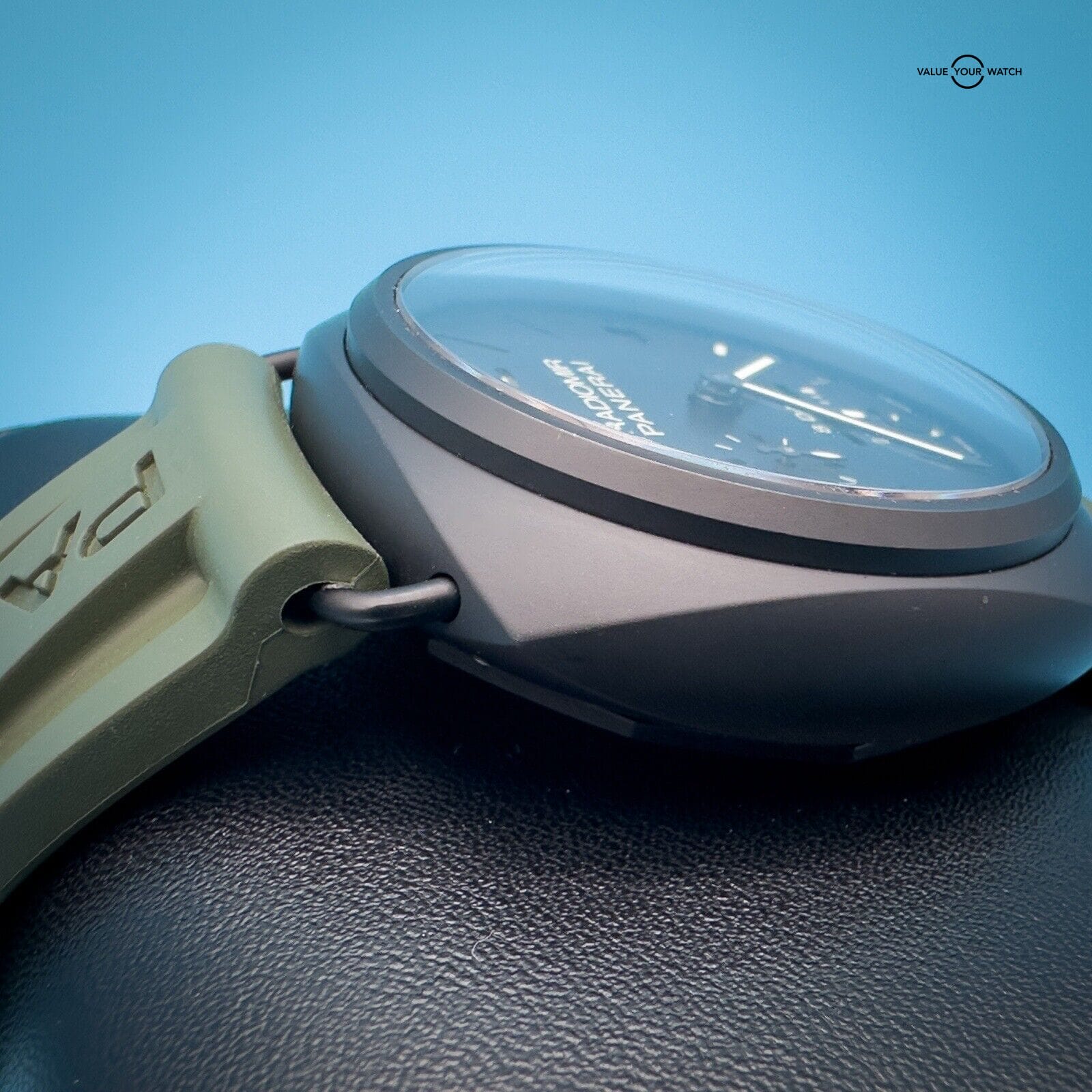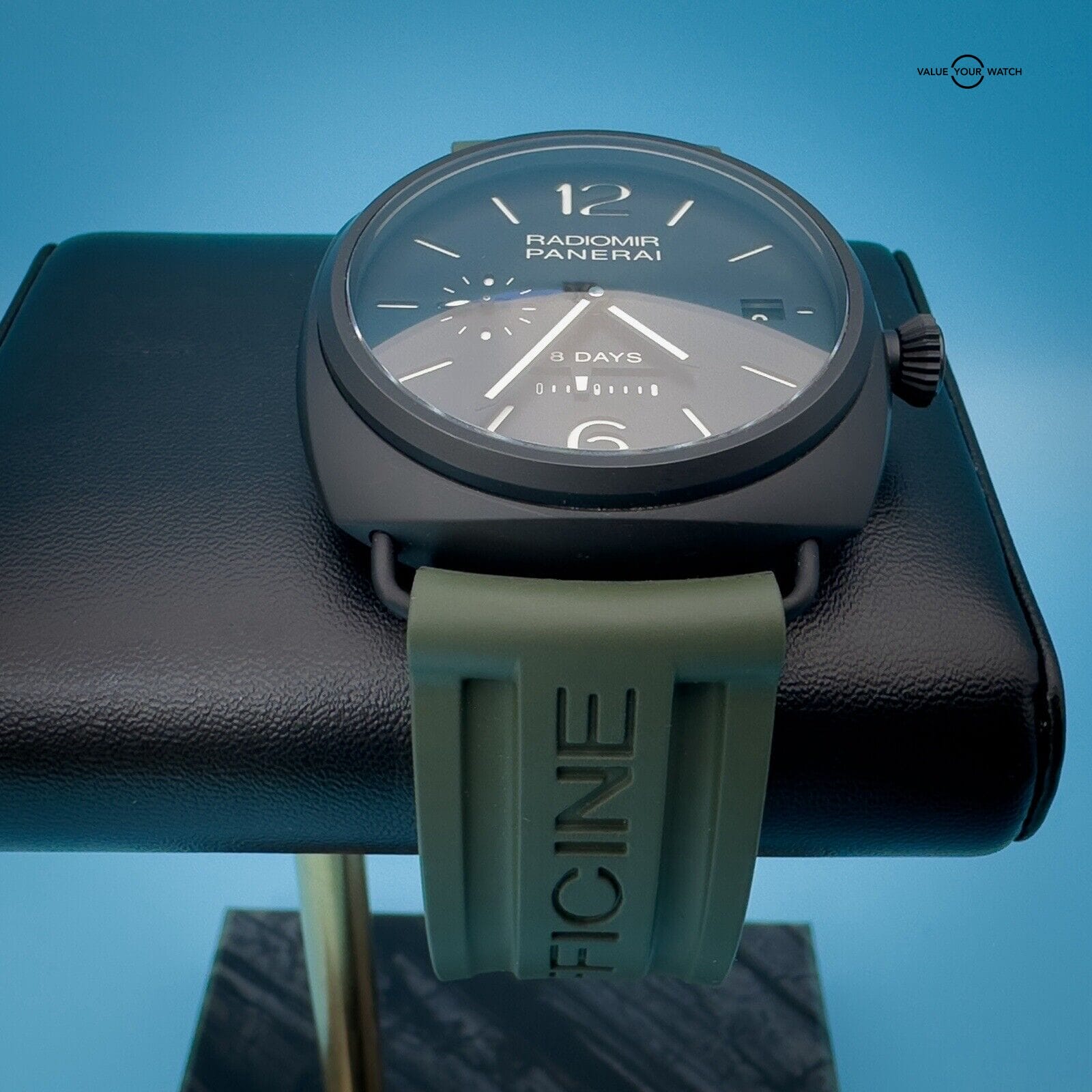 This watch is in excellent condition with only a scuff on the buckle. It comes with 2 Panerai two-piece straps, green rubber and its original black calfskin strap featuring a unique sueded treatment that’s truly unique to this watch, as well as its box, papers, and instructions manual.