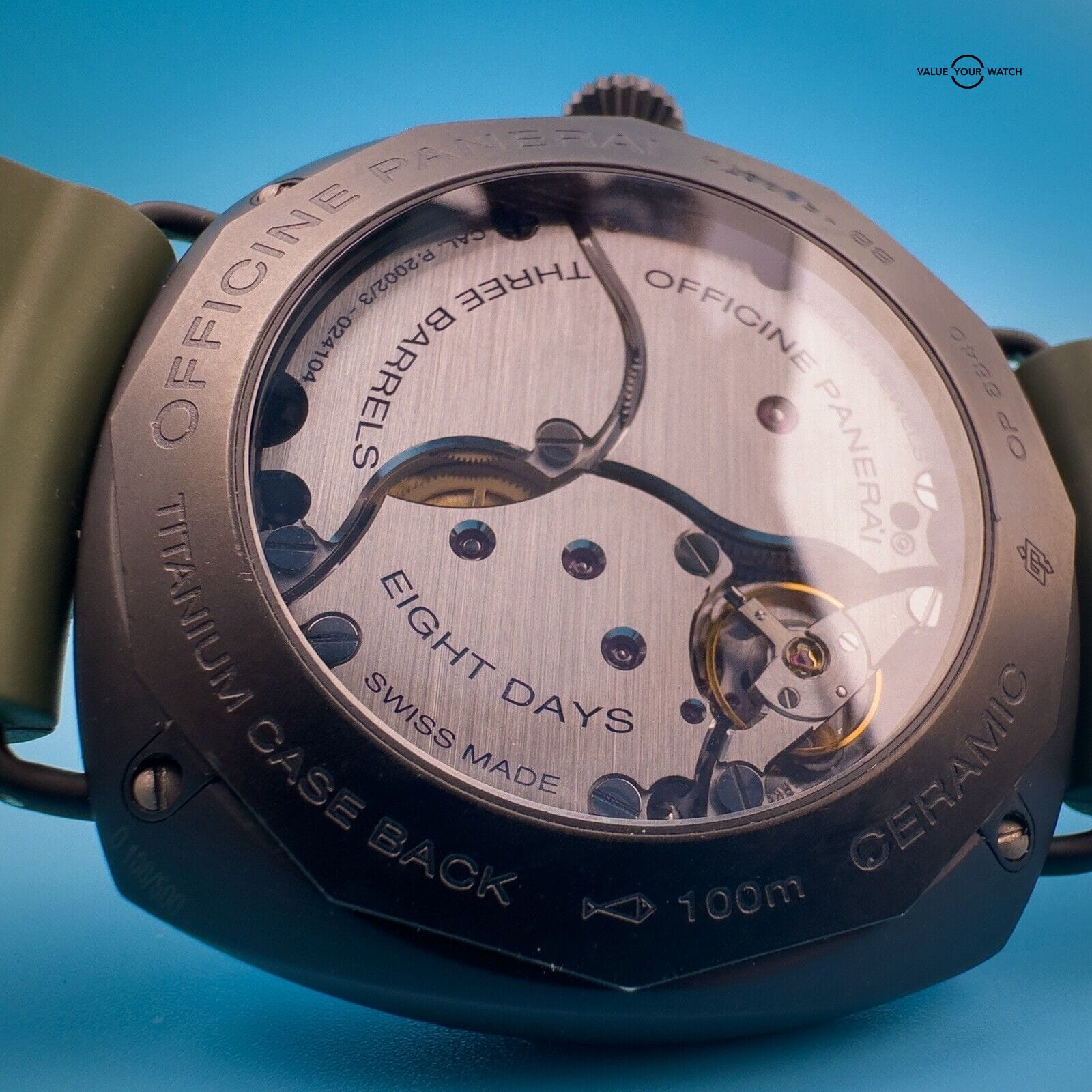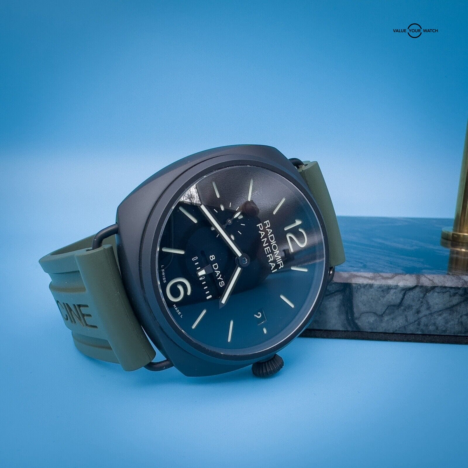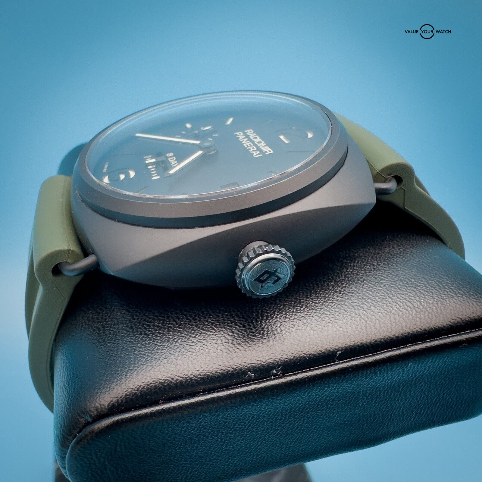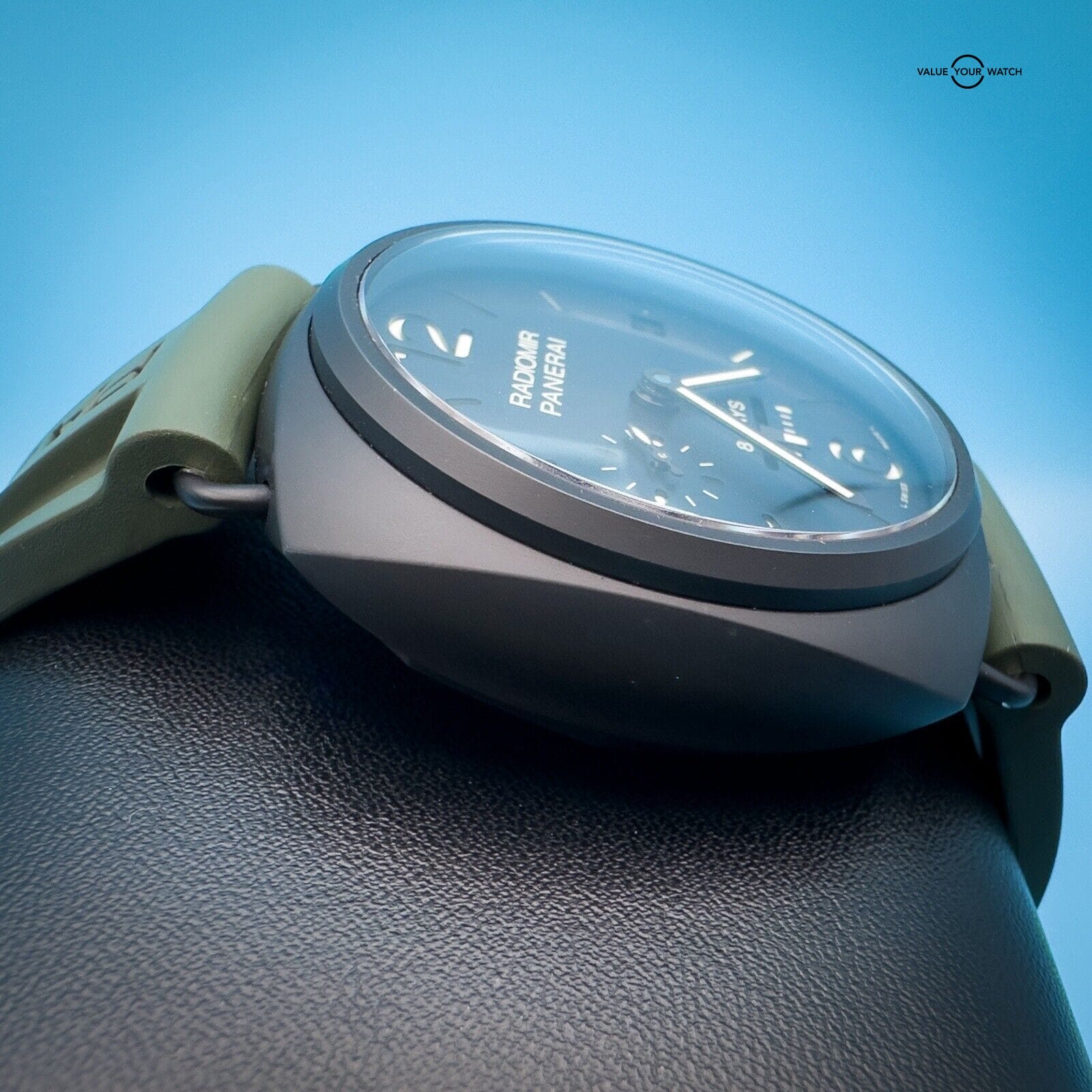 This watch is in excellent condition with only a scuff on the buckle. It comes with 2 Panerai two-piece straps, green rubber and its original black calfskin strap featuring a unique sueded treatment that’s truly unique to this watch, as well as its box, papers, and instructions manual.