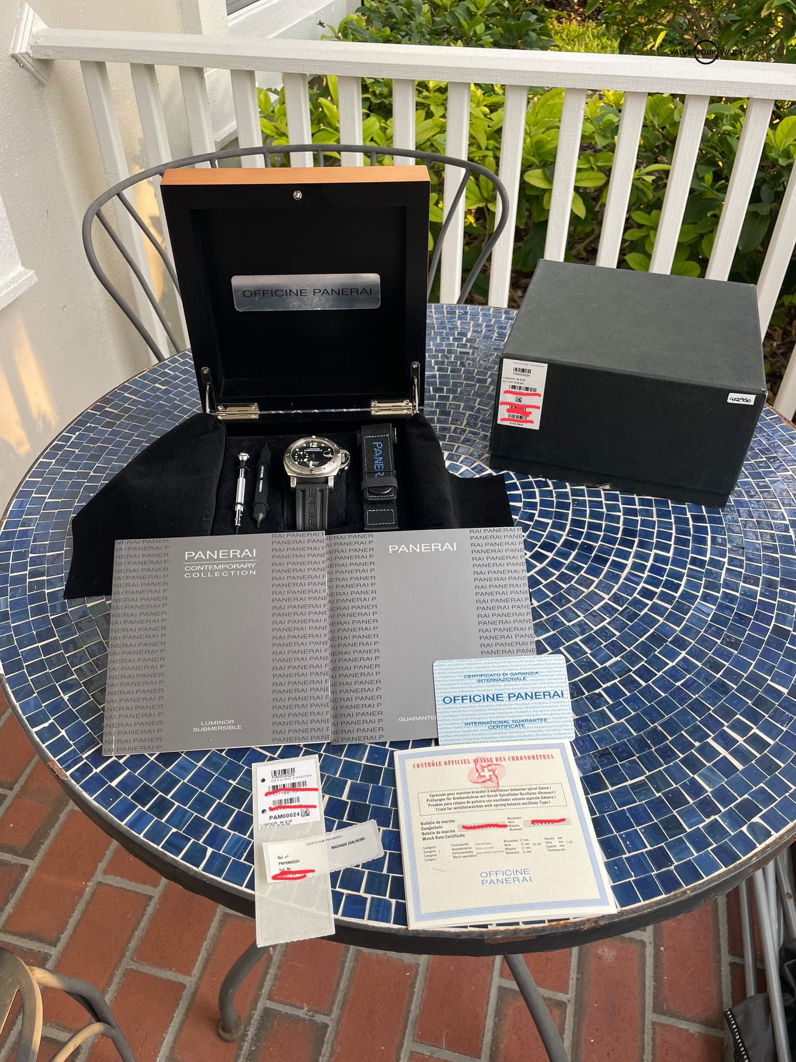 THIS….is the Panerai Submersible PAM 24 Automatic. This timepiece features a Black Dial on OEM Panerai Rubber featuring a deployant buckle. The stainless steel case measures 44mm. This piece comes complete with double boxes, COSC certificate, stickers, booklets, warranty card and strap changing tools. The OEM rubber strap and dive strap are both unworn and the deployant buckle still has some of the protective stickers from the factory. The Pam 24 is the quintessential Panerai Submersible and is a must have for any Panerai Collector or watch enthusiast