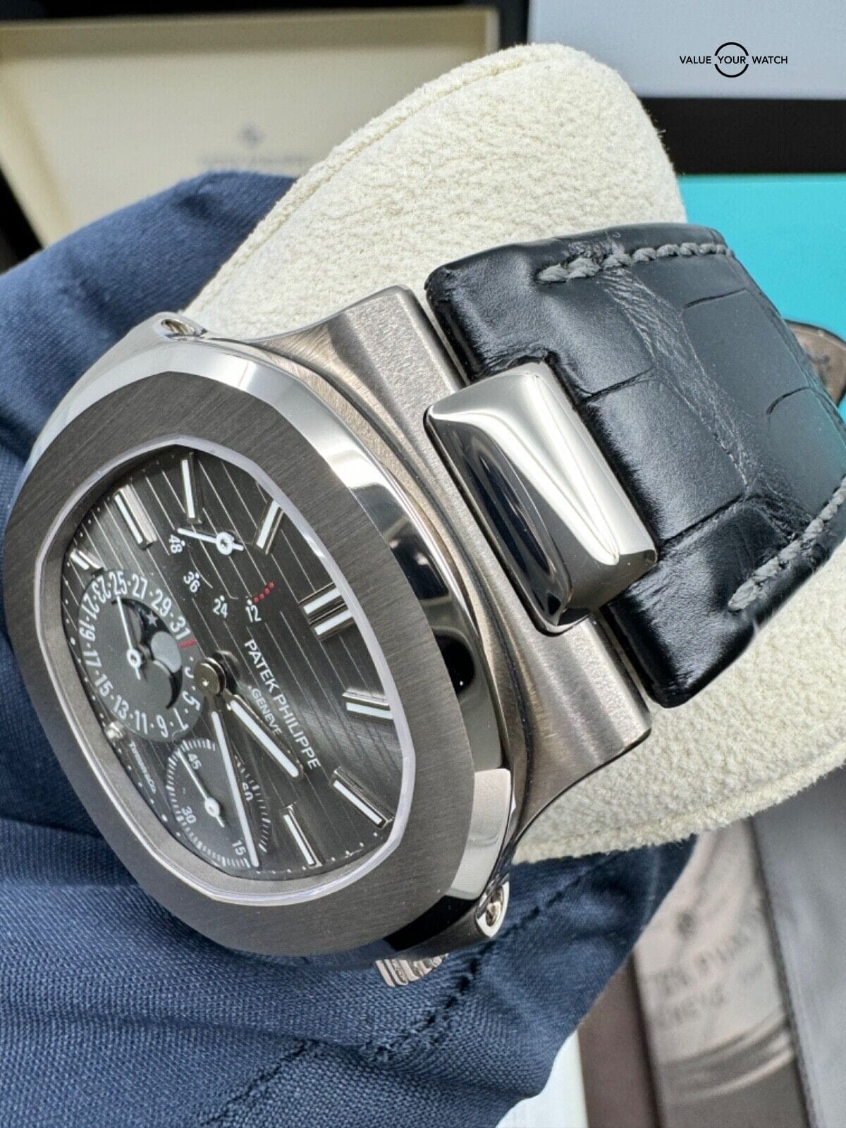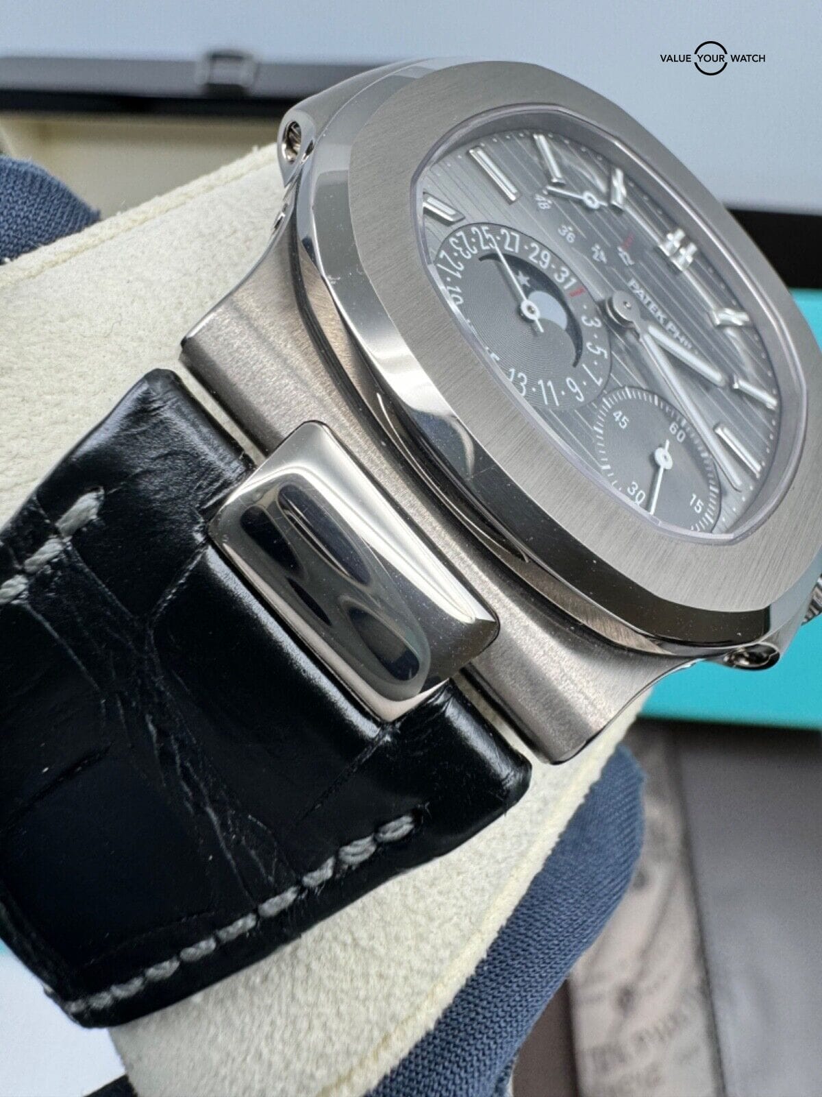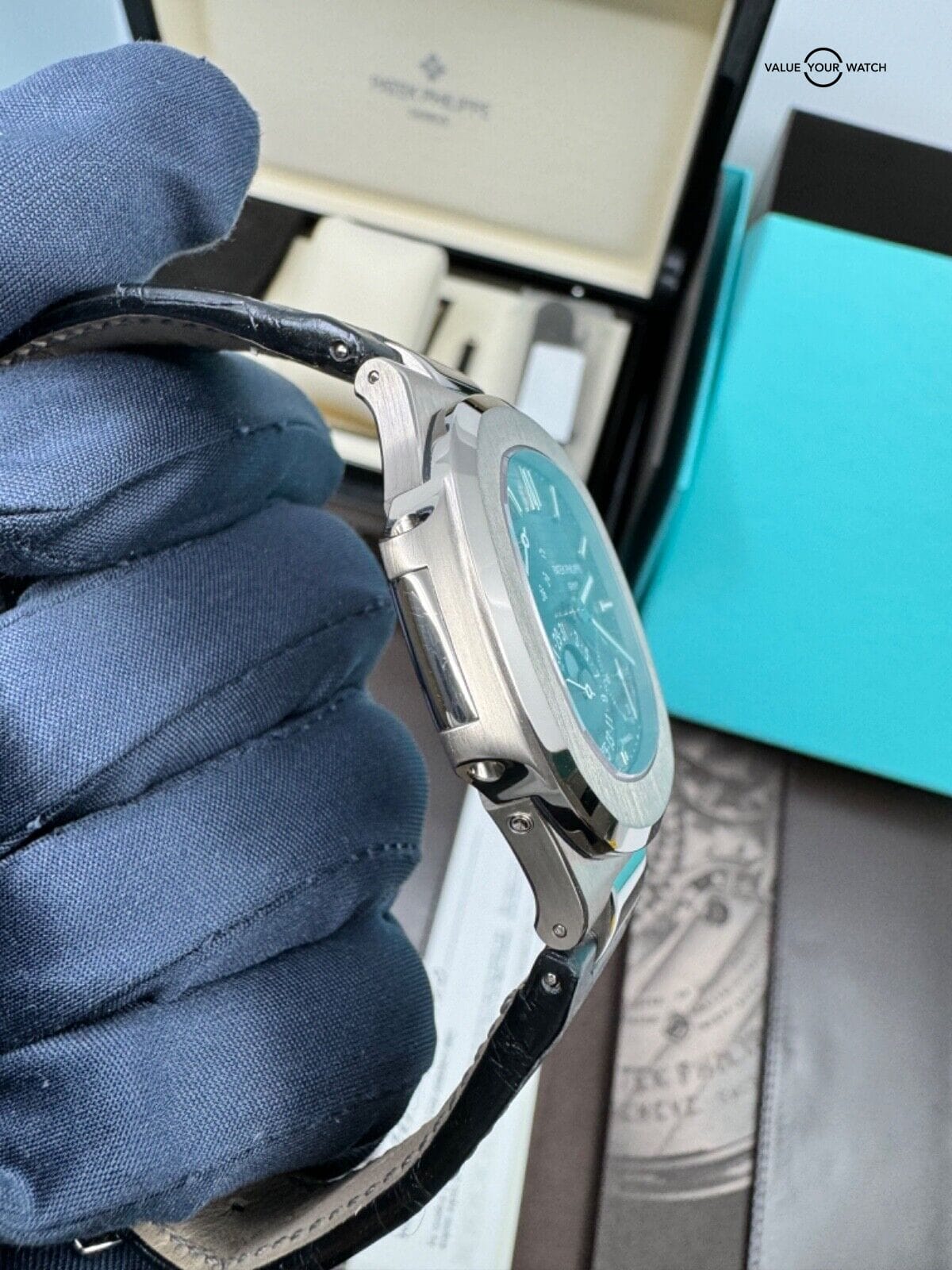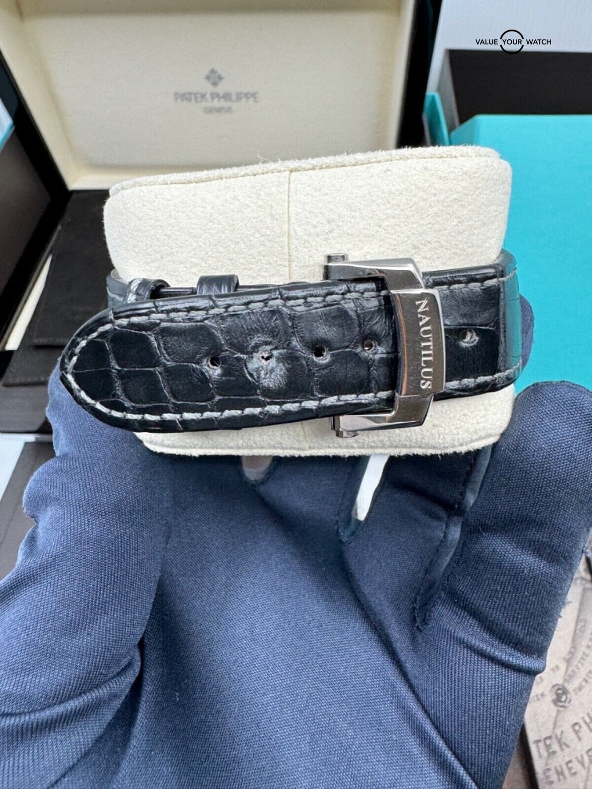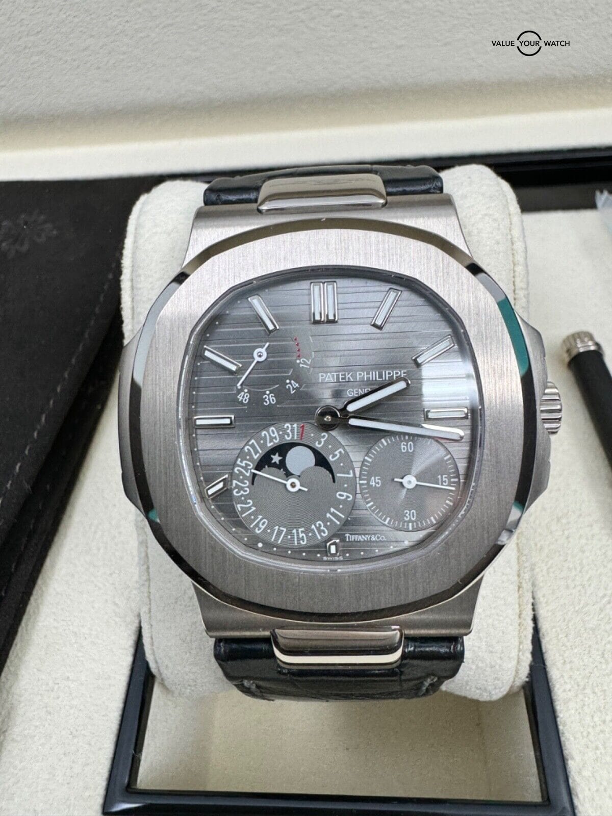 Complete set with everything including the pusher, proper manual etc, in top condition. Alligator strap has some wear, rubber strap still sealed. Bottom of the outer box has some wear from moving and storage. Definitely the best Tiffany stamped Nautilus option in this price range.