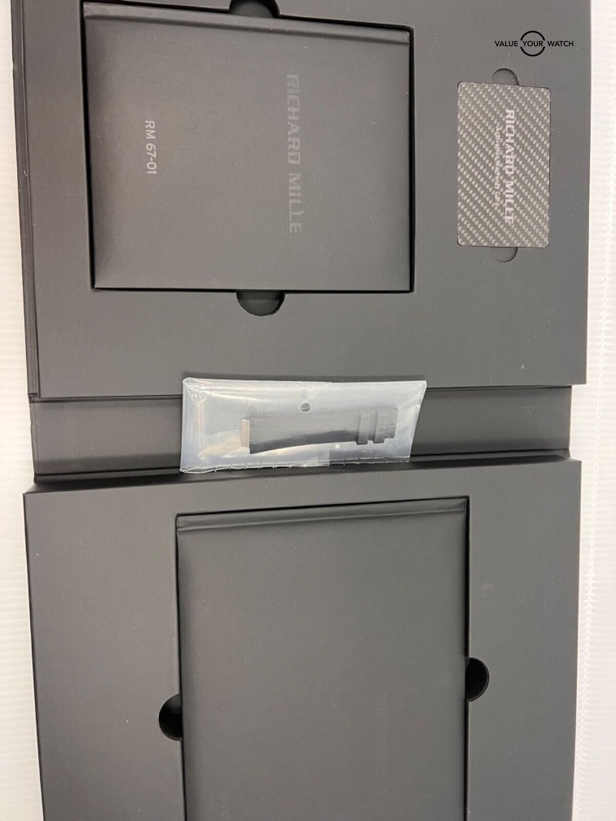 The 2020 Richard Mille RM 67-01 Extra Flat Titanium comes as a complete set, including the original box, papers, and a black strap. This complete set adds value and authenticity to the timepiece, making it a desirable option for collectors and enthusiasts. Owning the full set allows you to experience the complete package of this exceptional watch.