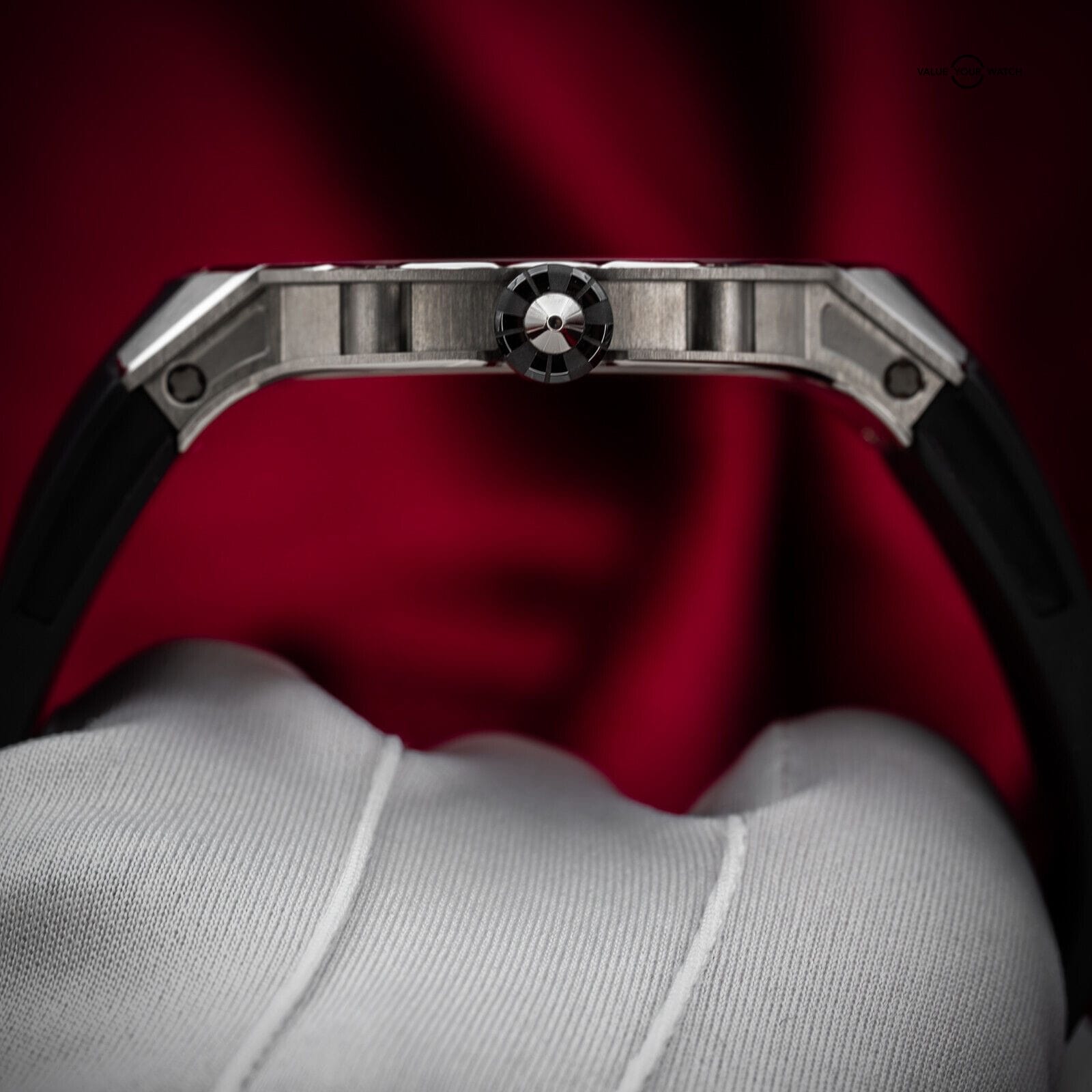 A true masterpiece of horology, this Richard Mille contains a movement that is only 2.6mm thick. RM’s in-house calibre allows the total thickness of this piece to sit at a mere 6.3mm, and incredible feat of engineering given that this is still an automatically winding mechanical movement.