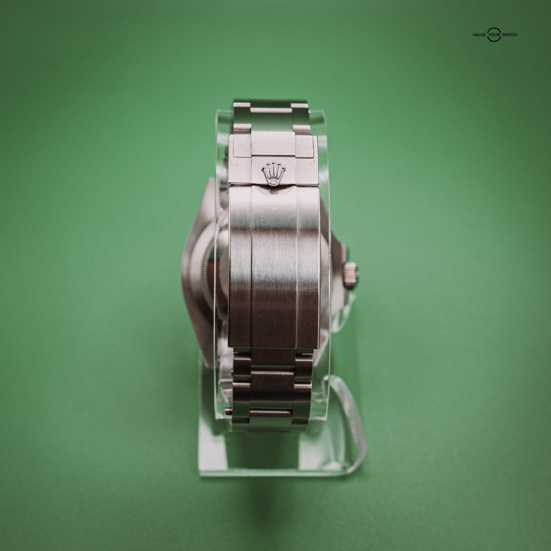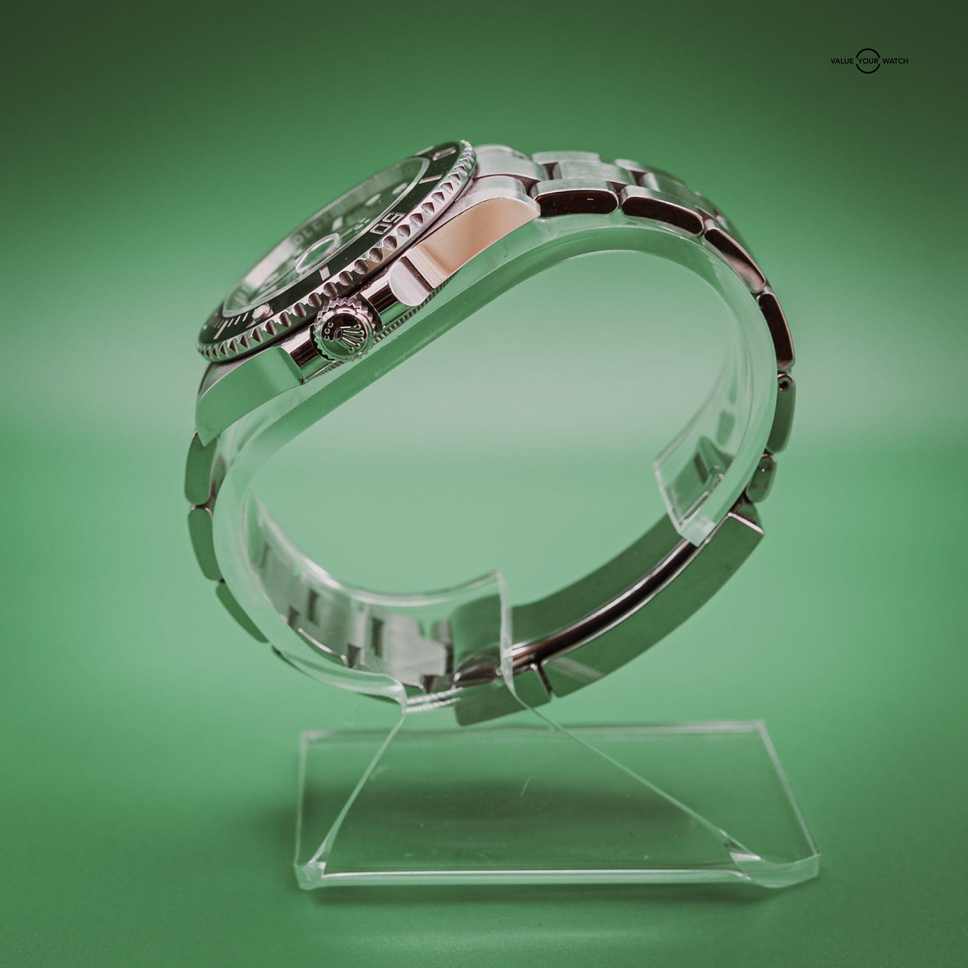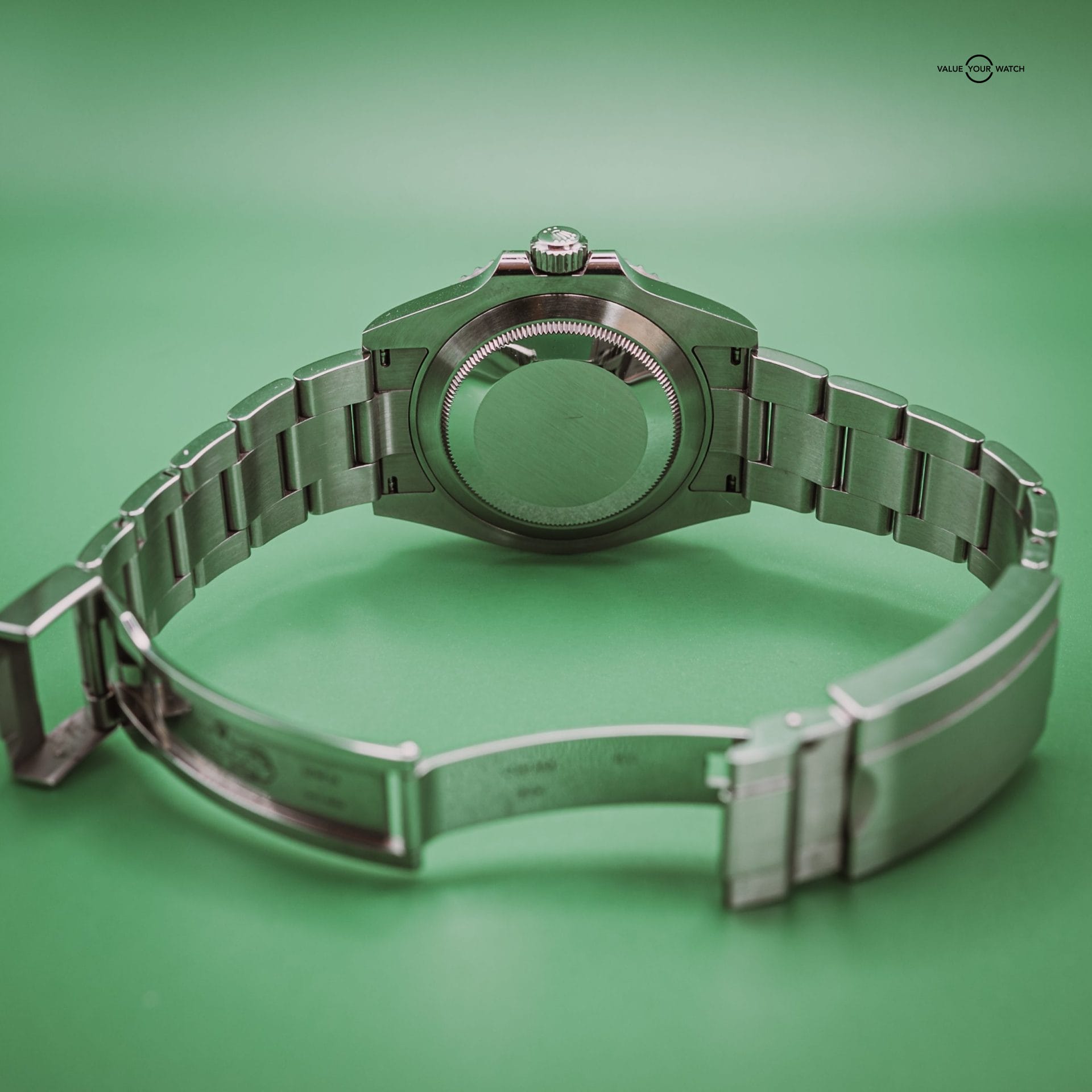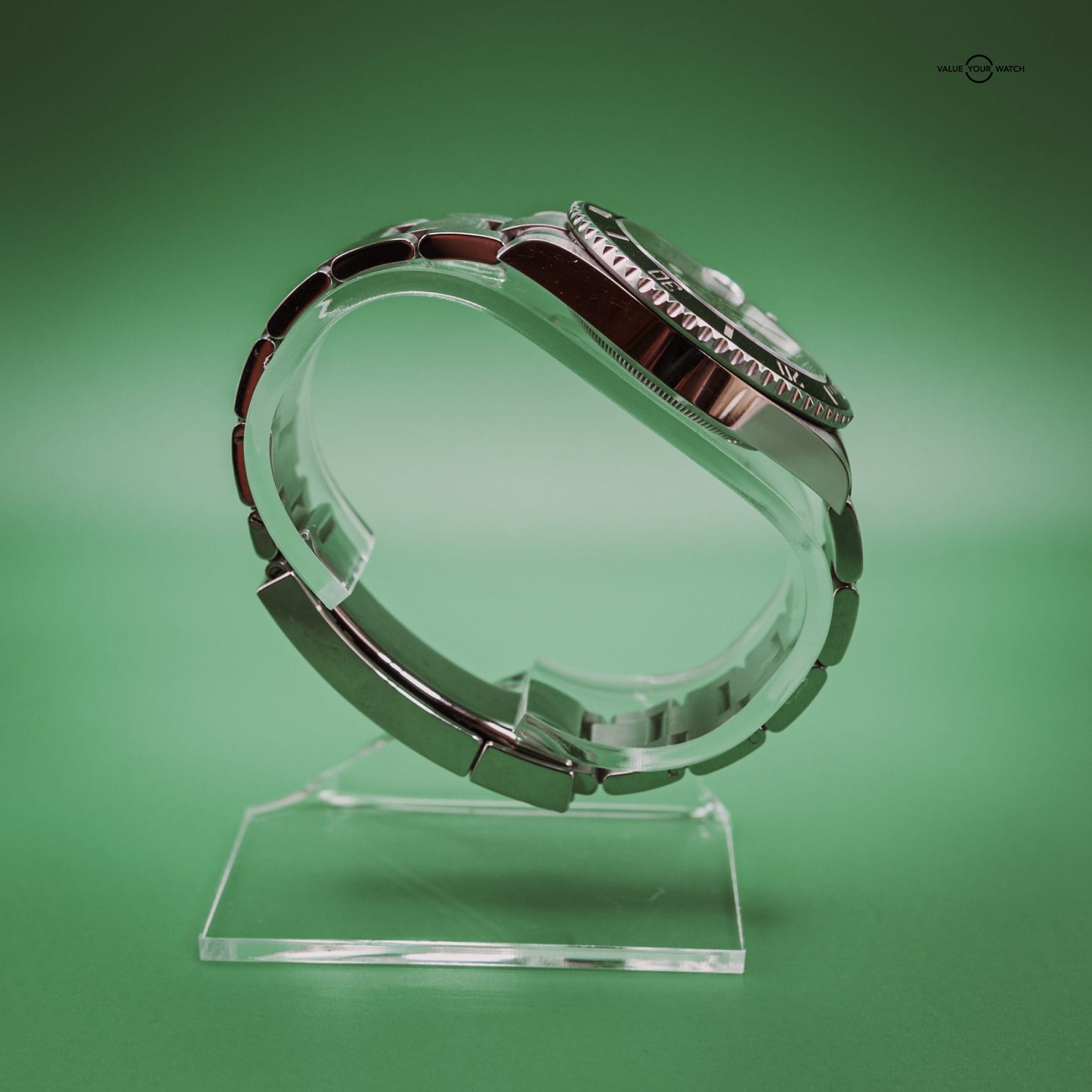 This example is in excellent condition with minimal signs of wear, primarily opening part of the clasp. This includes a full set with inner & outer boxes, white & green tags, booklets, extra links, bezel cover, and warranty card (dated 6/9/2022).