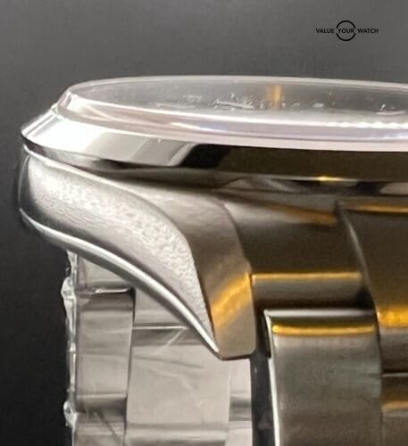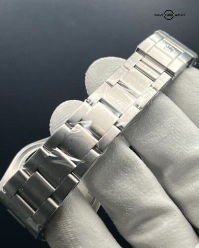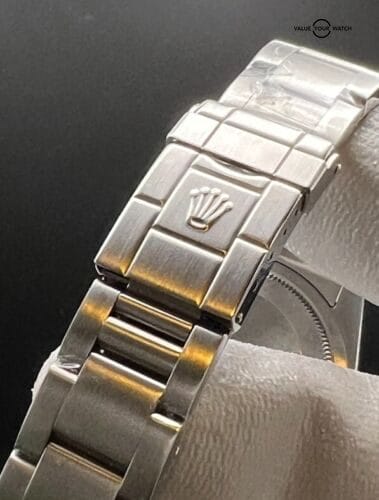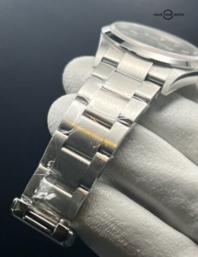 This example of the popular reference 114270 has a no-holes case and solid end-links. I have left the protective plastic on the bracelet since it’s in such a fresh condition. Minor hairline scratches may be observed with the naked eye or with magnification. This piece looks new on the wrist as it has been exceptionally well taken care of.