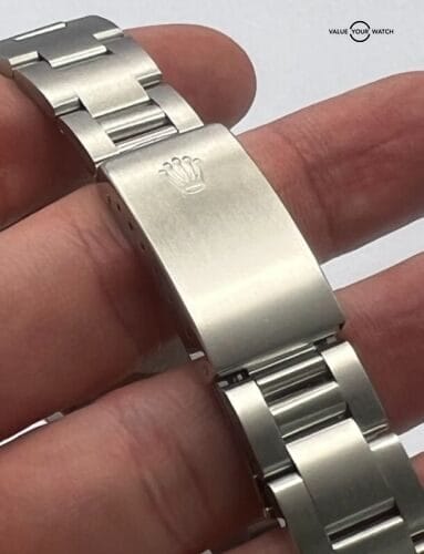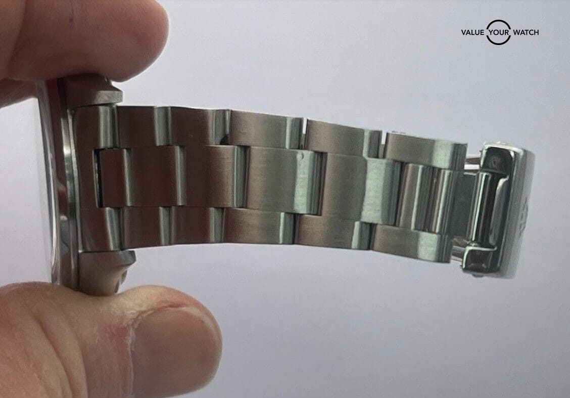 This stunning example retains its sharp 34mm case and the smooth bezel is excellent. The watch was just polished and regulated. The light salmon 3, 6, 9 dial is excellent and looks good as new. The lume has yet to show signs of aging and the hands match perfectly. The 12 link Oyster bracelet is excellent and has very minor stretch. The clasp is stamped with a matching 1995 date code. The watch is running fantastic and is in no need of imminent service.