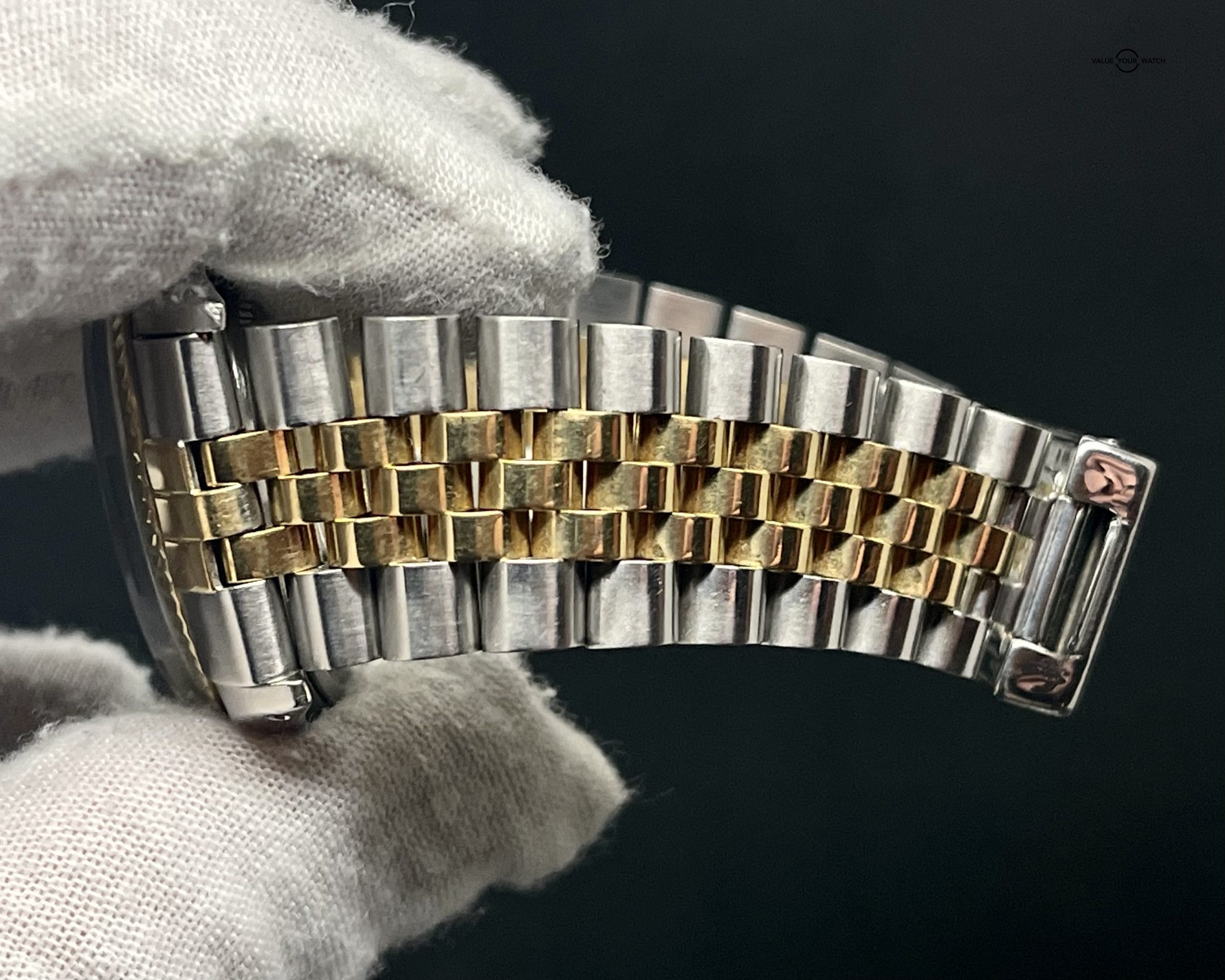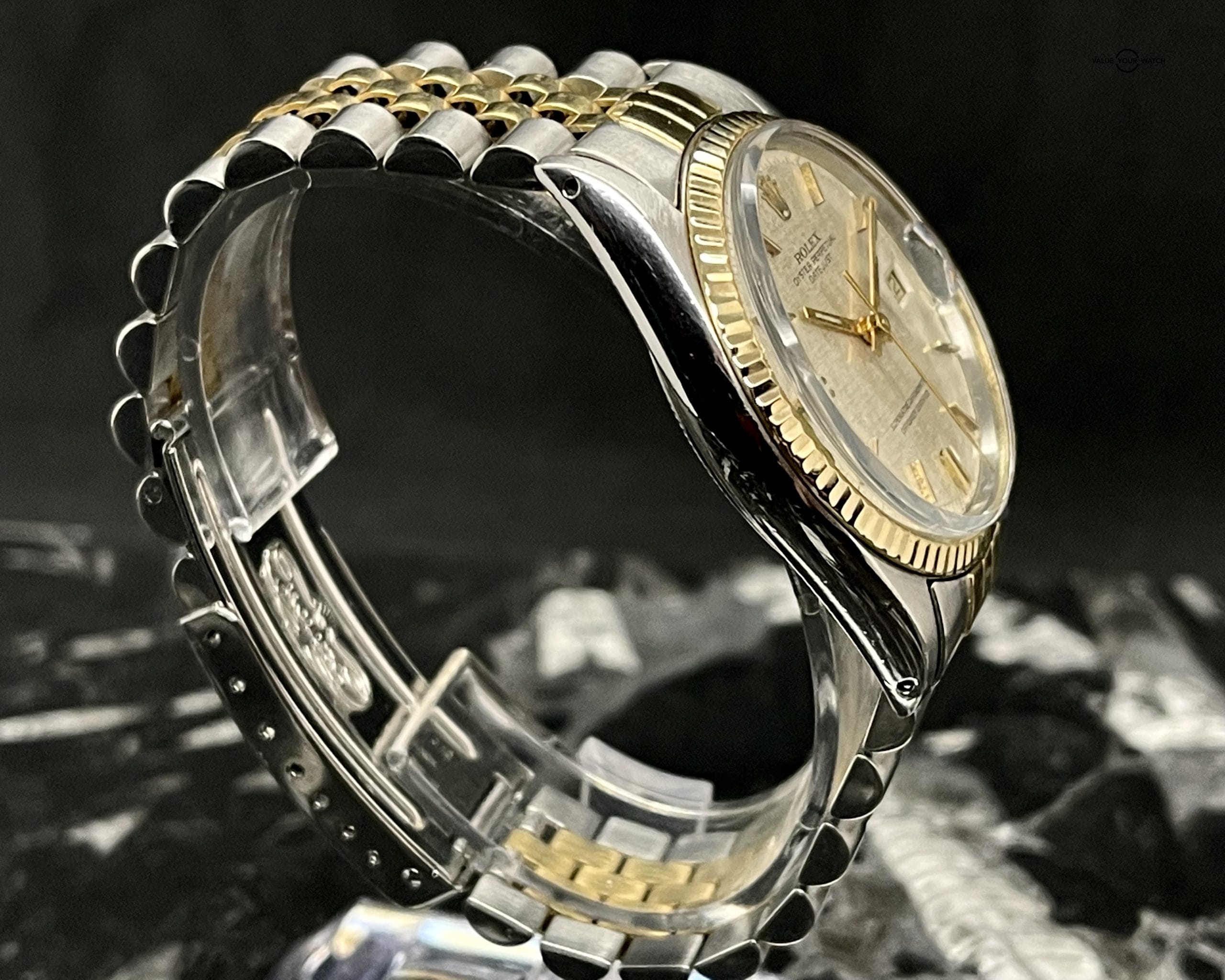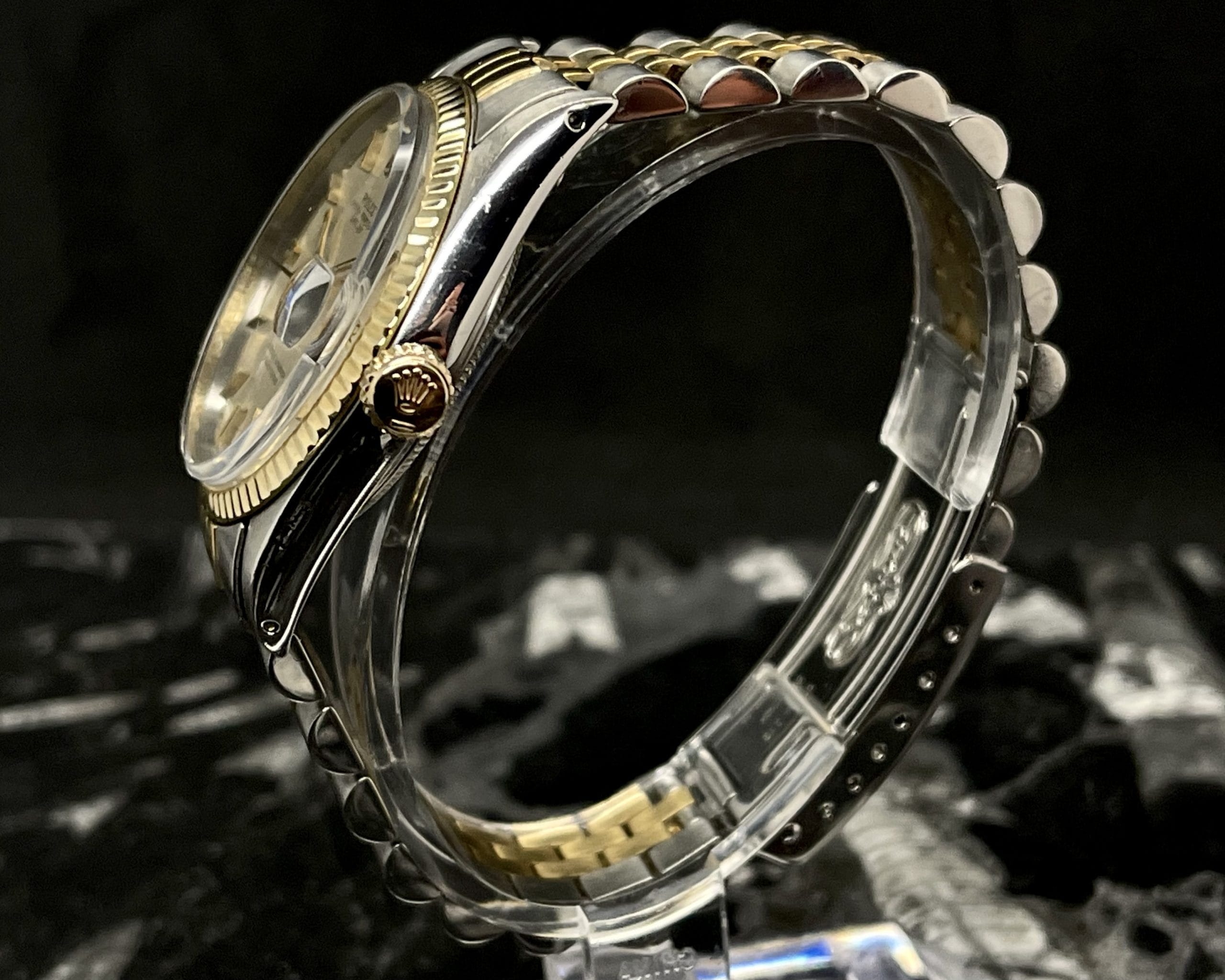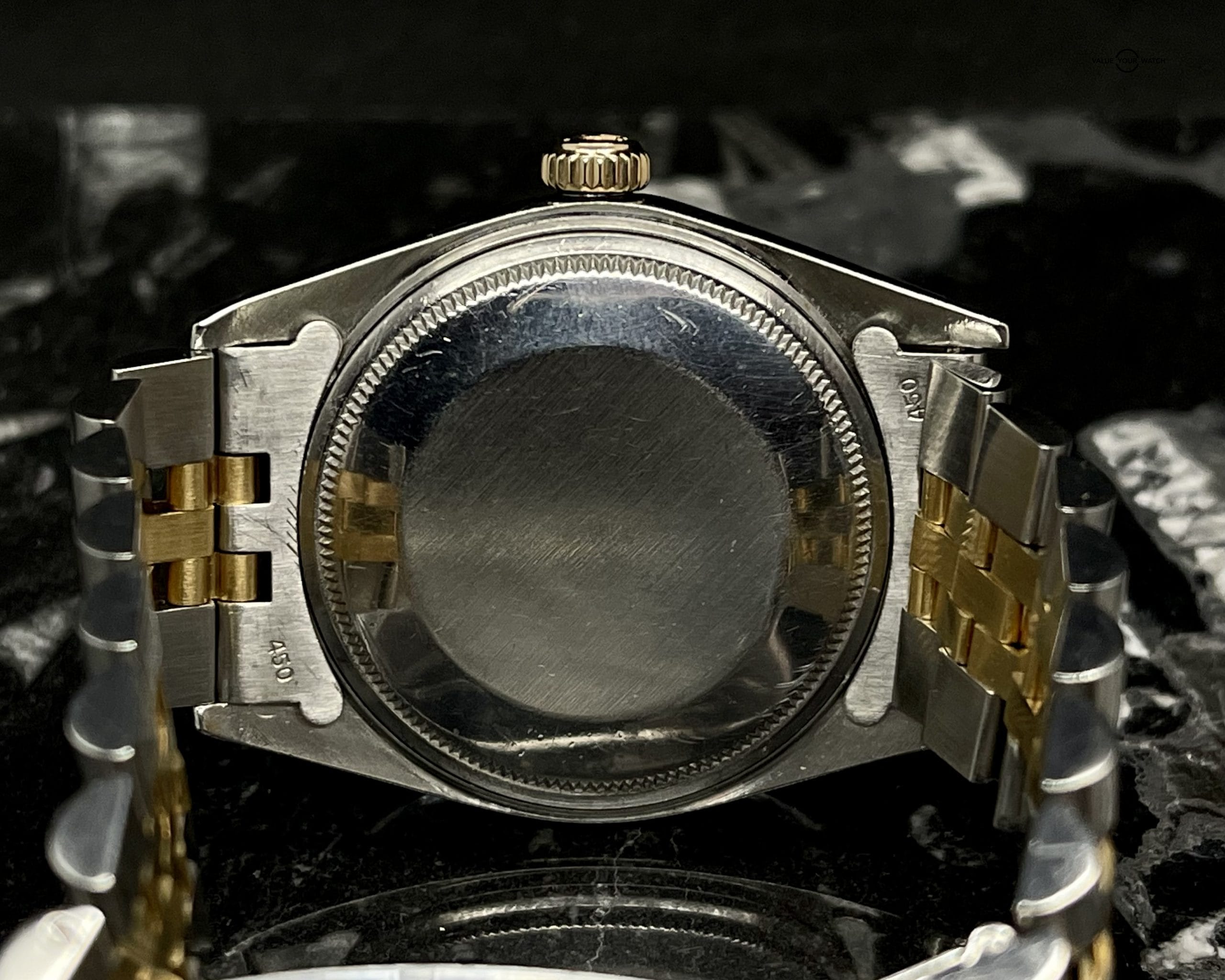 This is a beautiful two tone vintage Rolex for those with a more classic taste. With watches getting so large nowadays it’s always nice to have something smaller and simpler. This watch was recently serviced and has a 7.8” bracelet. The plexiglass in a near perfect condition, the case has minor wear, and the bracelet and clasp have light scratching. Get this beautiful pre-owned time piece before it’s gone!