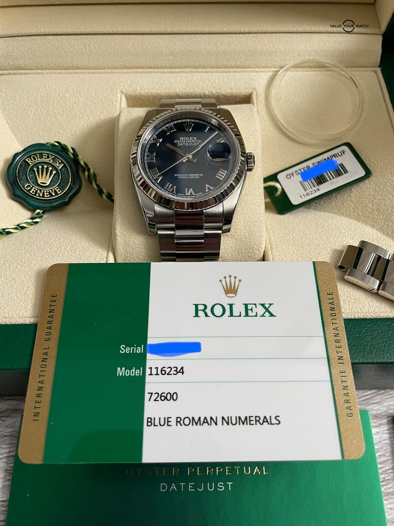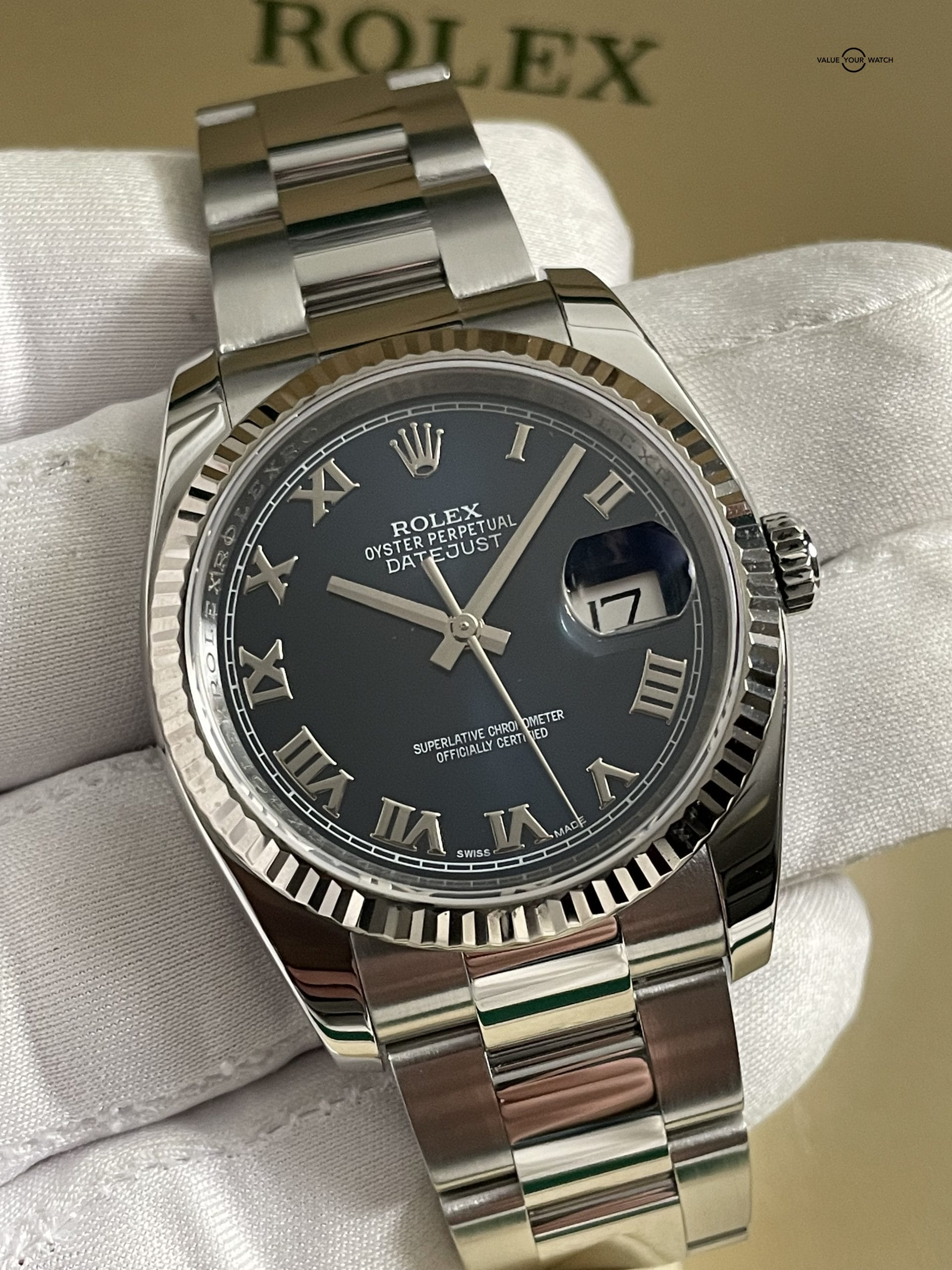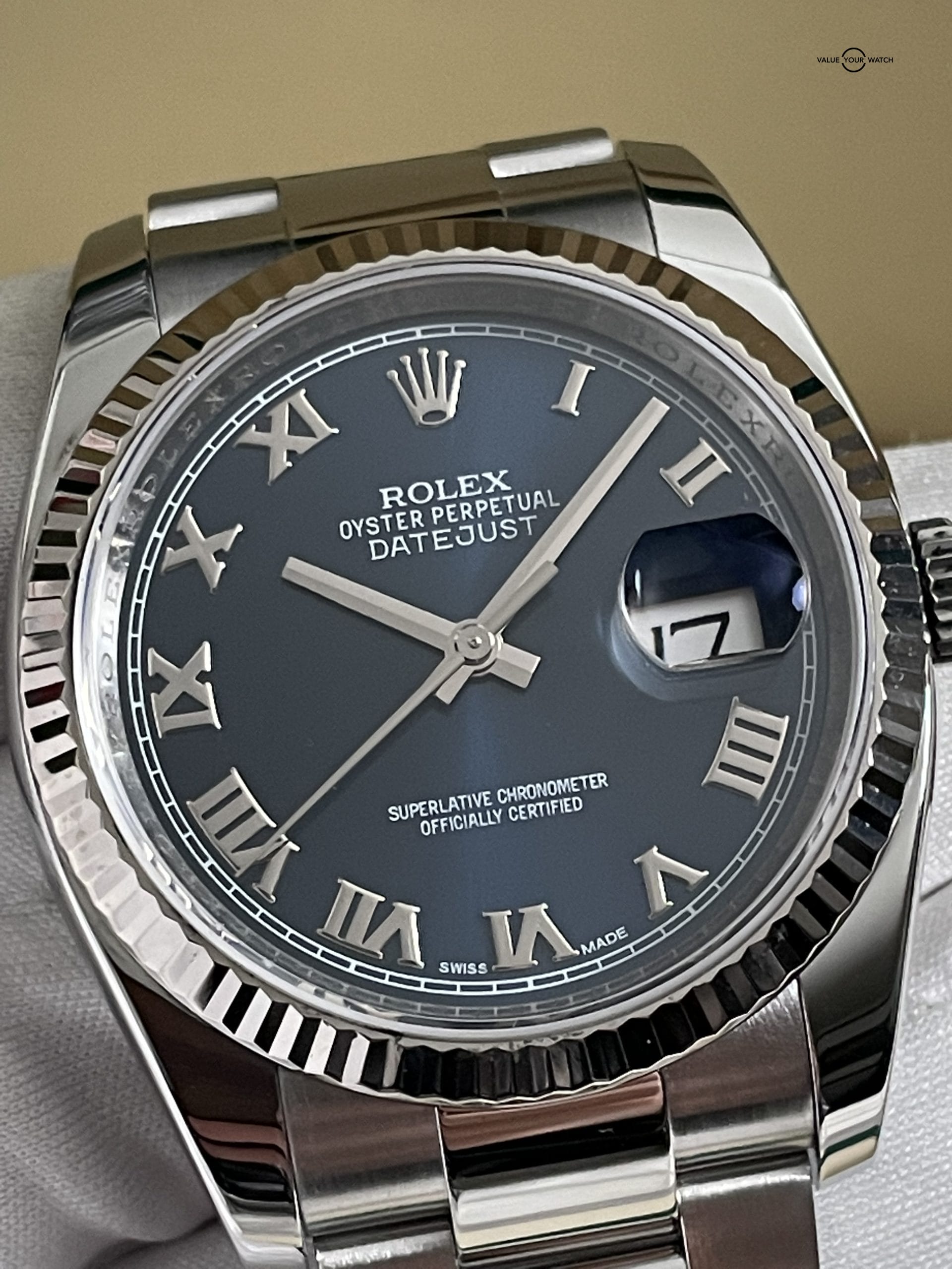 For your consideration is a staple of the Rolex collection for decades, the 36mm DateJust. This particular variant has the highly desirable sunburst blue dial with Roman numerals.