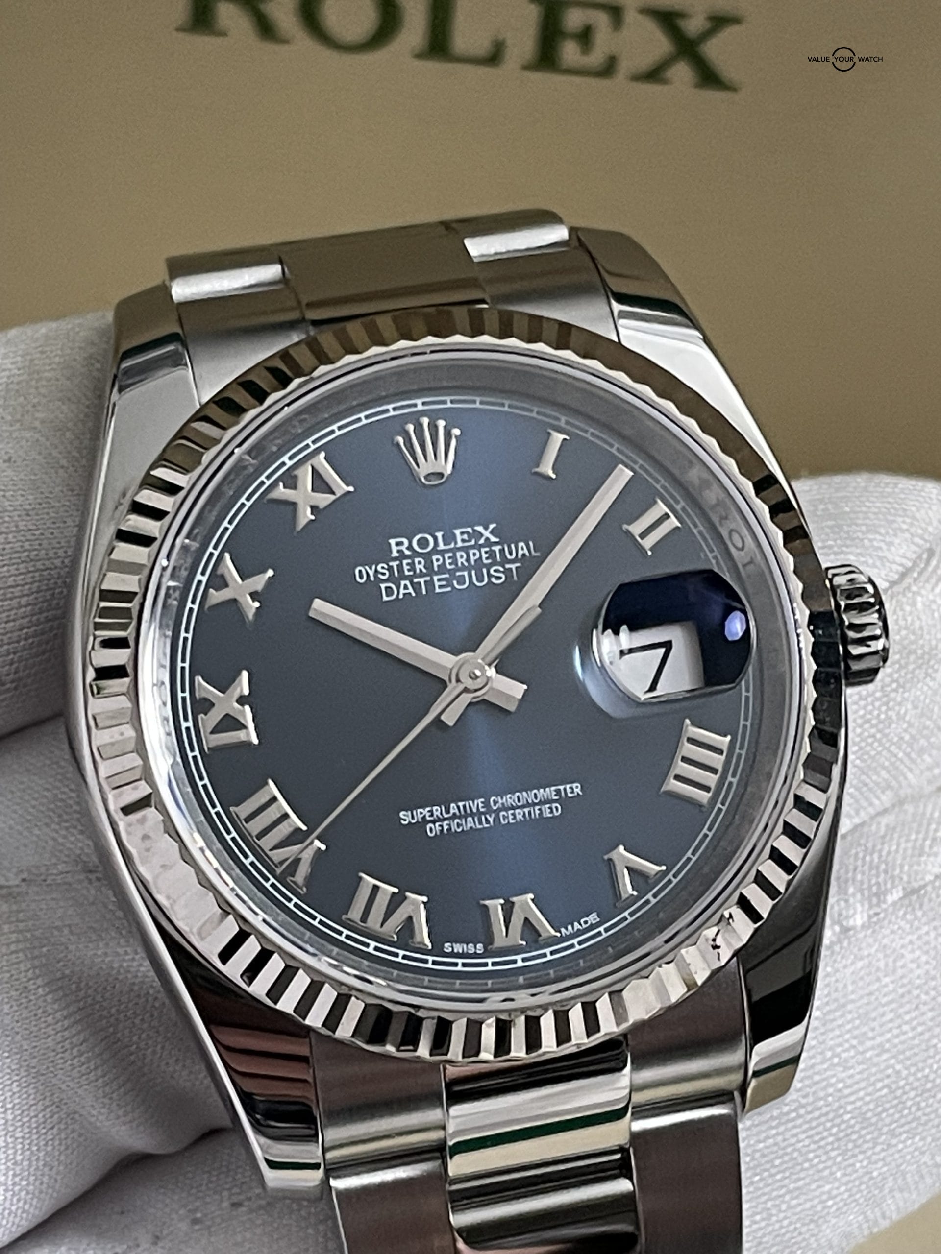 Rolex DateJust 36mm DJ36 Blue Roman Numerals Steel Gold Fluted Bezel – 116234 – 2015 Complete Set!