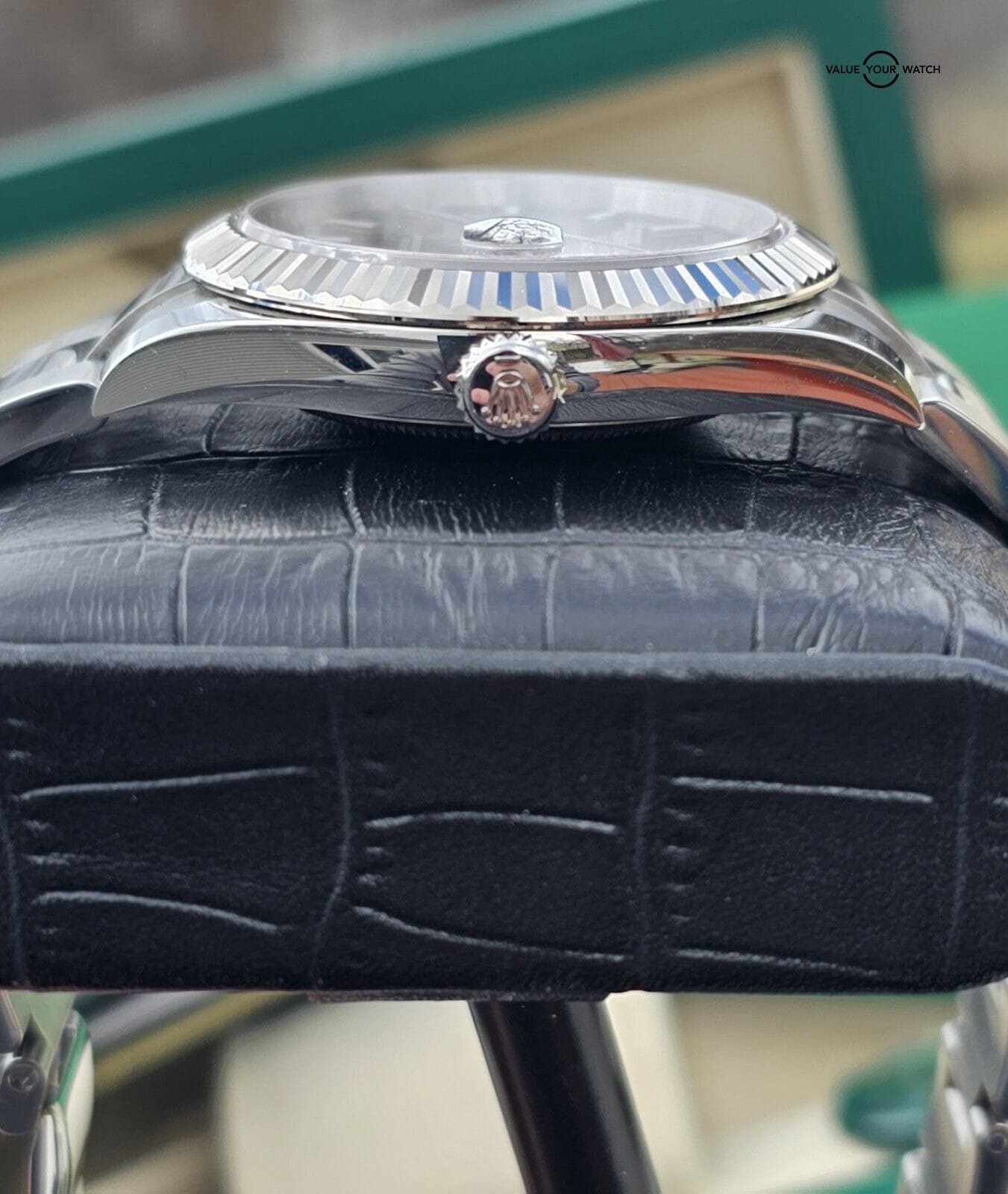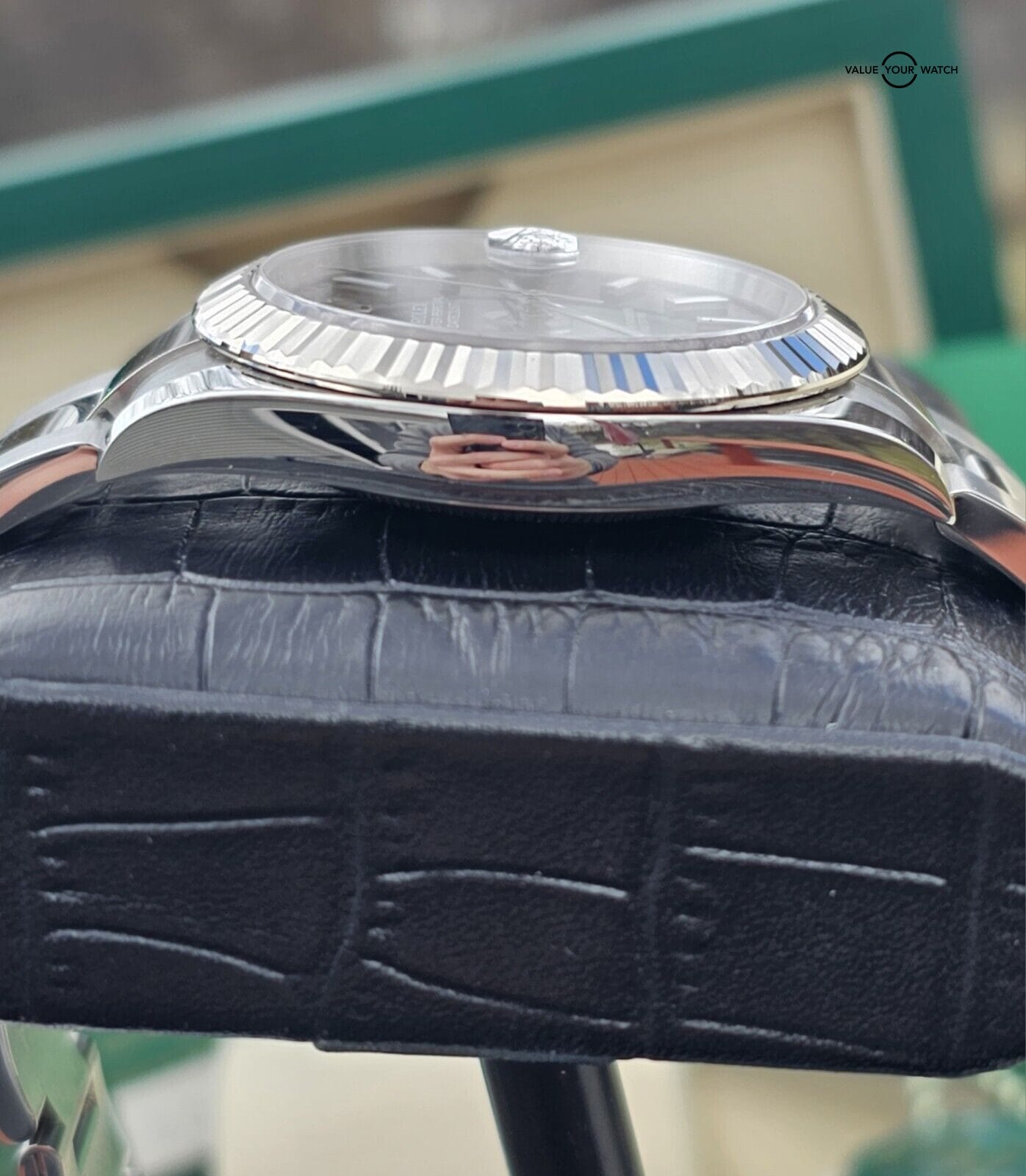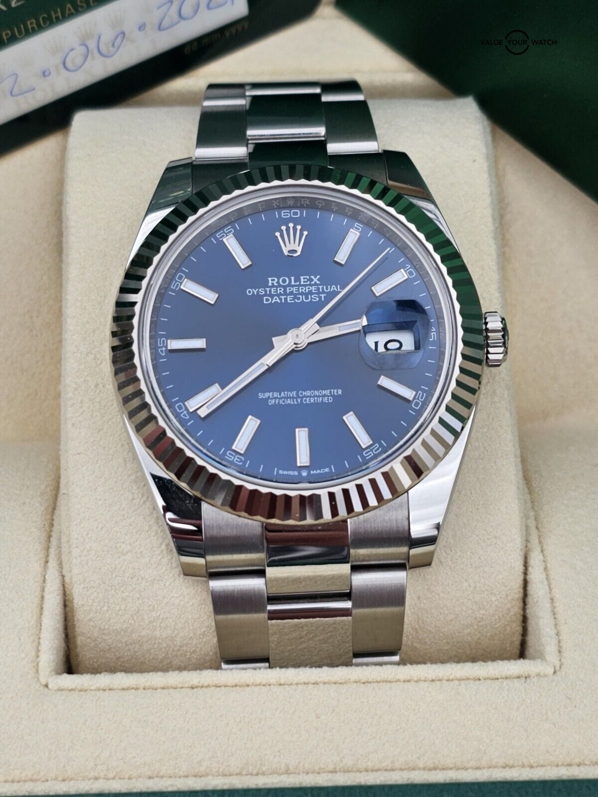 Presenting a stunning Rolex Datejust 41 White Gold Blue Dial Full Set! This Oyster Perpetual Datejust 41 in Oystersteel and white gold features a bright blue dial and an Oyster bracelet with the signature Rolex fluted bezel. The bright blue dial and sunray finish creates delicate light reflections. White Gold is coveted for its luster and nobility. Steel reinforces strength and reliability. Together, they harmoniously combine the best of their properties. Reference 126334 Key Features -White Rolesor- Oystersteel and White Gold -Sunburst Dial -Fluted Bezel -41mm -100 M Water Resistance -70 Hour Power Reserve , Automatic movement -Full Set, Card dated 2021, Booklets, Cards, Double Boxed -Excellent Condition I have many references and additional pictures available upon request! |