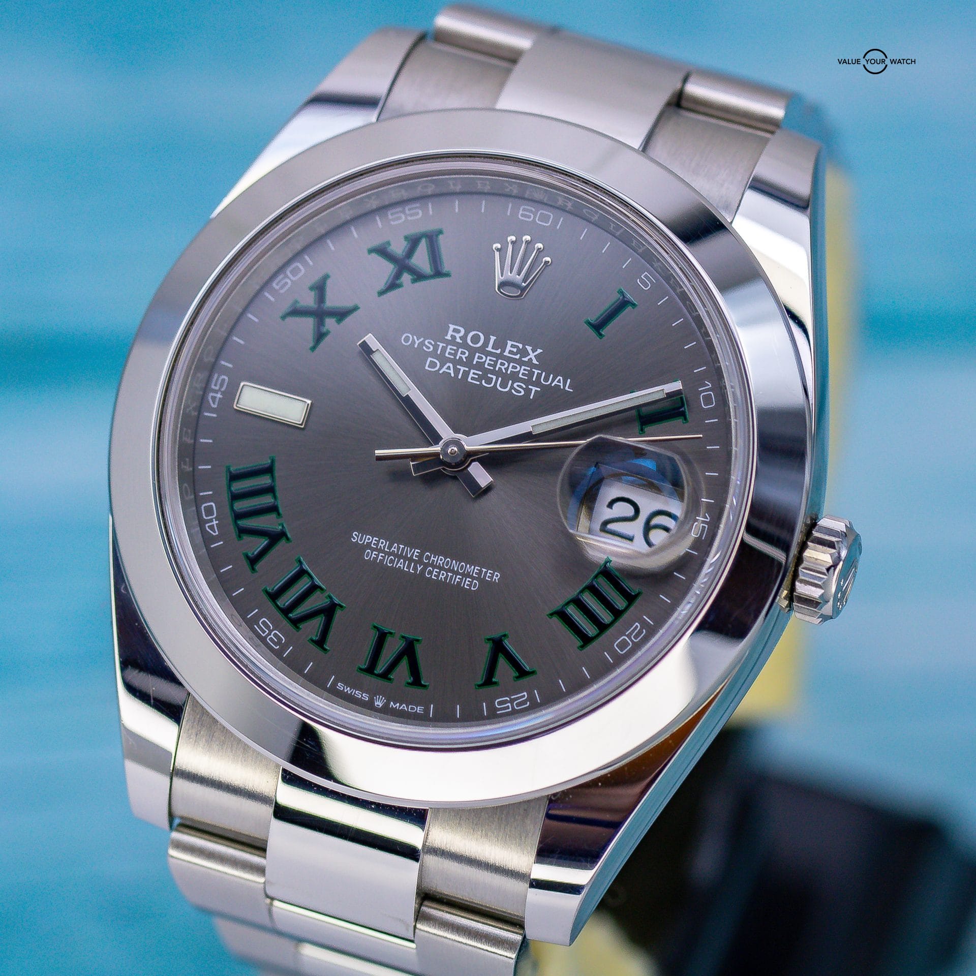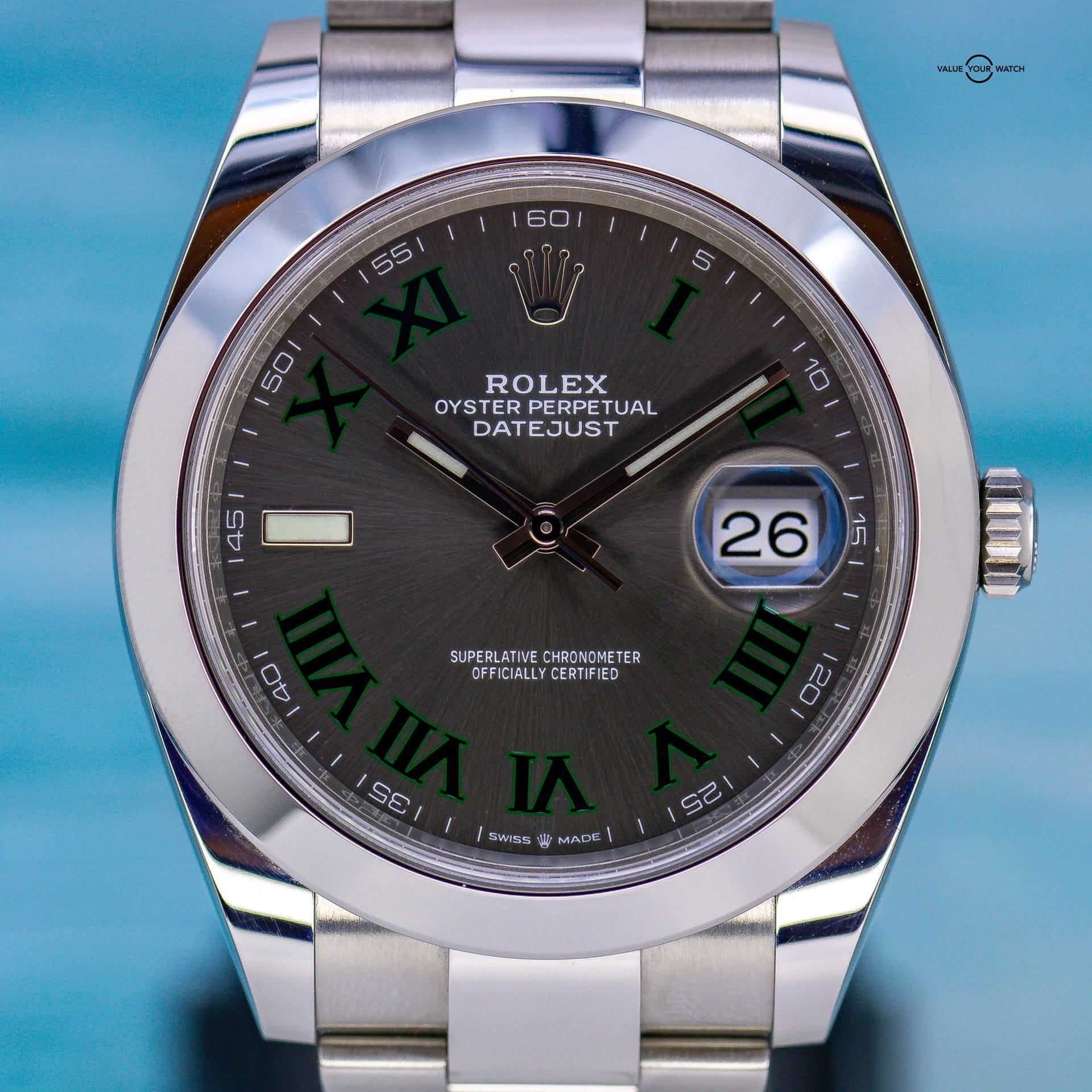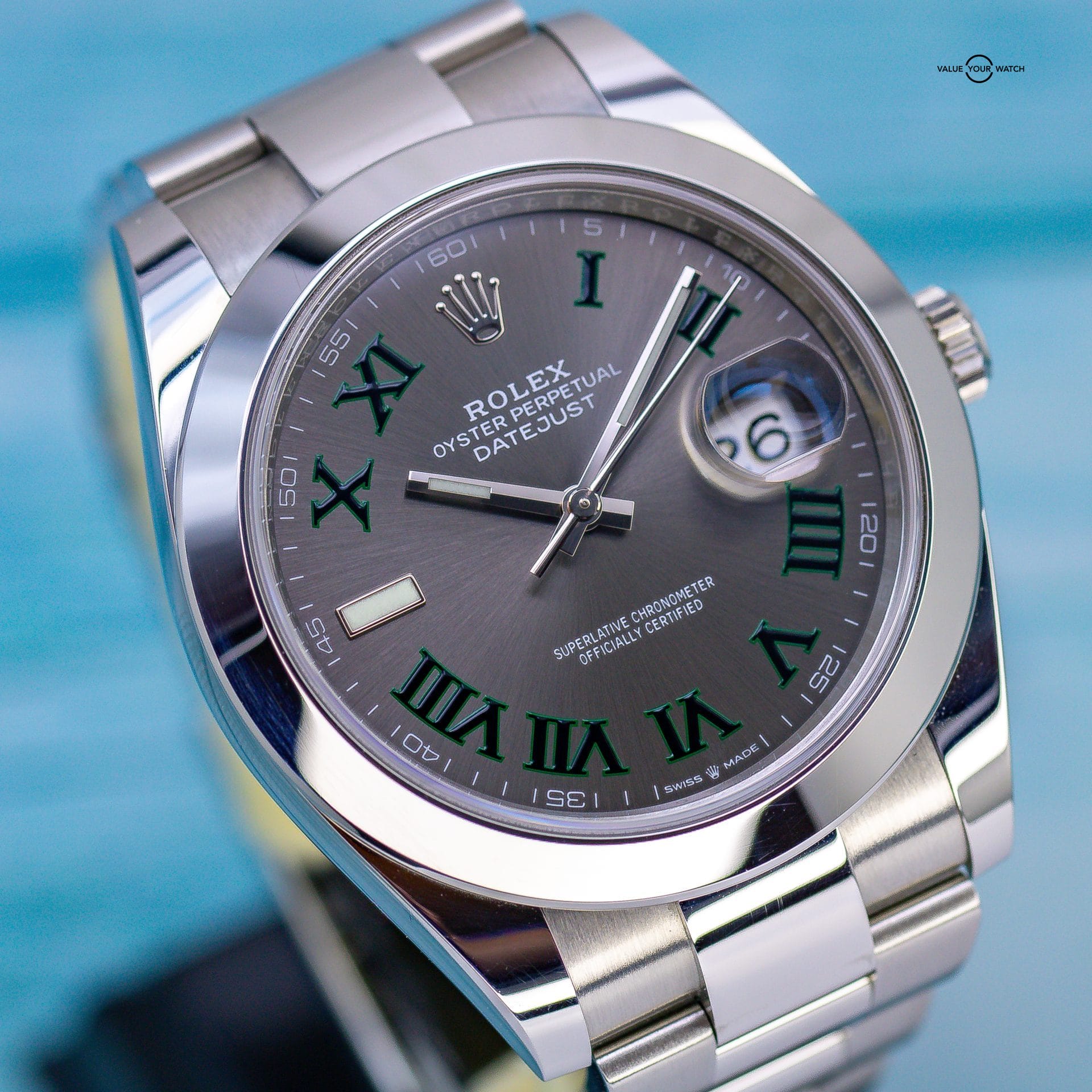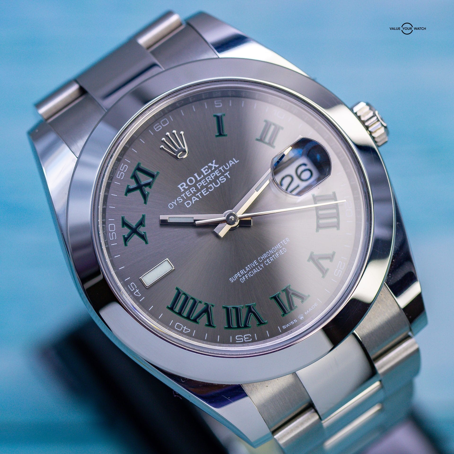 Presenting the Rolex Datejust 41 in its beautiful Wimbledon dial iteration. In 1978, Rolex became the official timekeeper of the Wimbledon Championship. In 2009, Rolex introduced the Wimbledon Dial. Combined with the smooth bezel and Oyster bracelet, this Datejust is altogether sleek, sporty, and timeless.