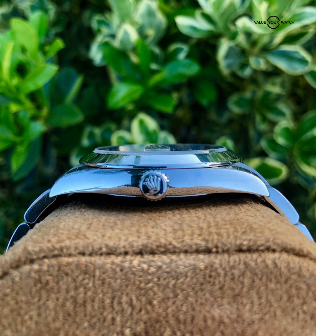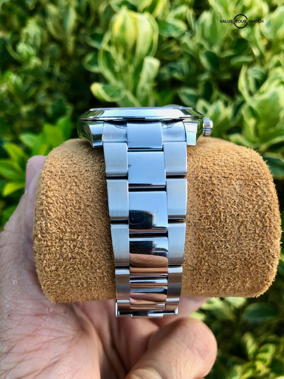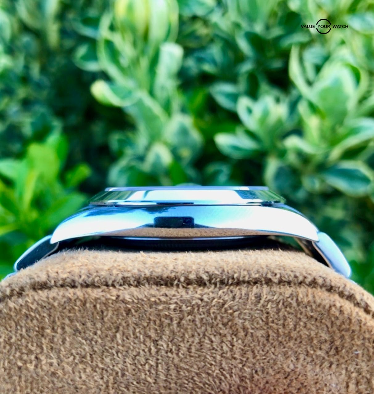 This watch has a stunning slate dial with black Roman numerals & a stunning green shadow, commonly referred to as the Wimbledon dial. The case is in exceptional cosmetic condition, with no signs of use & partial stickers still remaining from the dealer. The sapphire crystal is clear & free of scratches.