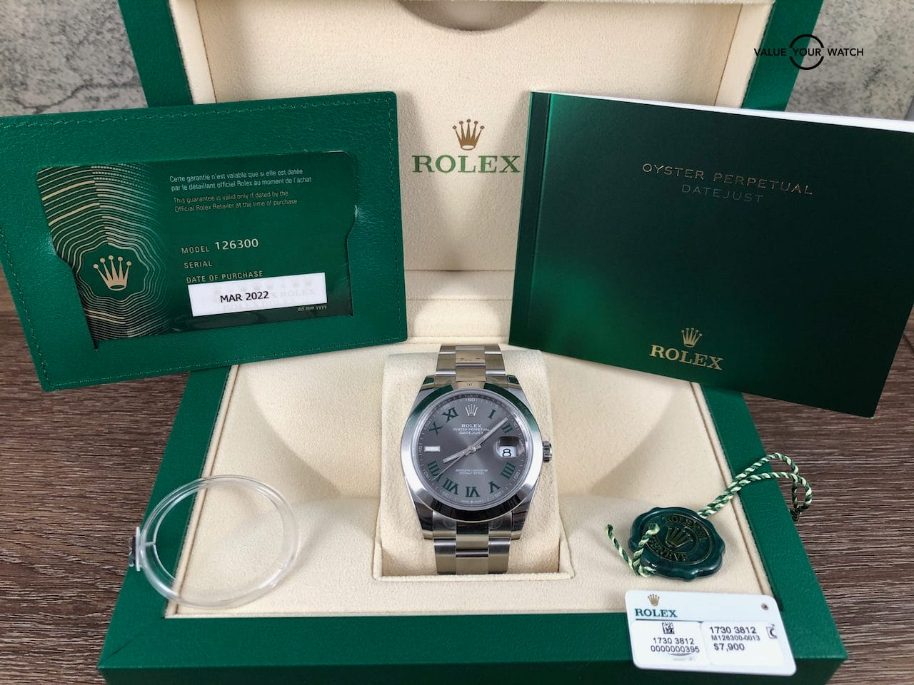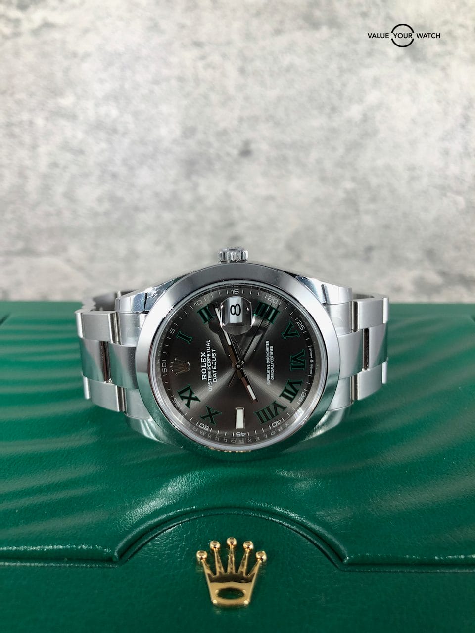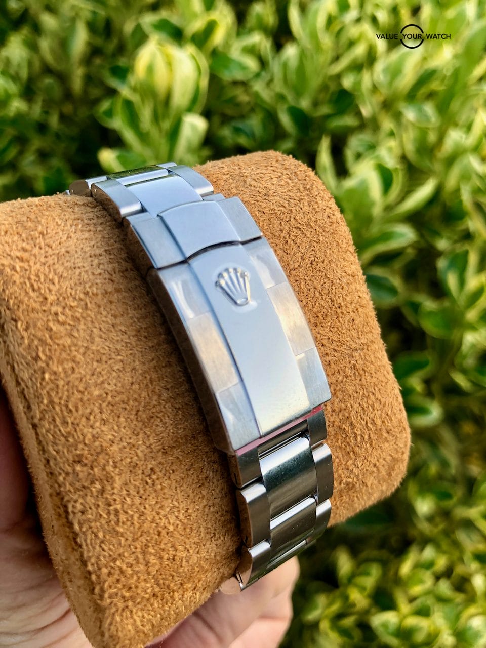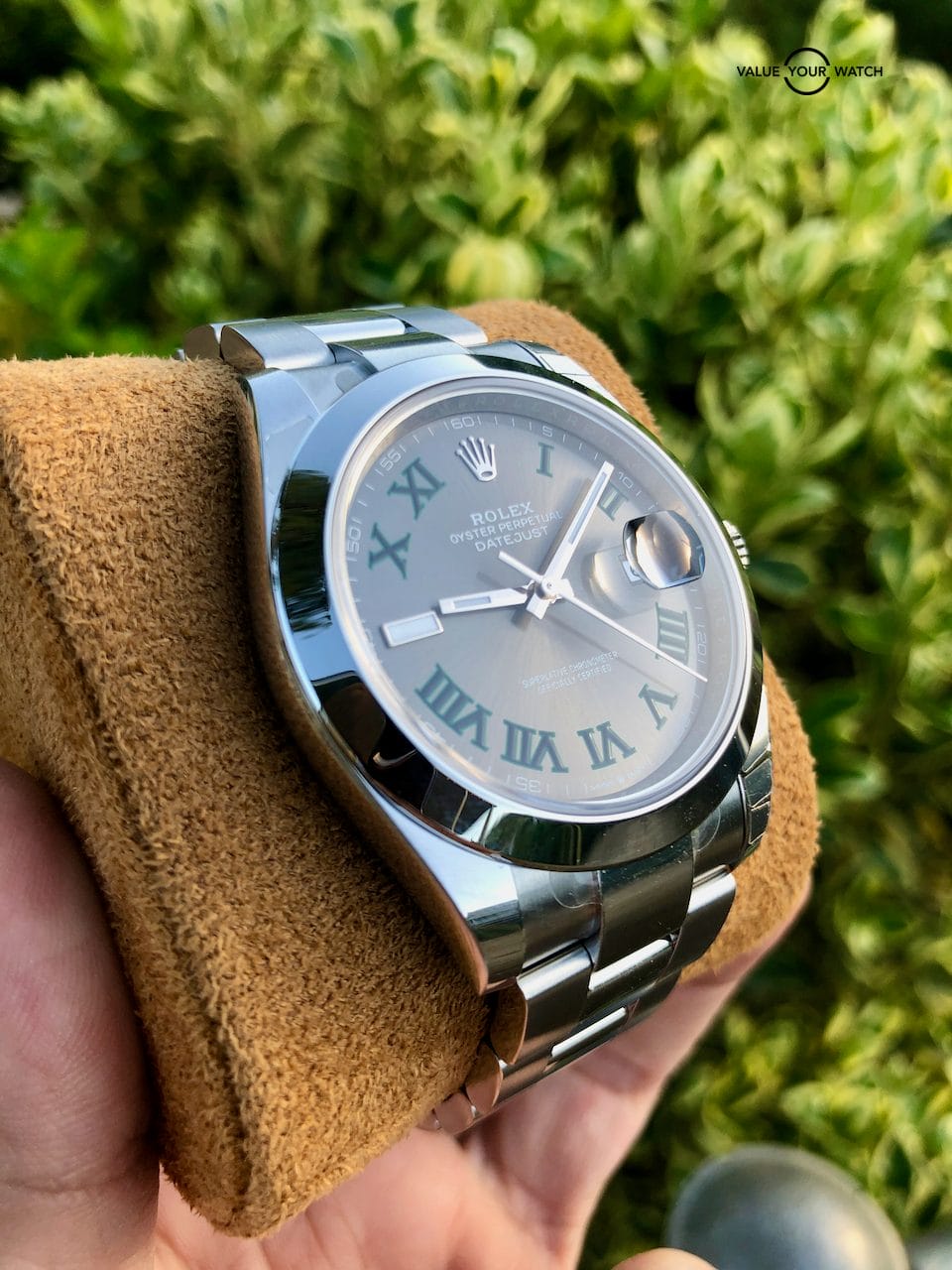 This watch has a stunning slate dial with black Roman numerals & a stunning green shadow, commonly referred to as the Wimbledon dial. The case is in exceptional cosmetic condition, with no signs of use & partial stickers still remaining from the dealer. The sapphire crystal is clear & free of scratches.