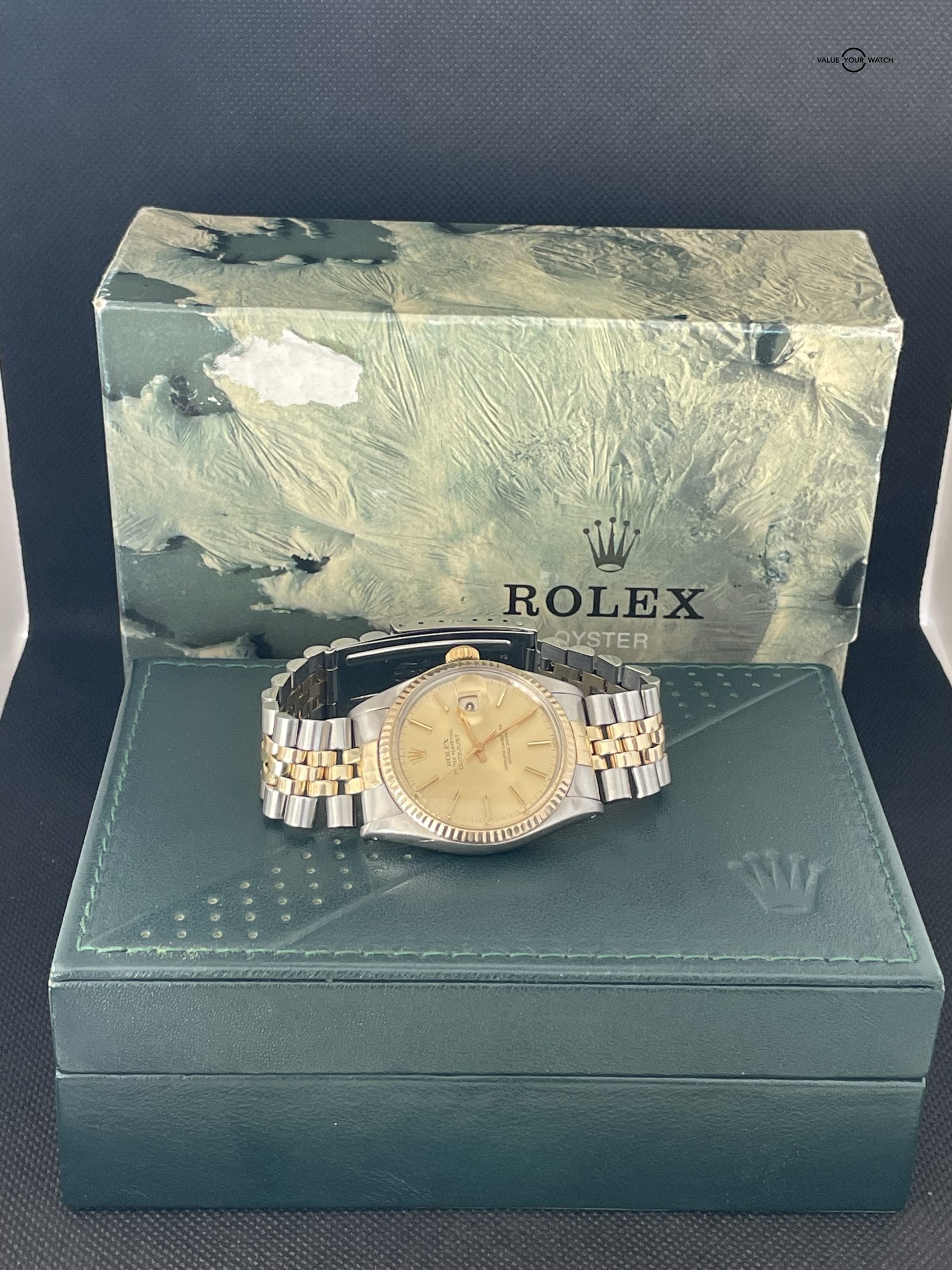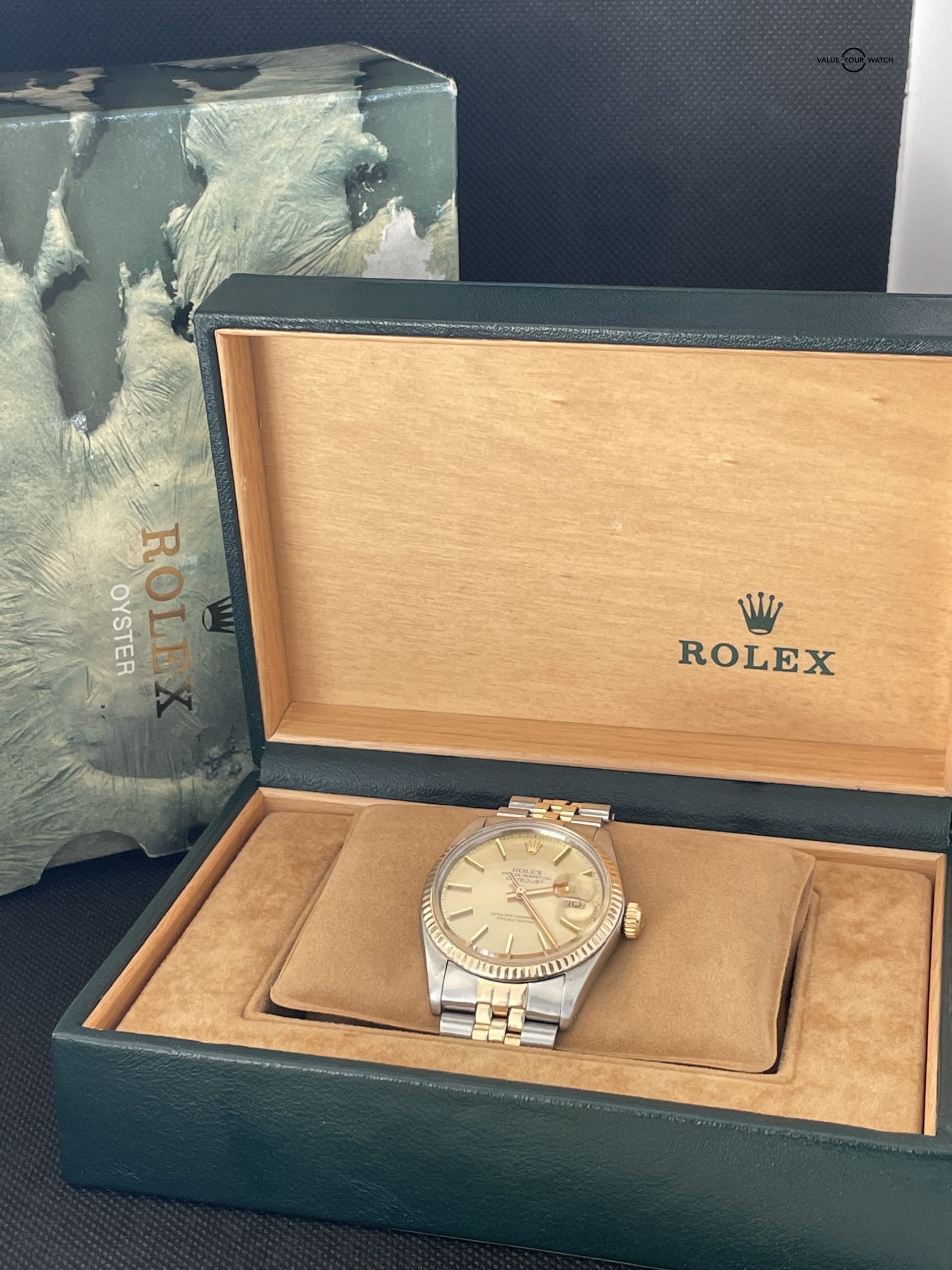 Beautiful Vintage Two-Tone Rolex with a champagne dial dated back to 1981 with a 18k gold Fluted bezel. Nice clean acrylic crystal with no marks. The watch is keeping excellent time for is year on the Timegrapher and come with is original box (inner and other).