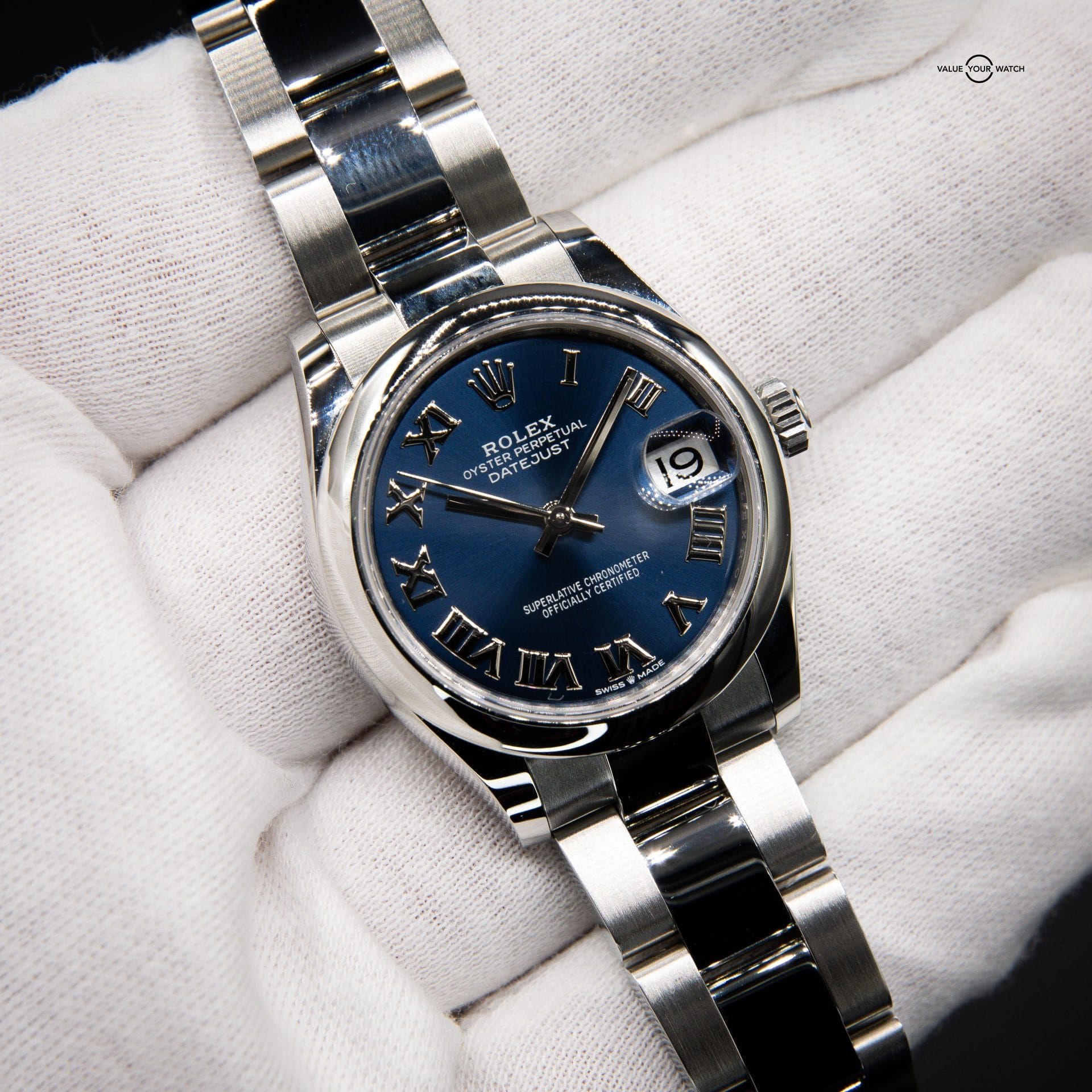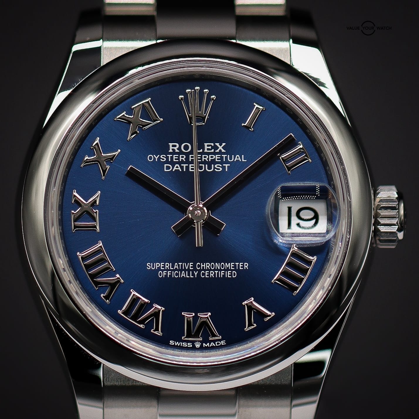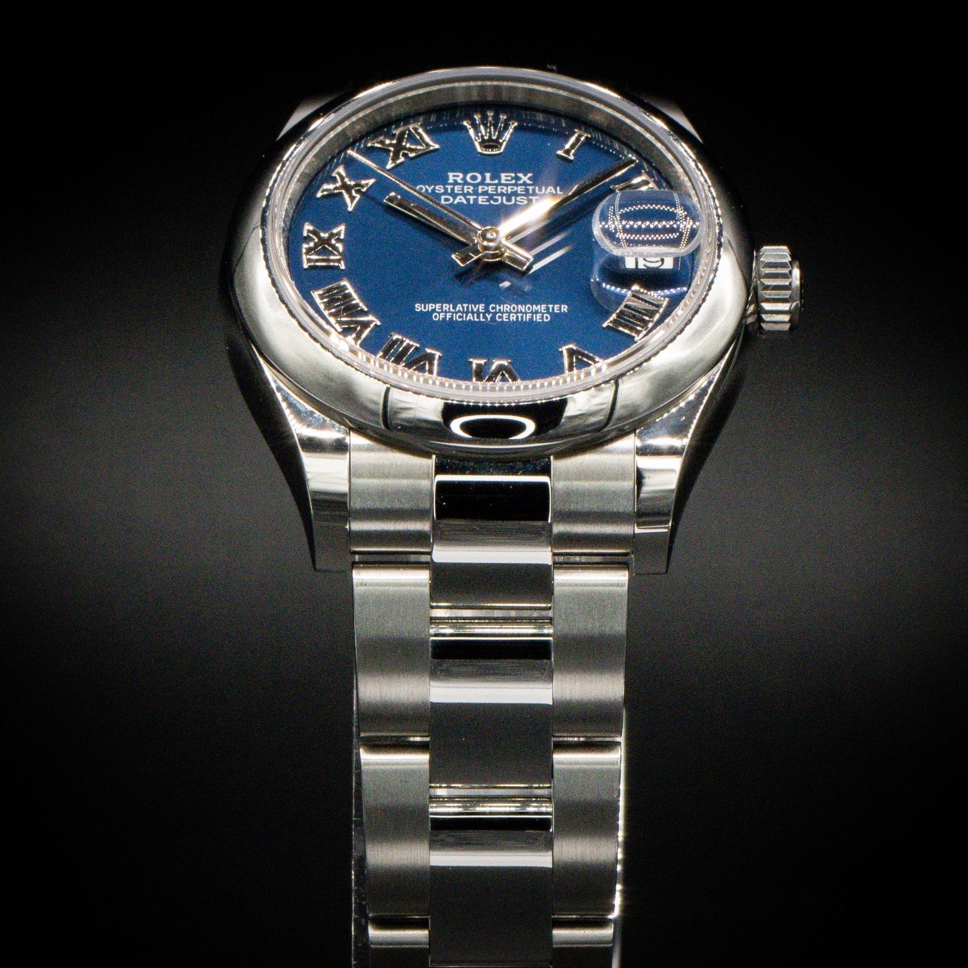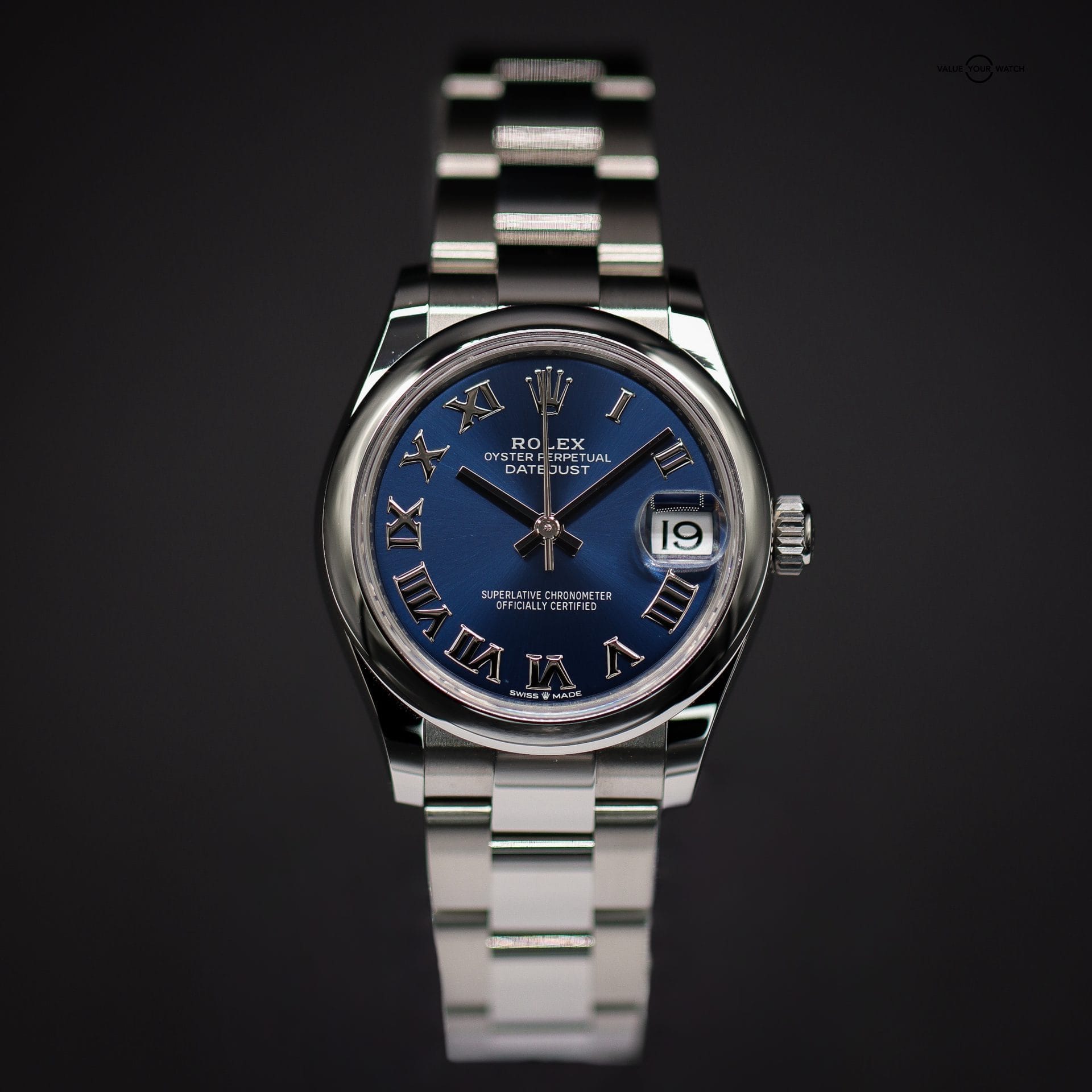 The Datejust 31 (278240) is revered for its timeless design and practicality. Featuring a sunray blue dial with Roman numerals and silver hands, it includes a magnified date display at 3 o’clock for both functionality and elegance.