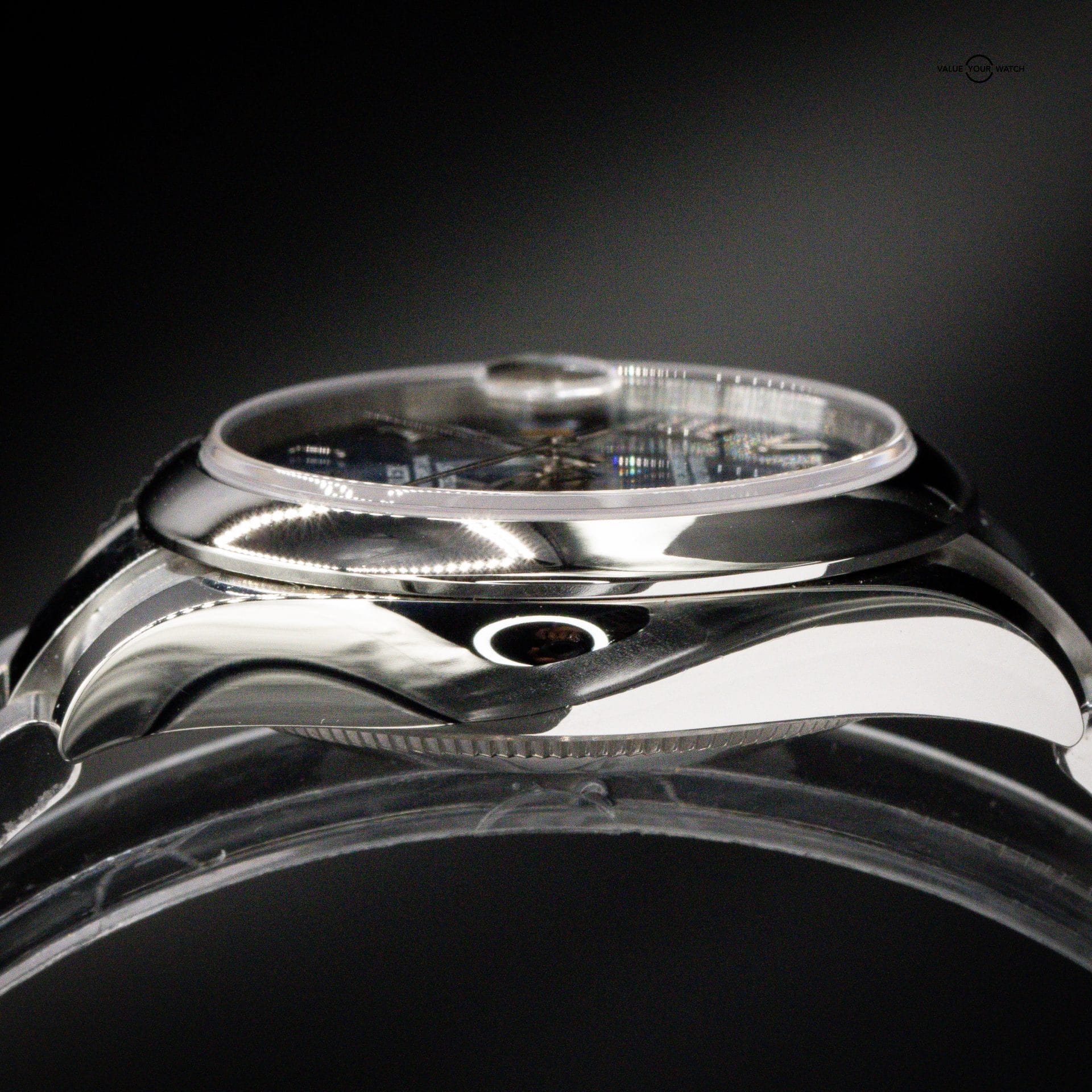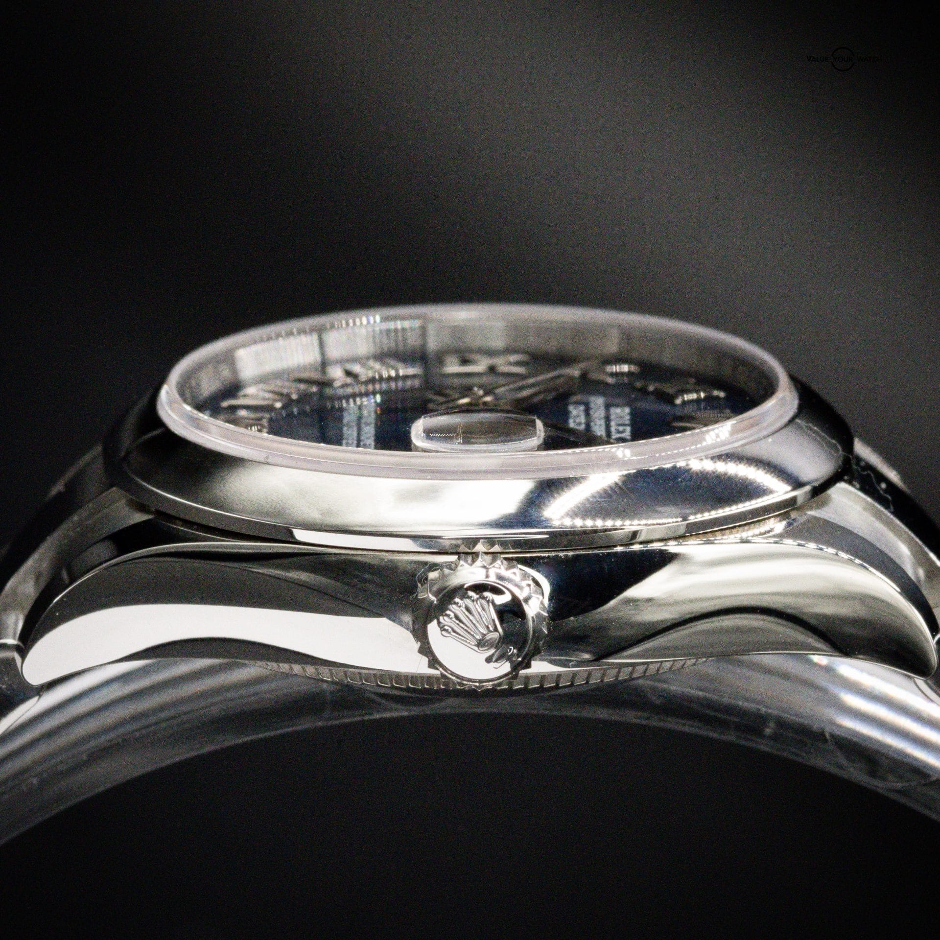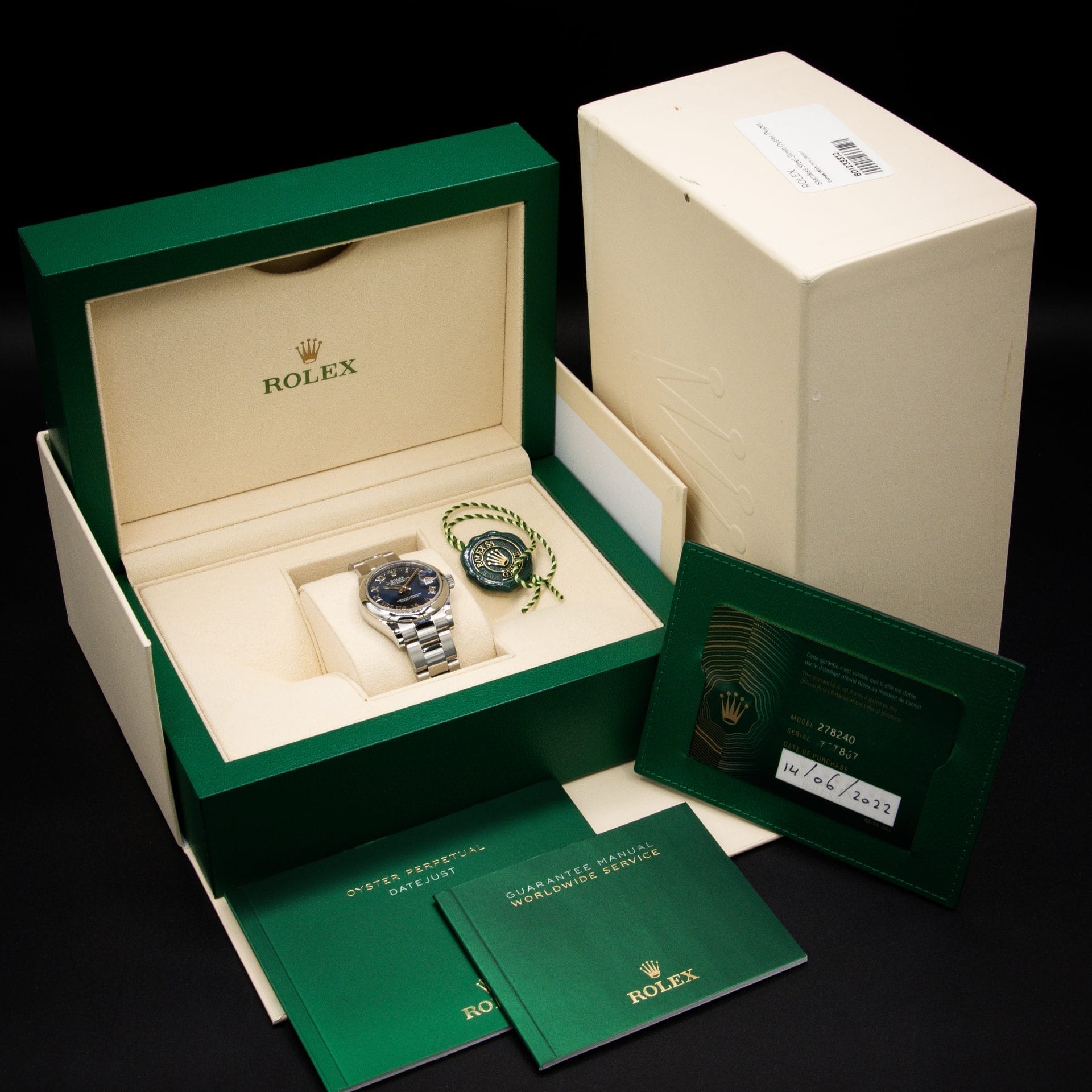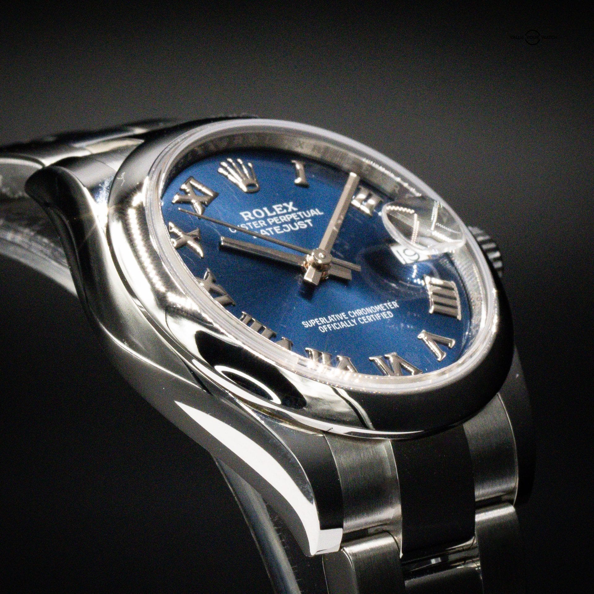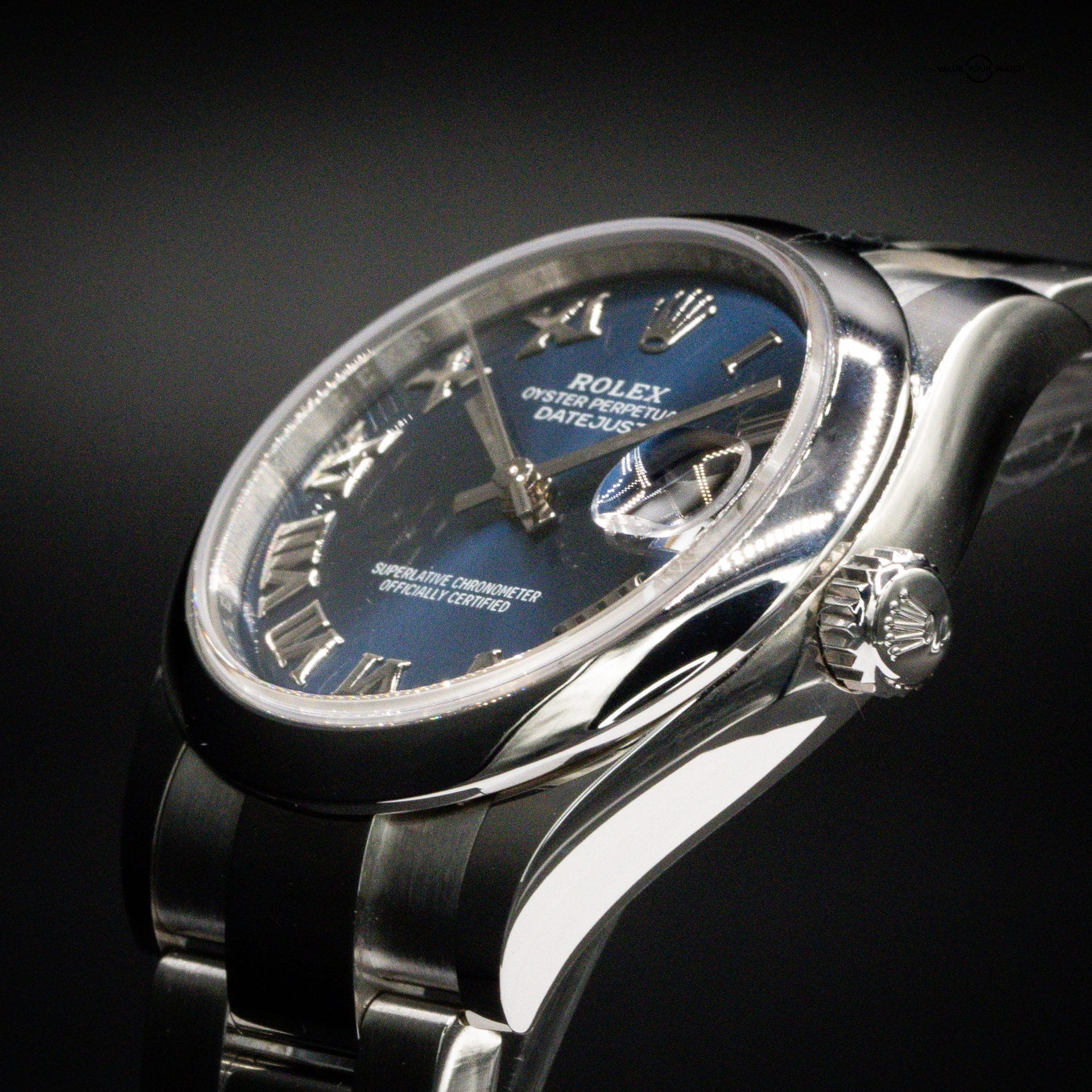 The Datejust 31 (278240) is revered for its timeless design and practicality. Featuring a sunray blue dial with Roman numerals and silver hands, it includes a magnified date display at 3 o’clock for both functionality and elegance.