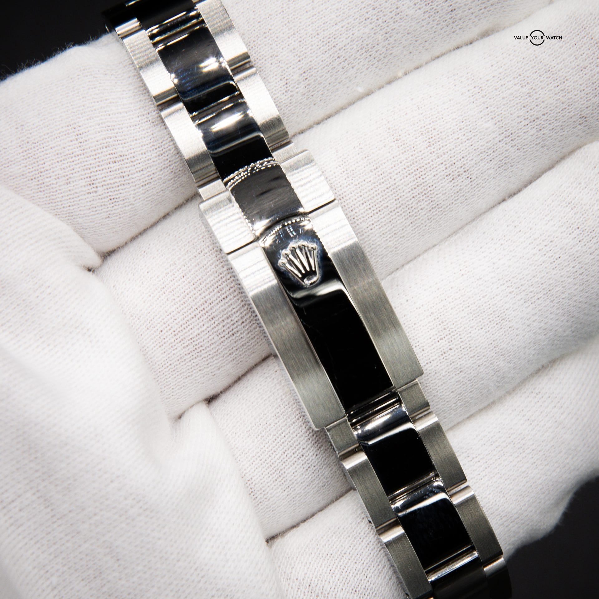 This watch is in excellent condition, showing only slight wear on the bracelet. It’s featured as a complete set including inner and outer boxes, a green tag, booklets, and warranty card dated June 14th, 2022.