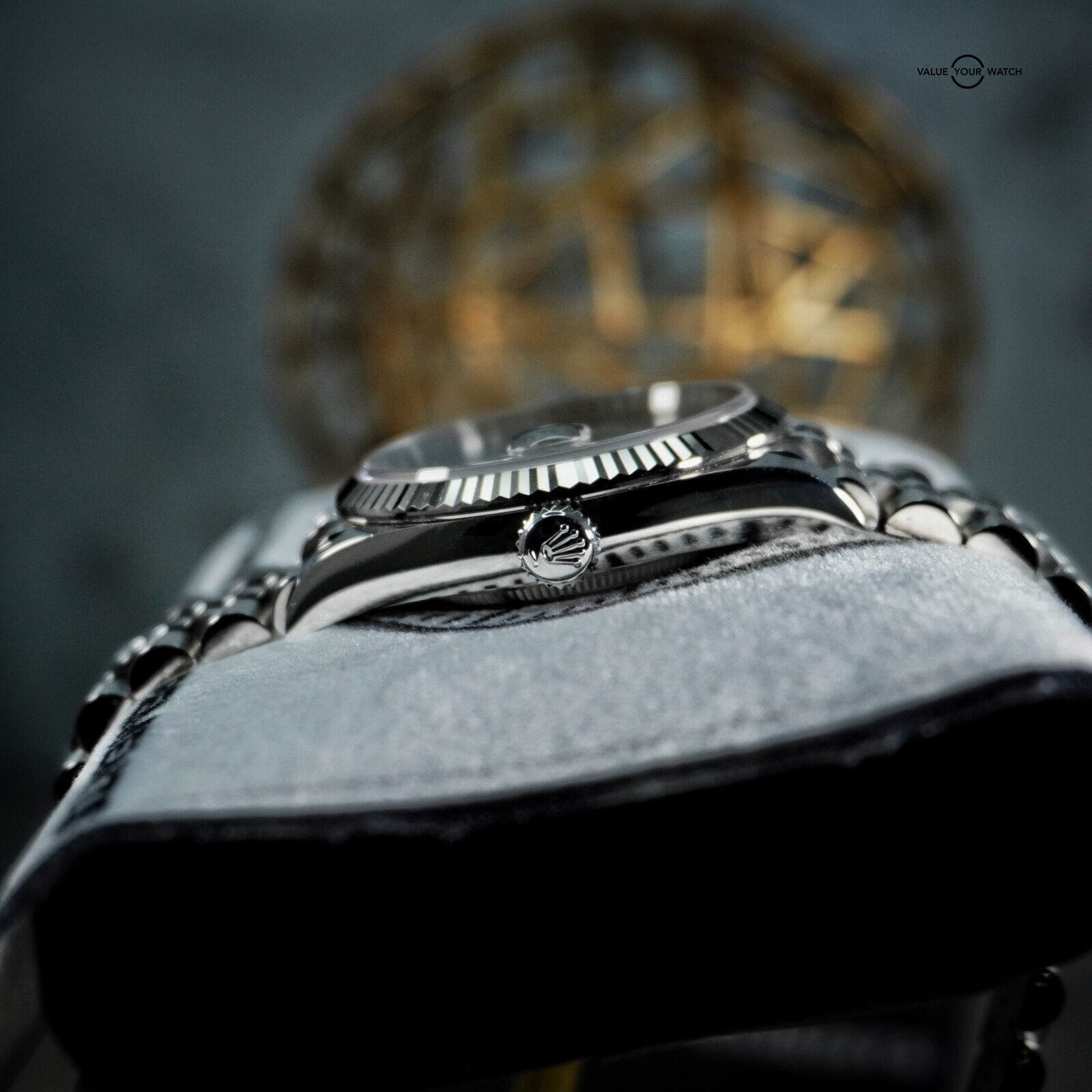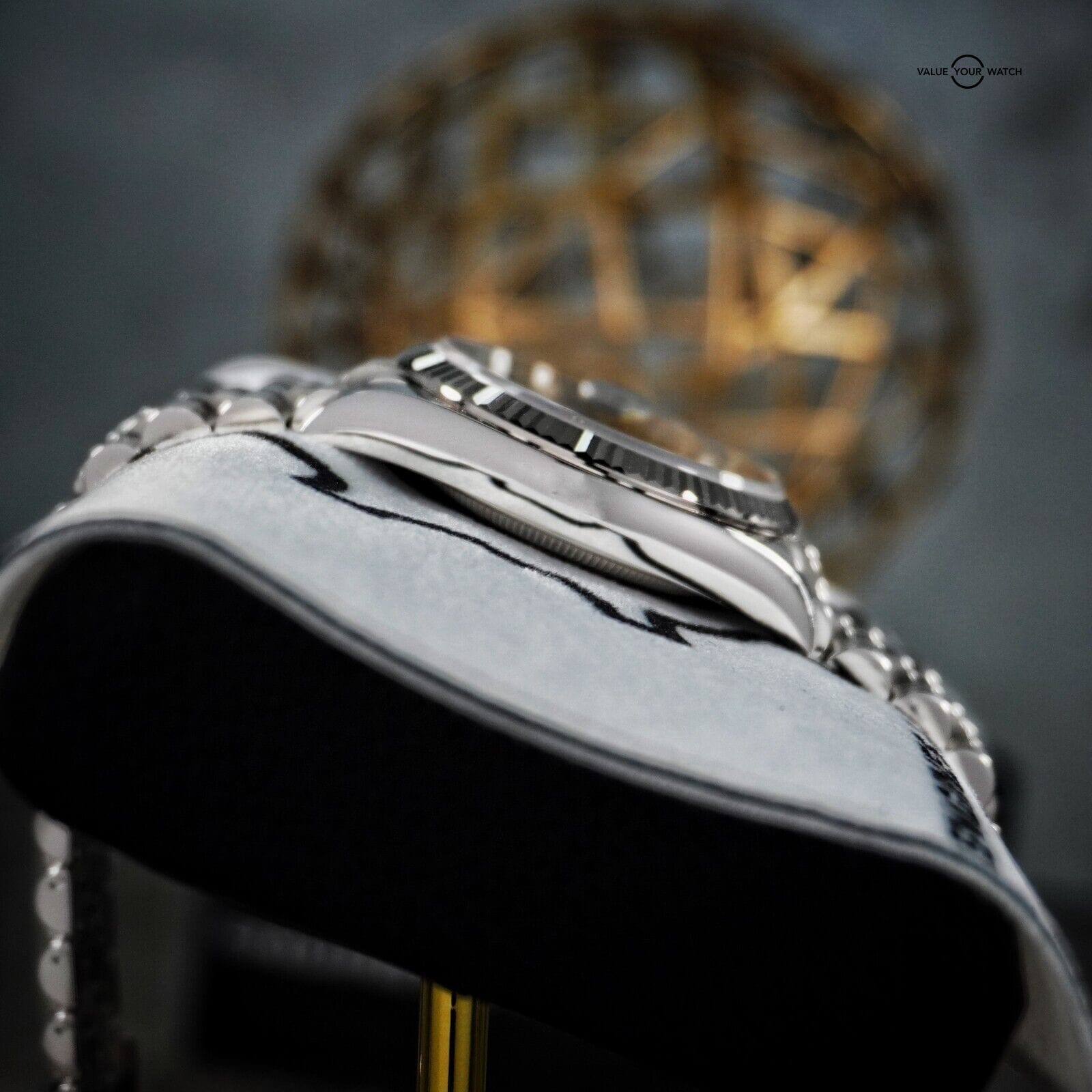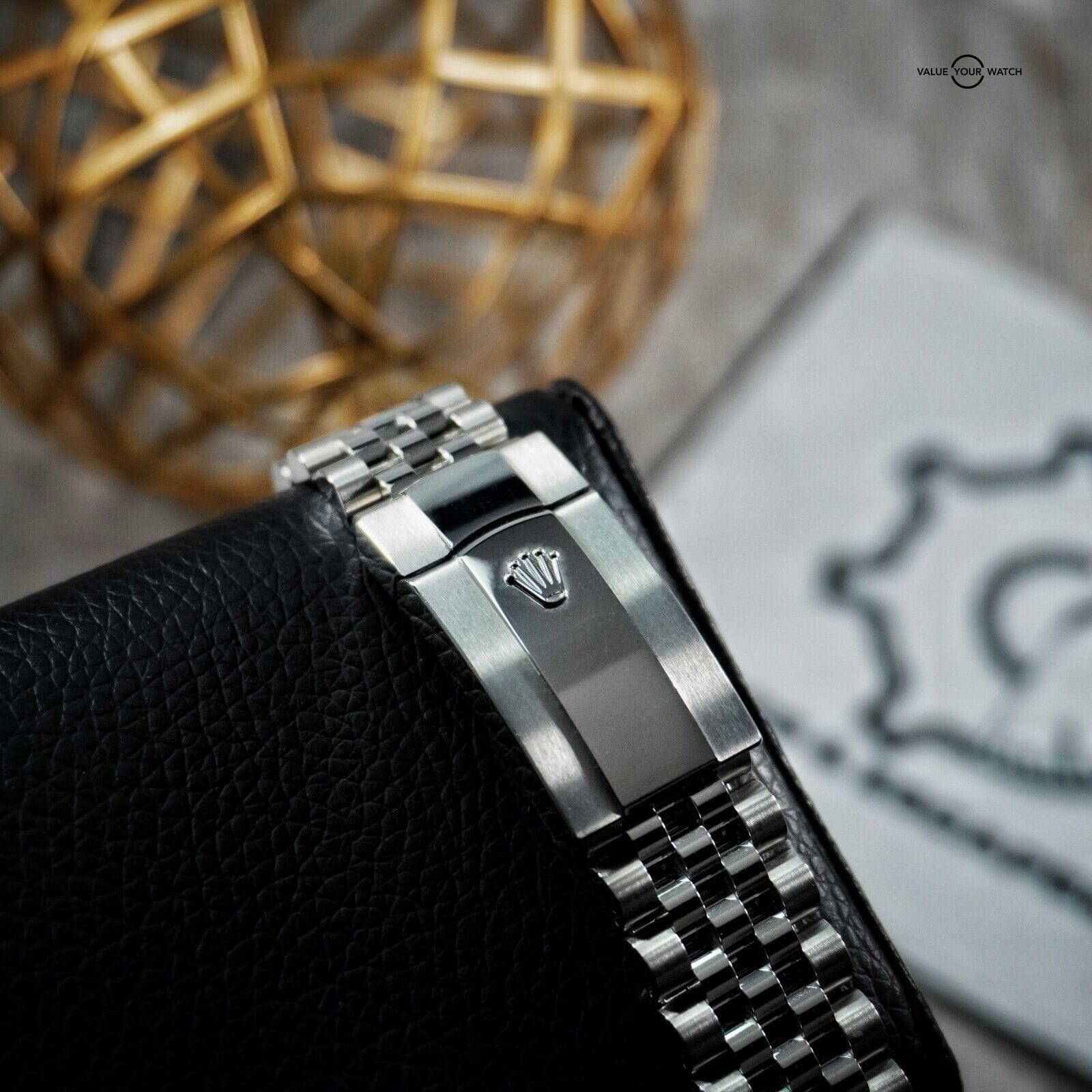 Elegant 36mm Rolex Datejust 126234 with the coveted ‘Wimbledon’ dial & fluted bezel. This timepiece needs no introduction as its one of the iconic models in the Rolex lineup. This beautiful timepiece features a stainless steel case & jubilee bracelet by Rolex. The white gold fluted bezel just works on this slate dial with green Roman numeral combination and this timepiece feels superb on the wrist.
