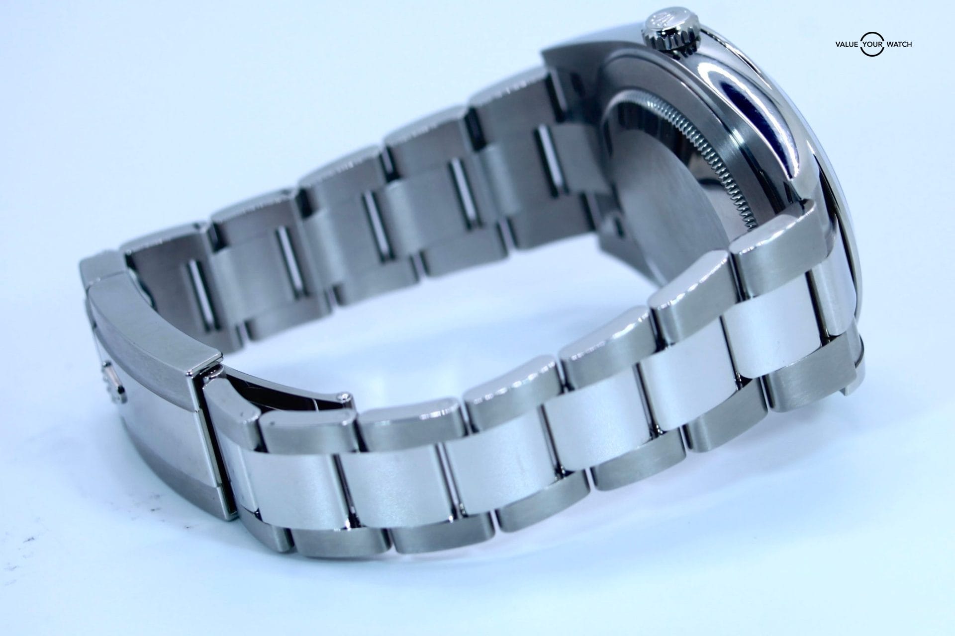 The date display at the 3 o’clock position features the iconic Cyclops lens, magnifying the date for easy reading. The Oyster bracelet, crafted from robust stainless steel, provides a comfortable fit and adds to the overall elegance of the watch.
