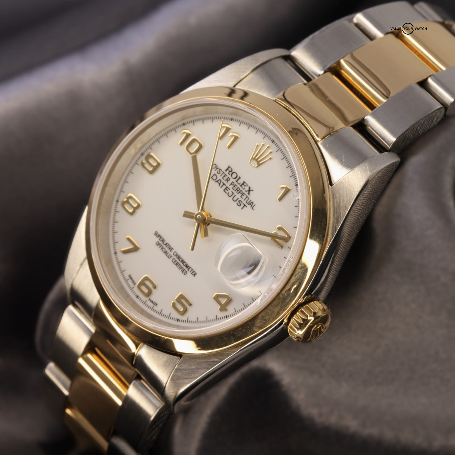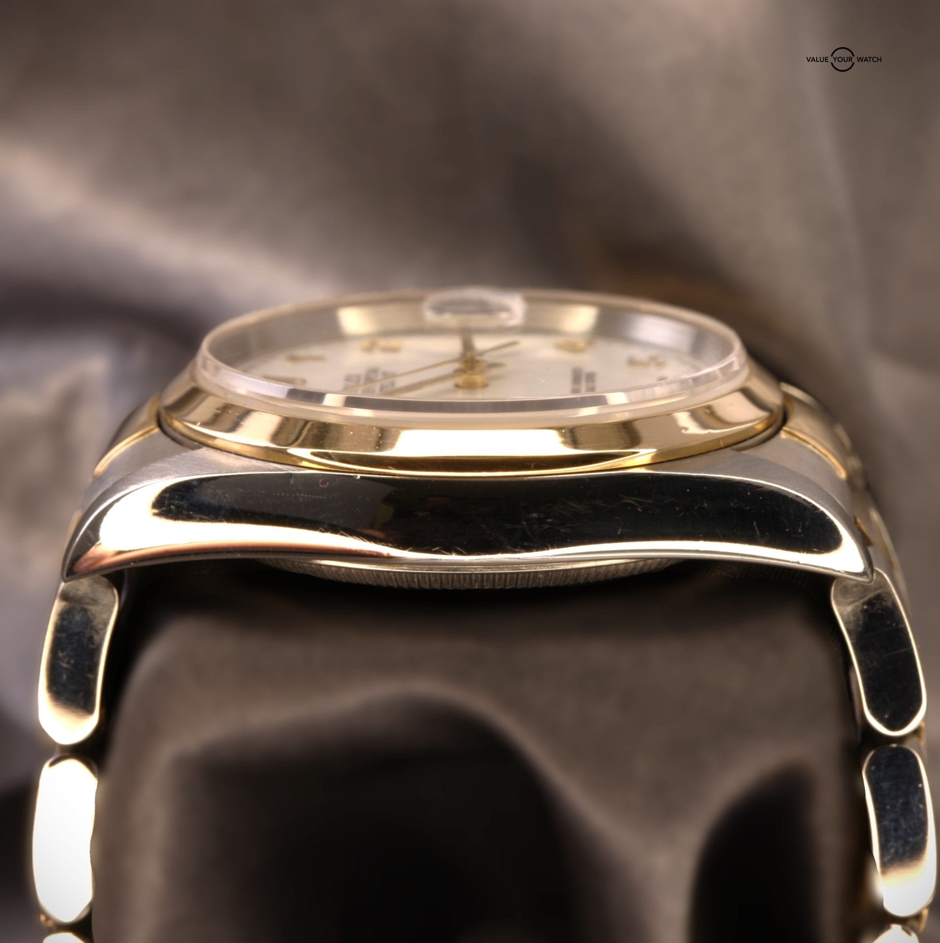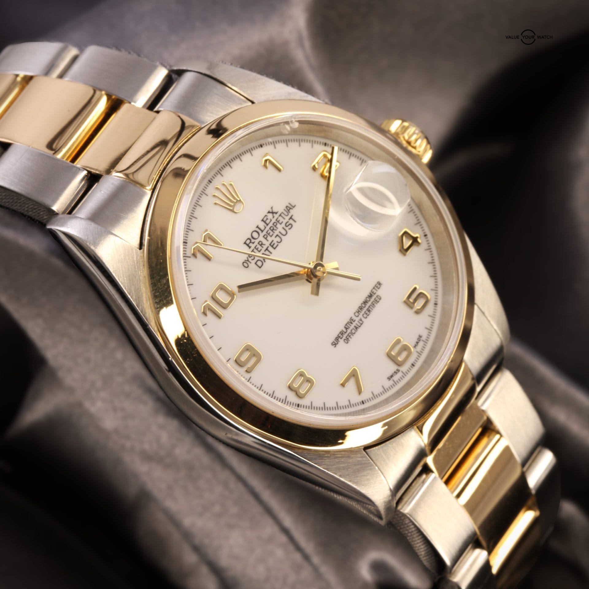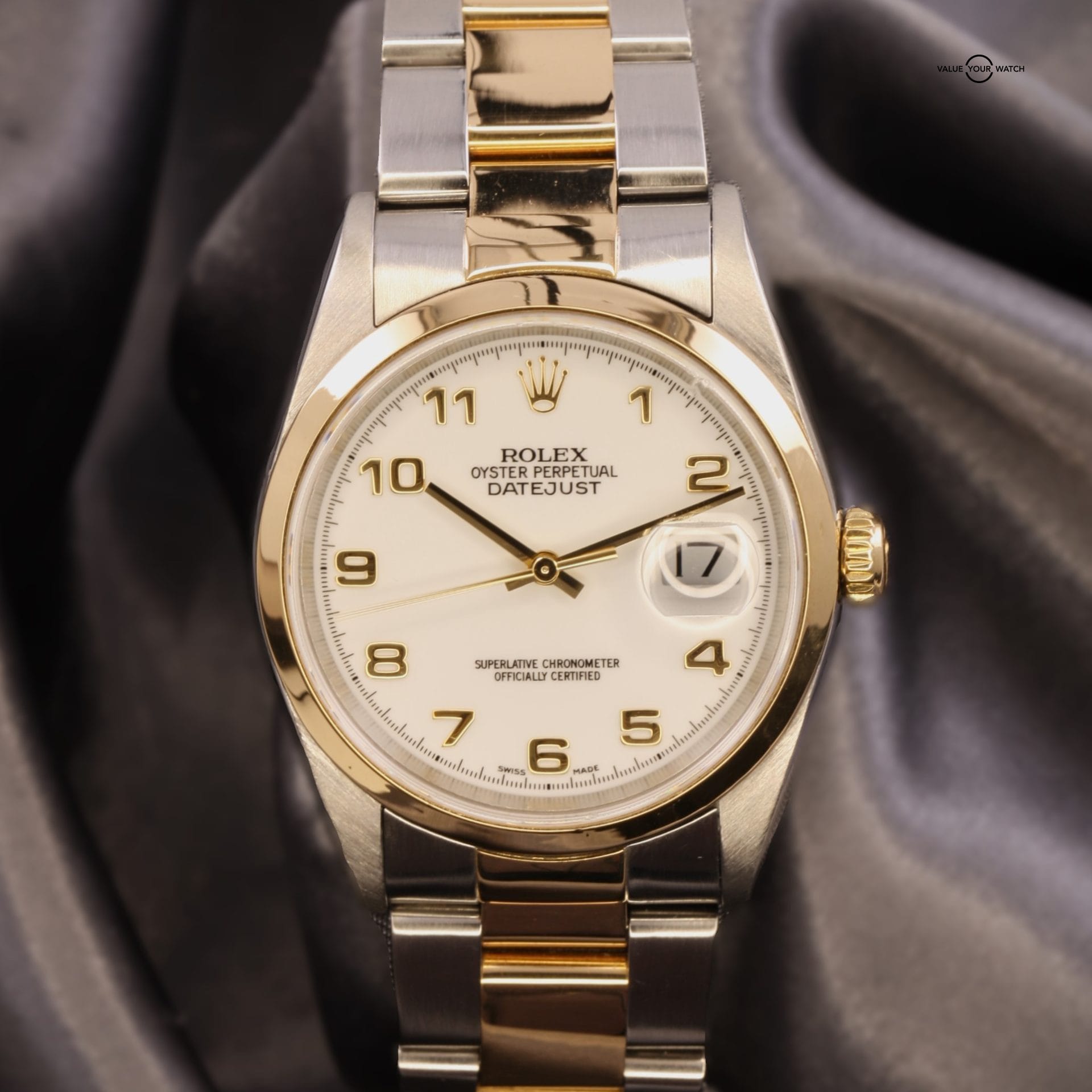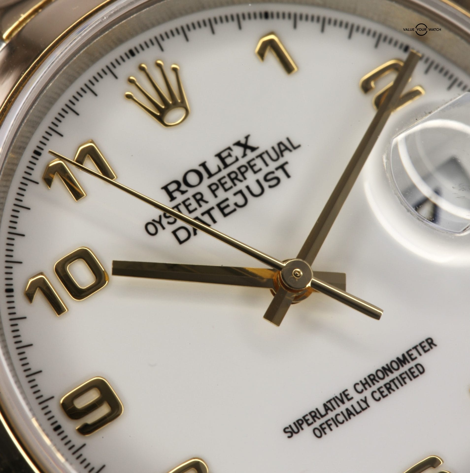 Introducing this exquisite two-tone Datejust, presented for your consideration. This captivating timepiece showcases a radiant white dial adorned with Arabic numeral hour markers in yellow gold. The striking contrast between the white dial and the smooth yellow gold bezel complements the elegance of this watch. Paired with an 18k yellow gold and stainless steel bracelet, it offers a harmonious blend of luxury and durability.