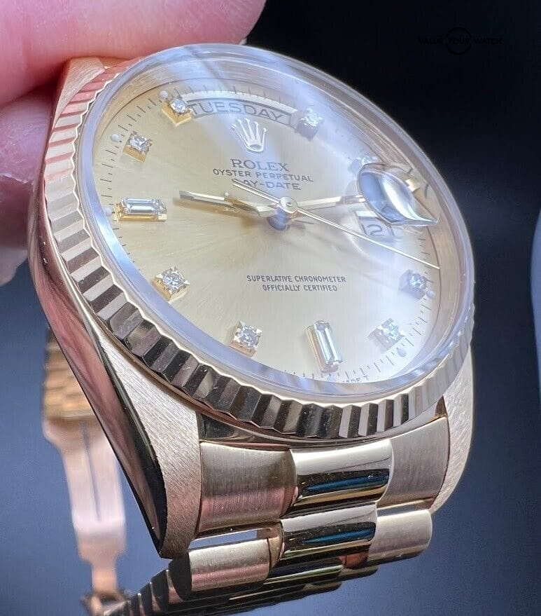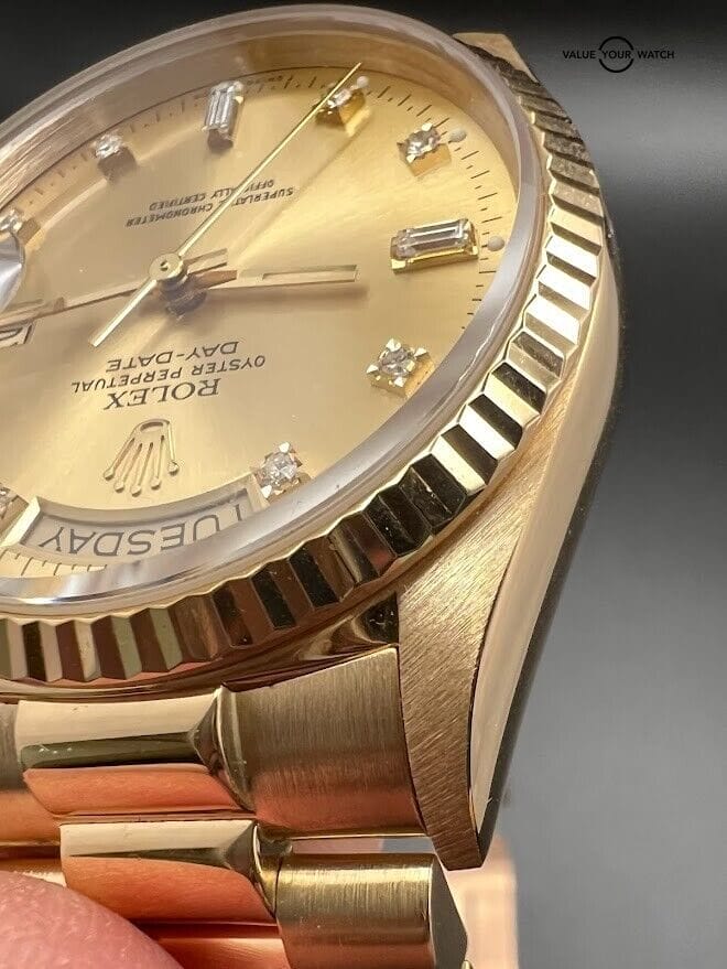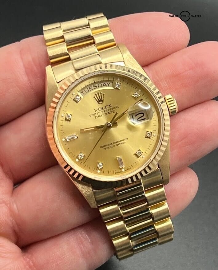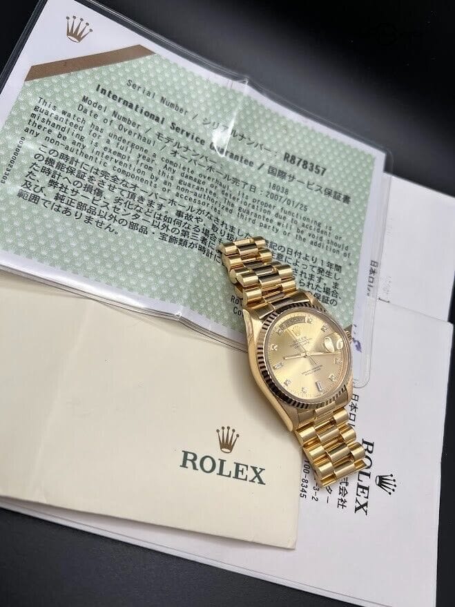 Specification: 1988 Rolex Day-Date 36mm 18038 President champagne diamond dial – SERVICED