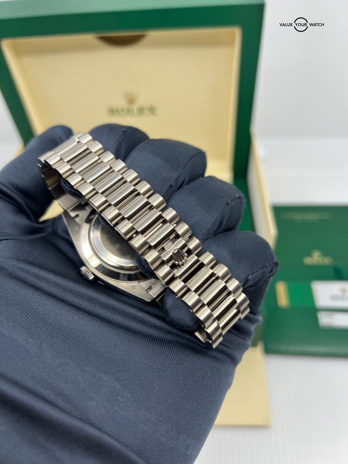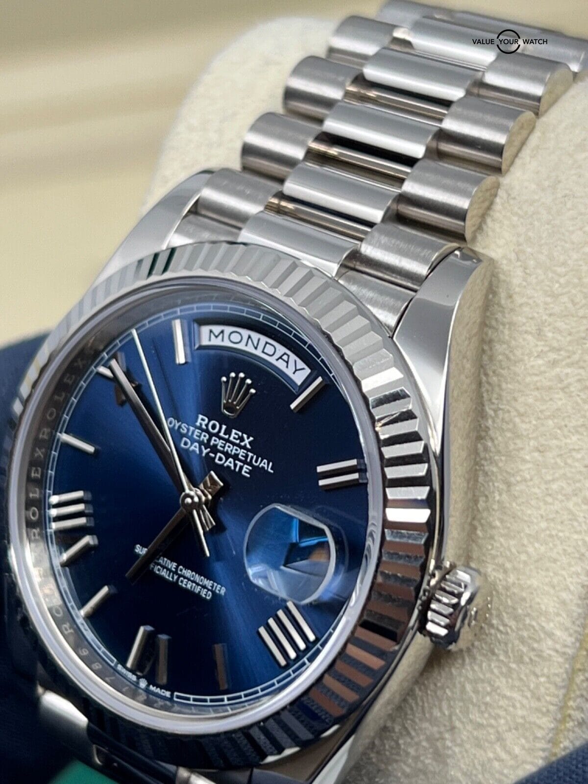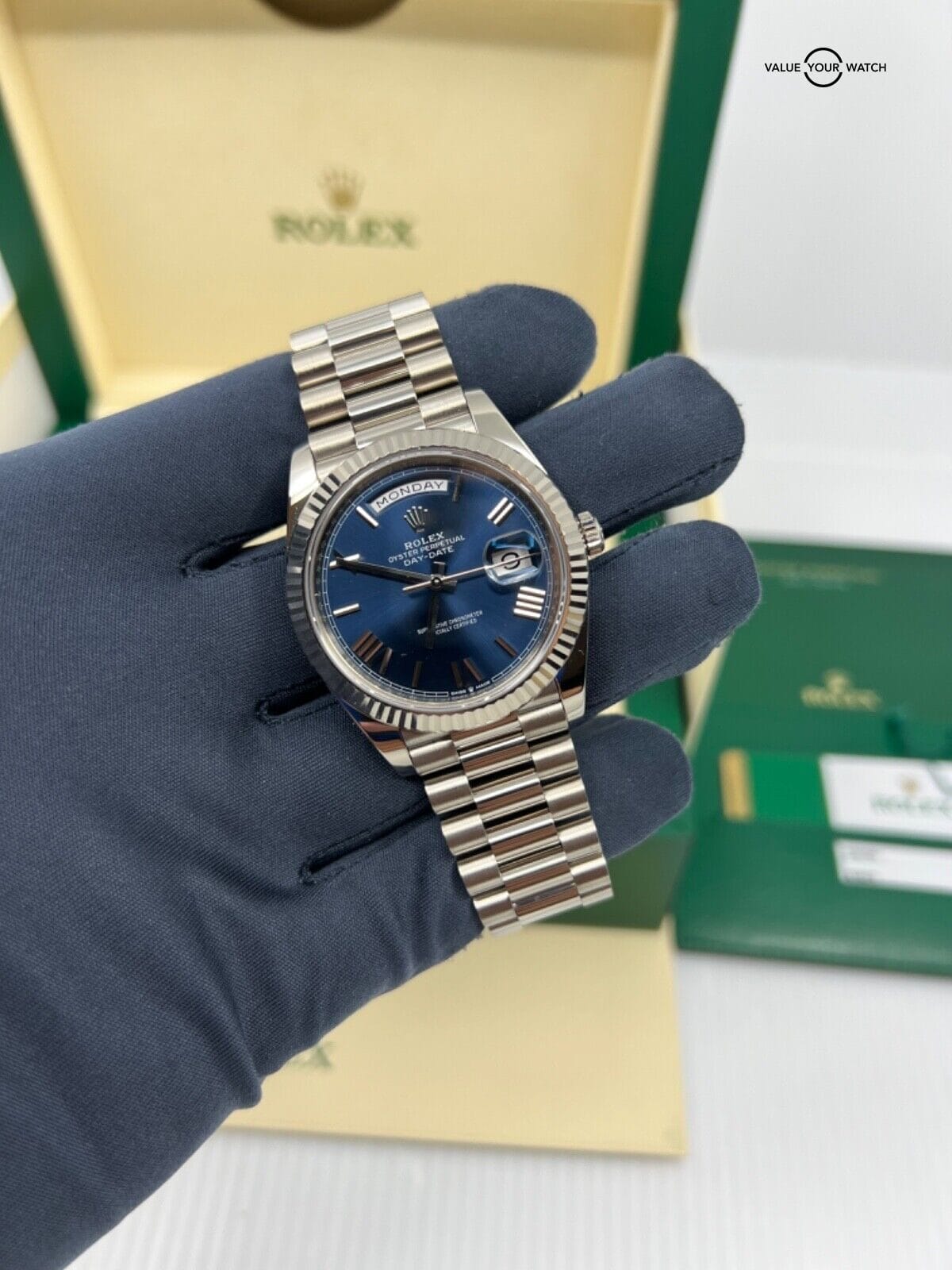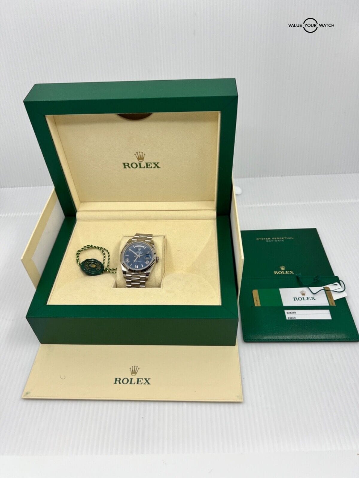 2019 Papers Rolex 40mm White Gold President Day Date Blue Roman Dial 228239