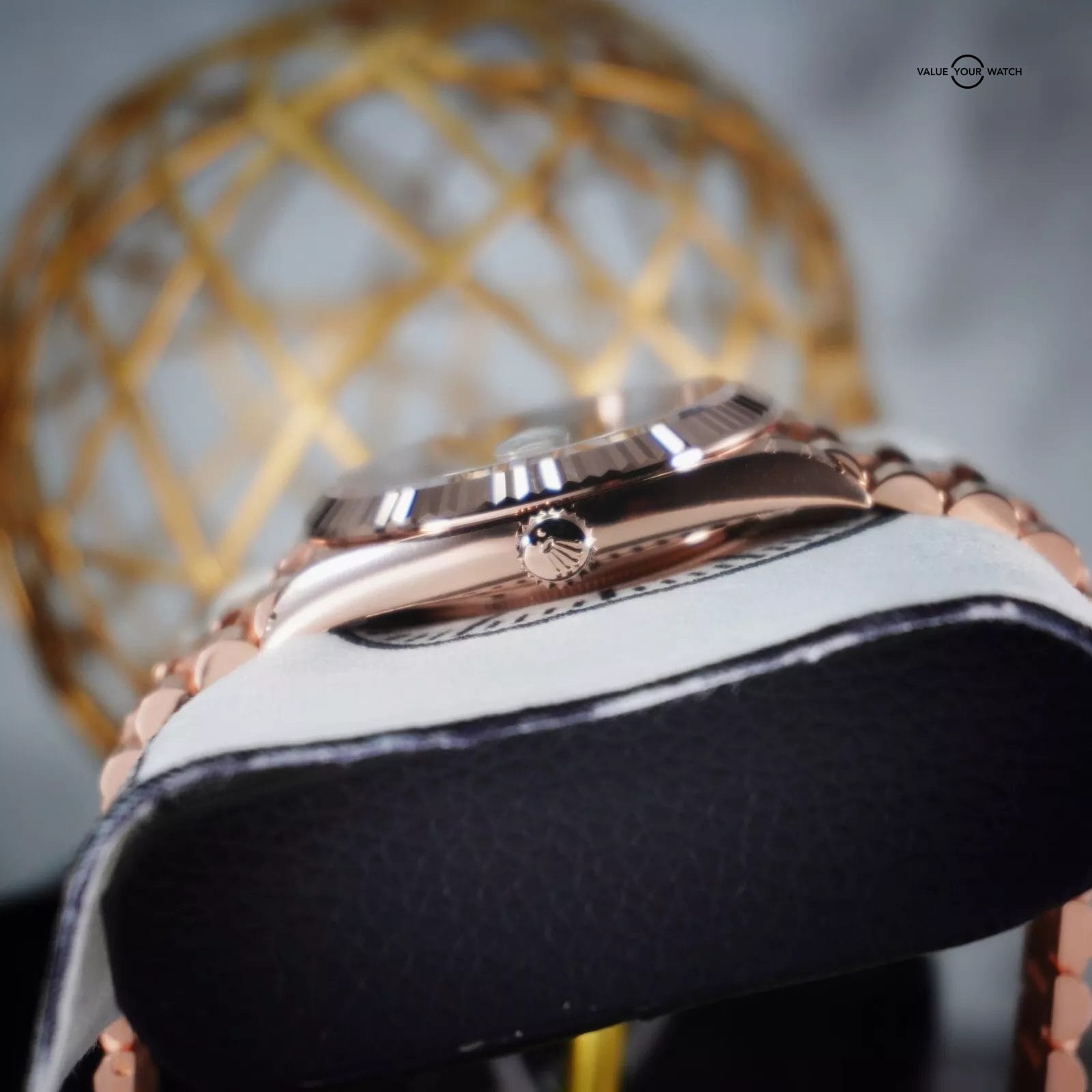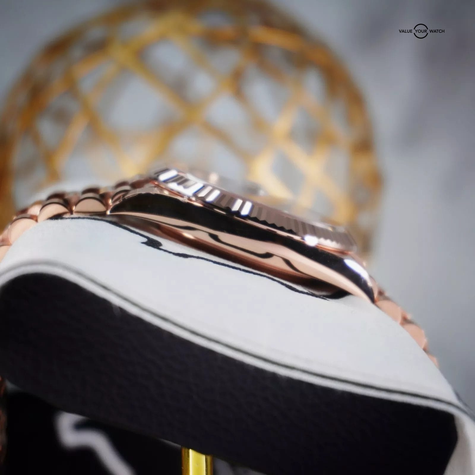 Stunning Rolex Sky-Dweller 228235 with striking Olive green dial. This timepiece needs no introduction as its one of the flagship models in Rolex lineup. This beautiful timepiece features one most sought after dials in all of Rolex’s catalog. Fluted bezel with solid rose gold presidential bracelet works really well in this hefty rose gold combination and this timepiece feels superb on the wrist. I especially like how the color of the dial plays with the rose gold case.