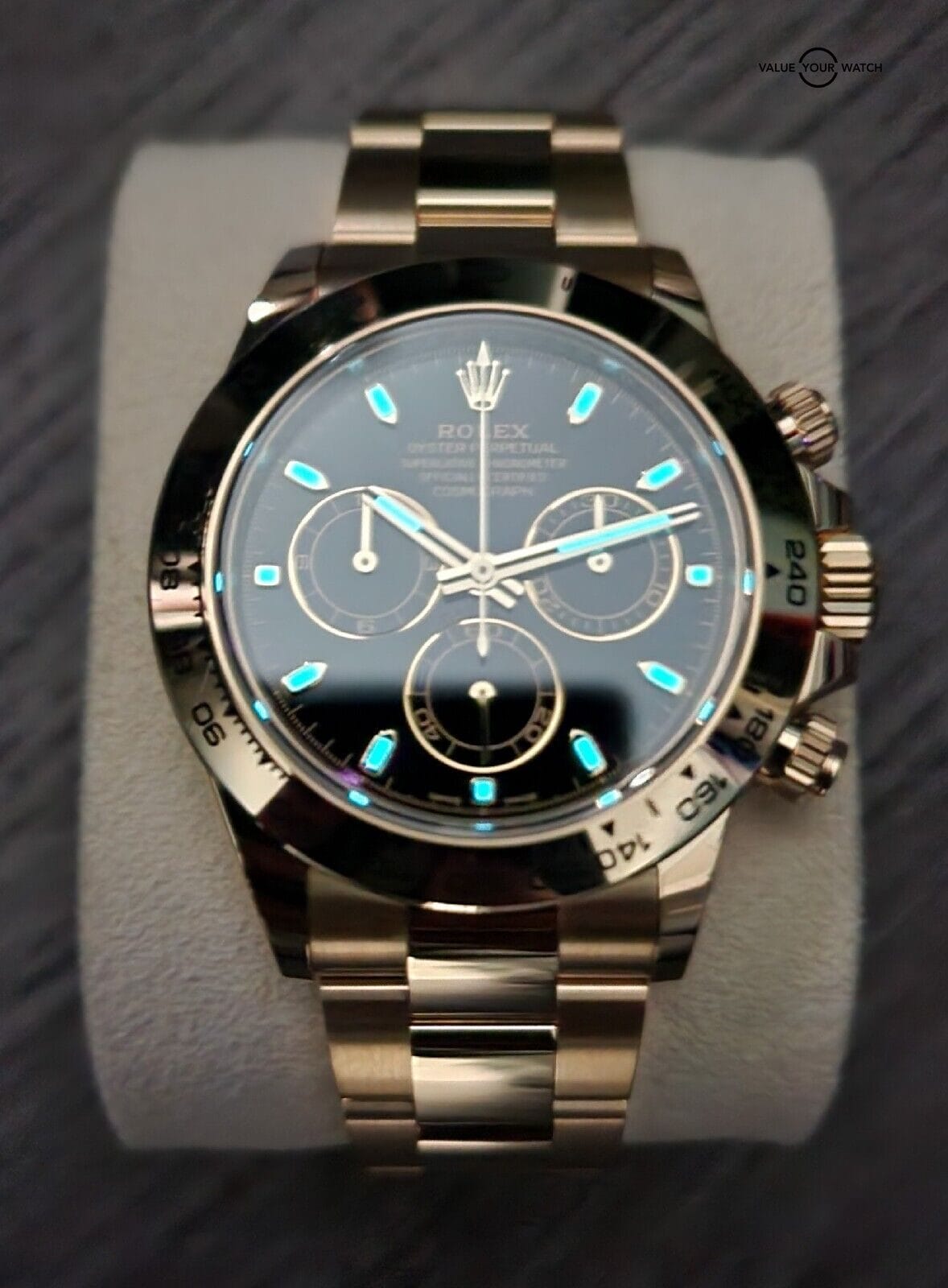 Rolex Cosmograph Daytona Men’s Deep Black Watch – 116508. Presenting a stunning 2023 Rolex Cosmograph Daytona 18k Gold Black Dial Full Set! This Oyster Perpetual Cosmograph Daytona in 18 ct yellow gold, with a black dial and an Oyster bracelet, features an 18 ct yellow gold bezel with an engraved tachymetric scale The tachymetric scale is a high-performance chronograph. With its tachymetric scale, its three counters, and its pushers, the Cosmograph Daytona was designed to be the ultimate timing tool for endurance racing drivers. The bezel features a tachymetric scale to read average speed over a given distance based on elapsed time. This scale offers optimal legibility, making the Cosmograph Daytona the ideal instrument for measuring speeds up to 400 units per hour, expressed in kilometres or miles. Black dial With chronograph counters This model features a black dial with snailed counters, 18 ct gold applique hour markers and hands with a Chromalight display, a highly-legible luminescent material. The central sweep seconds hand allows an accurate reading of 1/8 second, while the two counters on the dial display the lapsed time in hours and minutes. Drivers can accurately map out their track times and tactics without fail. The Oyster bracelet Alchemy of form and function The design, development, and production of Rolex bracelets and clasps, as with all the components of the watch, aesthetic controls by the human eye guarantee impeccable beauty. Reference 116508 Key Features -18k Gold – Black Cosmograph Dial -Smooth Bezel -40mm -100 M Water Resistance -72 Hour Power Reserve , Automatic movement -Full Set, Card dated 2023, Booklets, Cards, Double Boxed Excellent Unworn Condition I have many references and additional pictures available upon request! I can be found on FB and IG for additional information. |