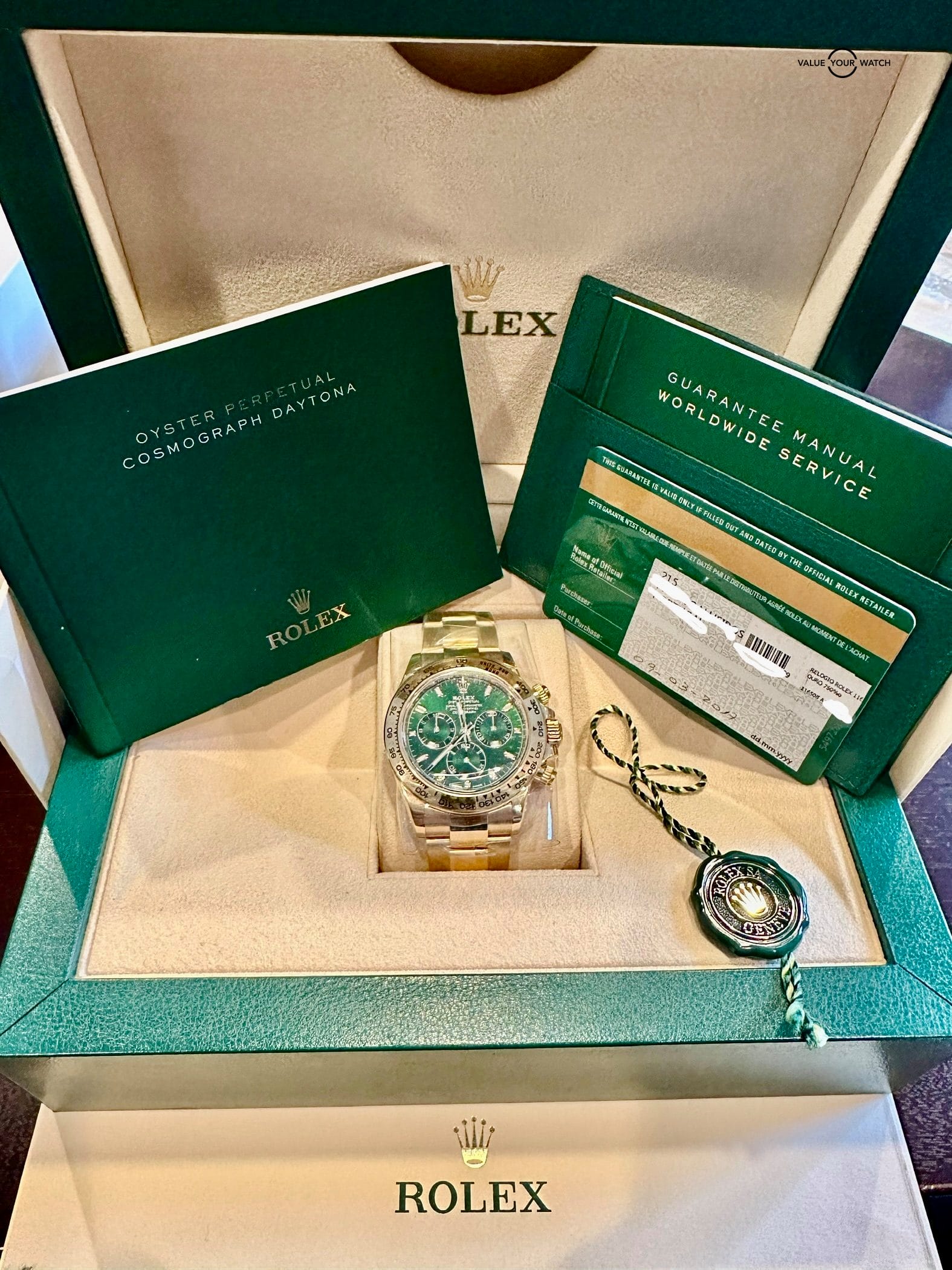 The actual watch offered is pictured along with everything included. LARGE Rolex box, outer box, box cover, warranty card, warranty manual, warranty holder, watch manual, green tag, all links.