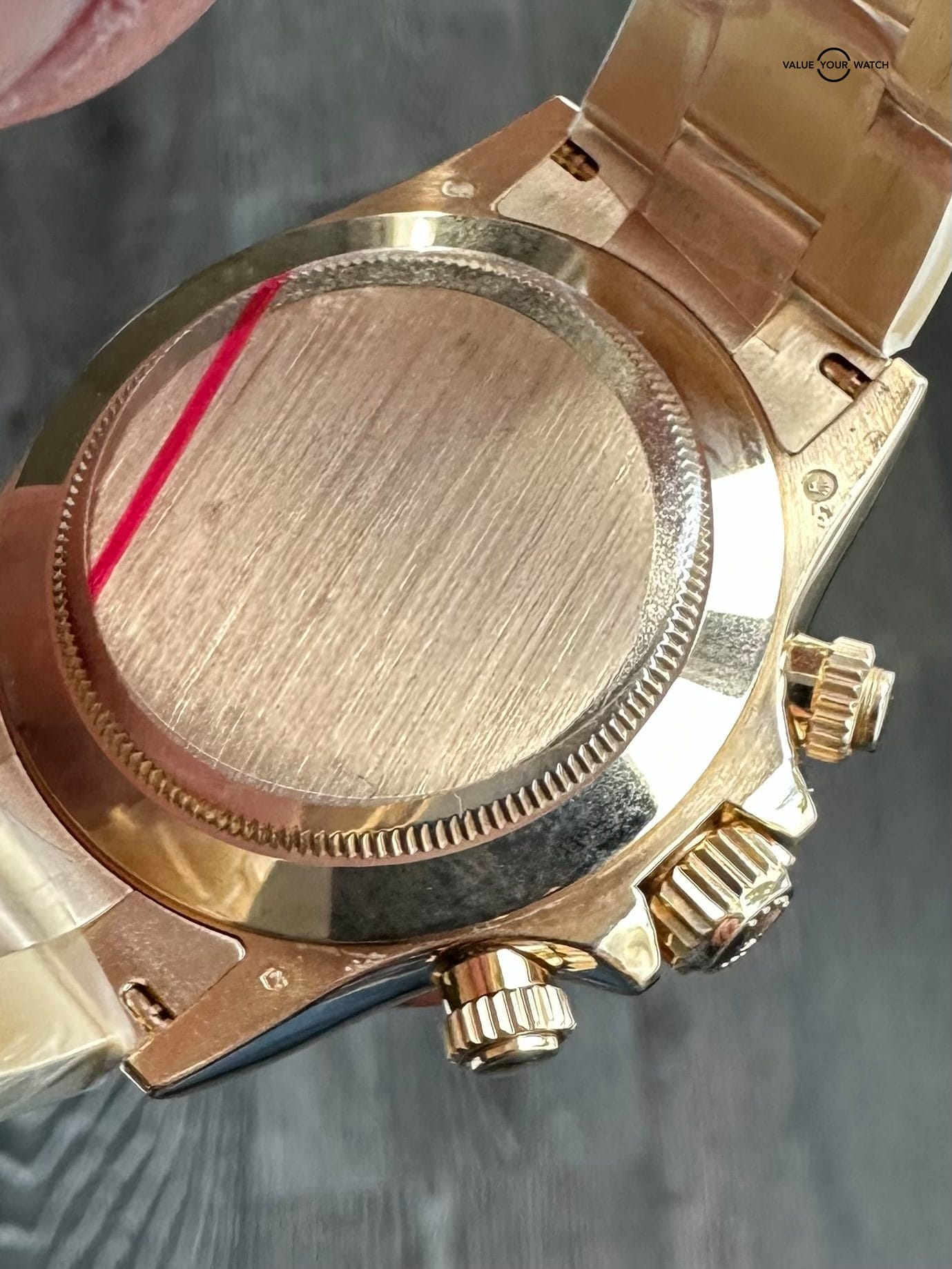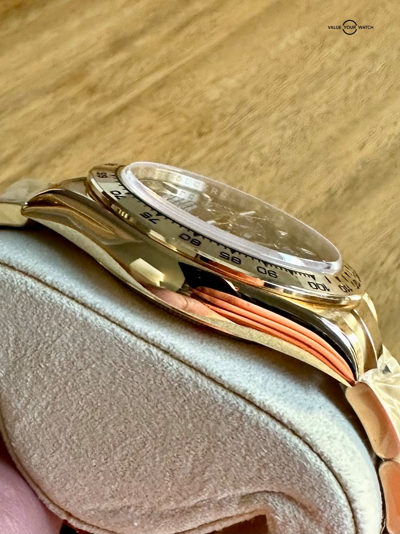 This model has a 18k solid yellow gold Oyster bracelet, bezel, and case.