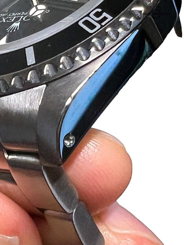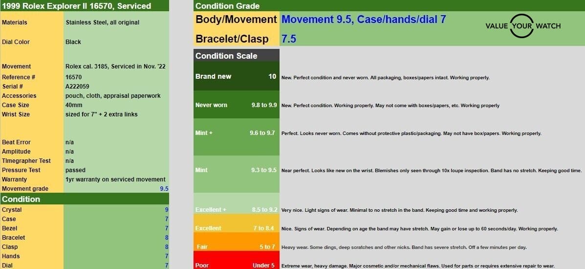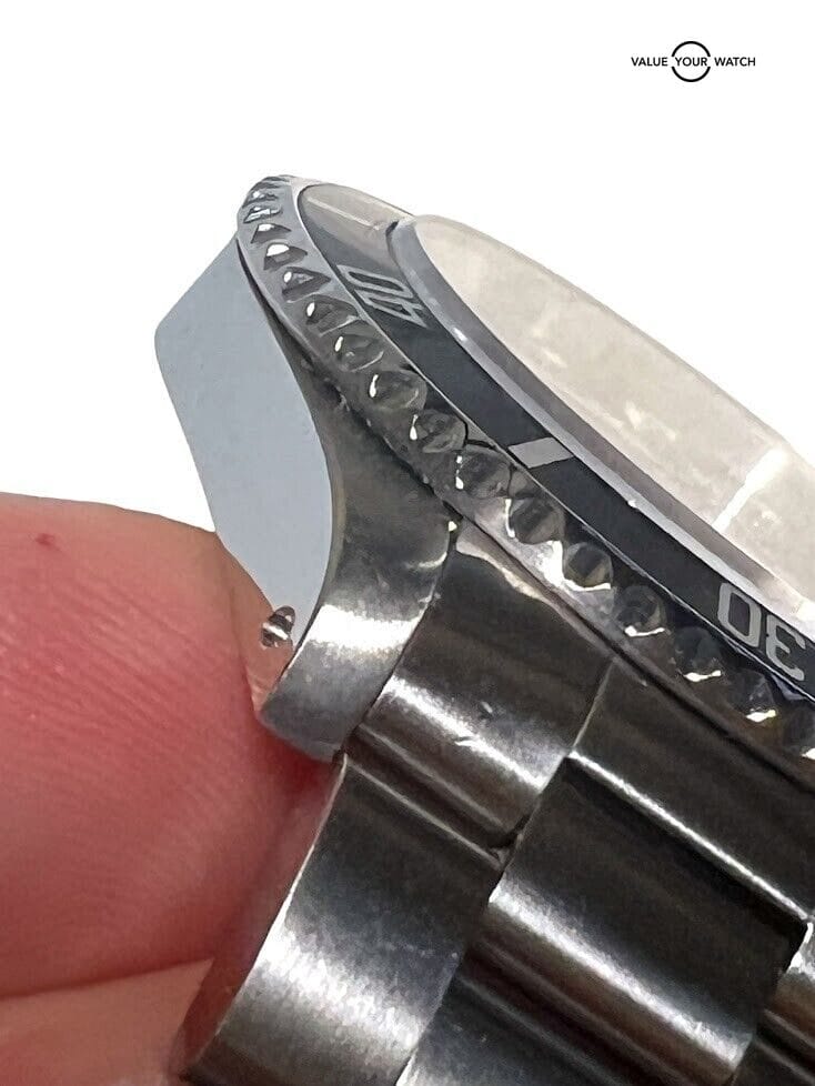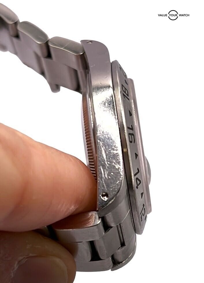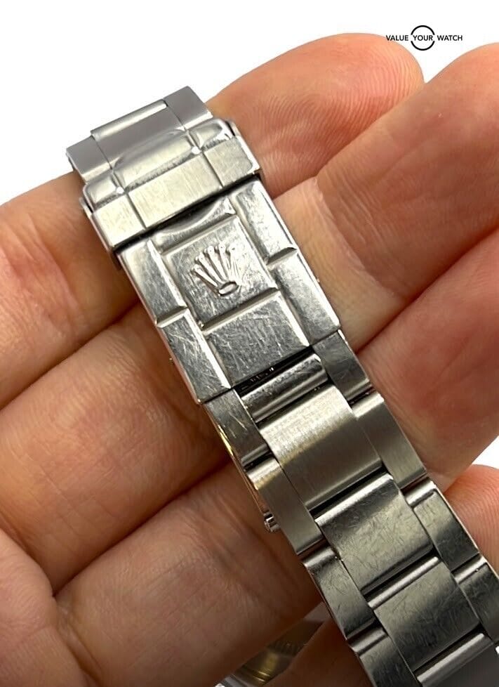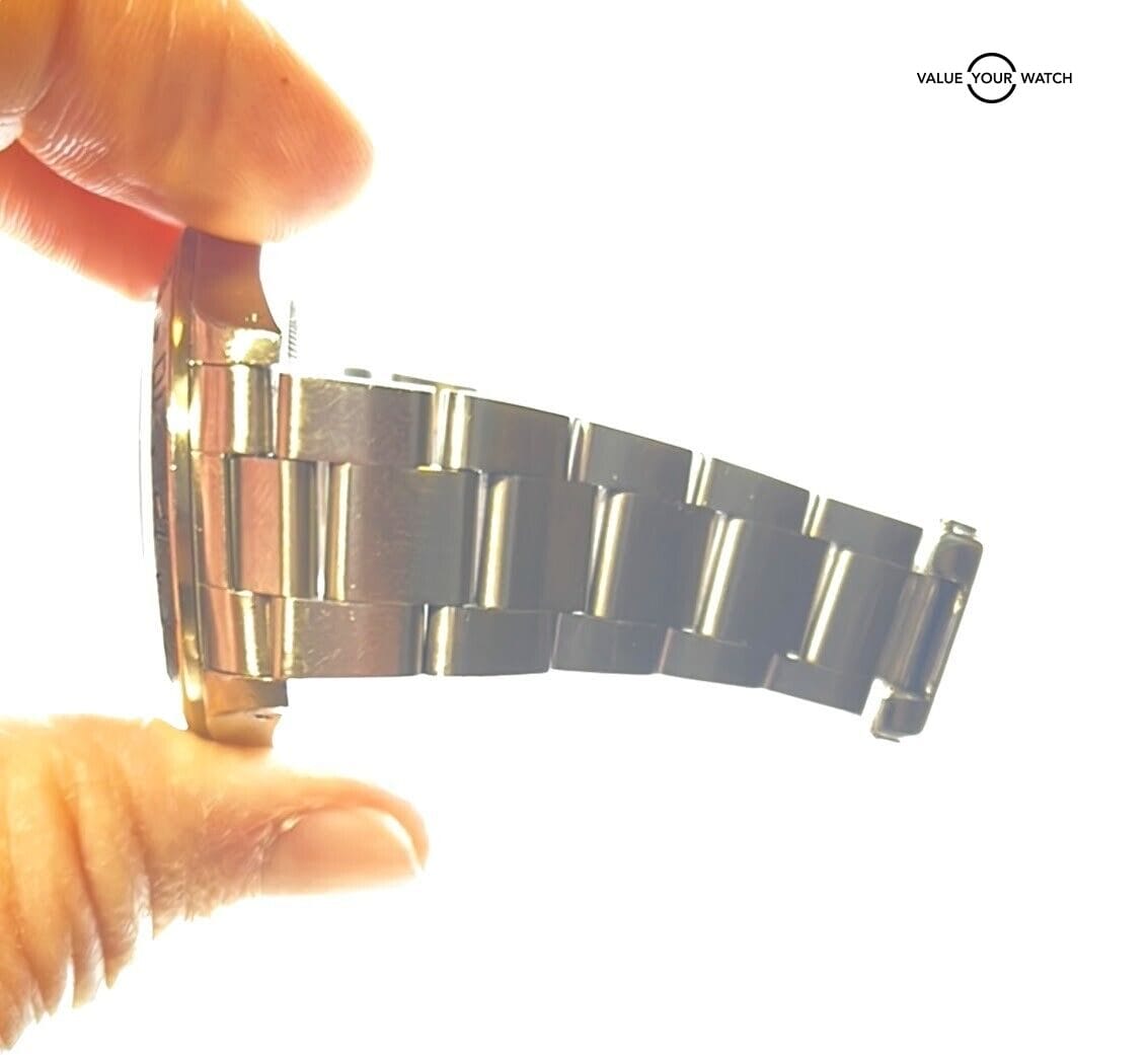 This watch was inspected for authenticity and serviced in November 2022. The case and bracelet is unpolished. The watch shows signs of daily wear and tear that is in line with the age of the watch. I tried to include some harsh light pics that showed the daily wear and unpolished condition. I would say the cosmetic condition of the watch is fair to good and the functioning condition of the watch is good as new. Service paperwork is included with the sale.