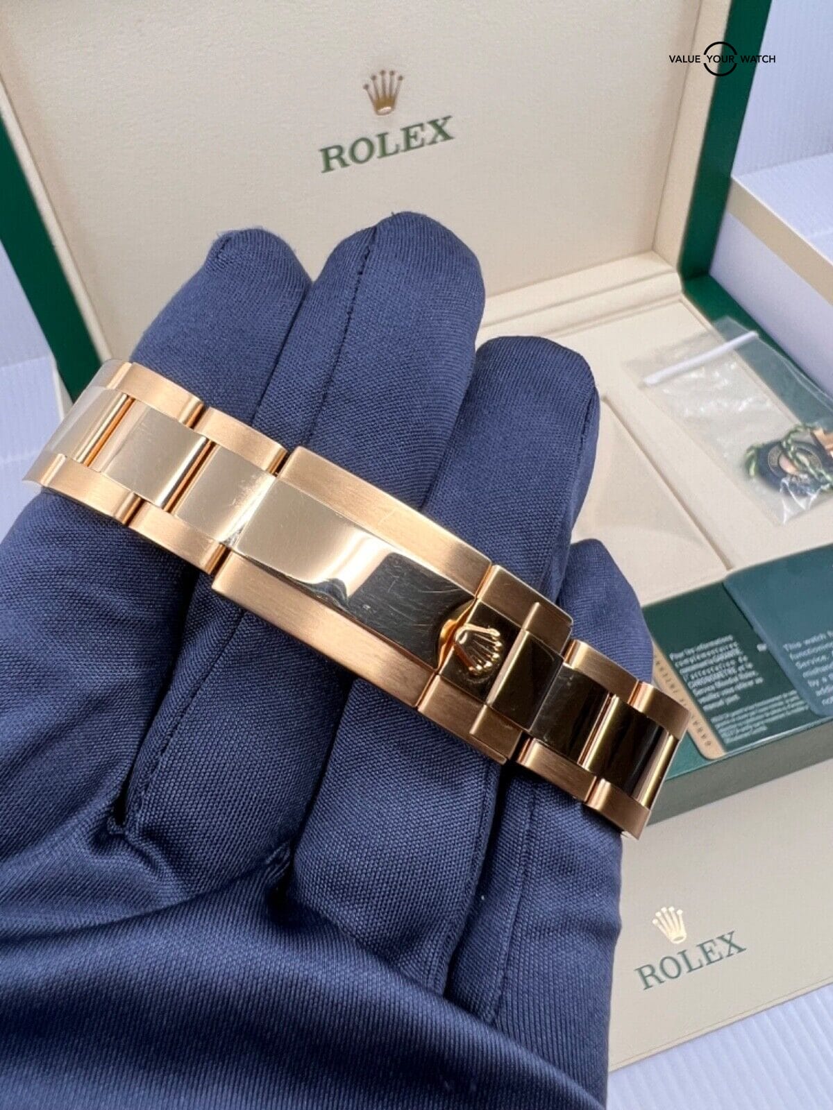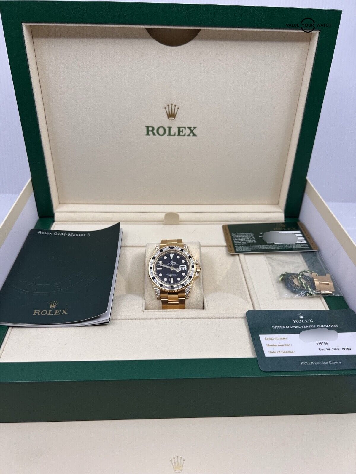 Box, manual, full links, original card, and service card. Just serviced by Rolex and has factory warranty until end of next year