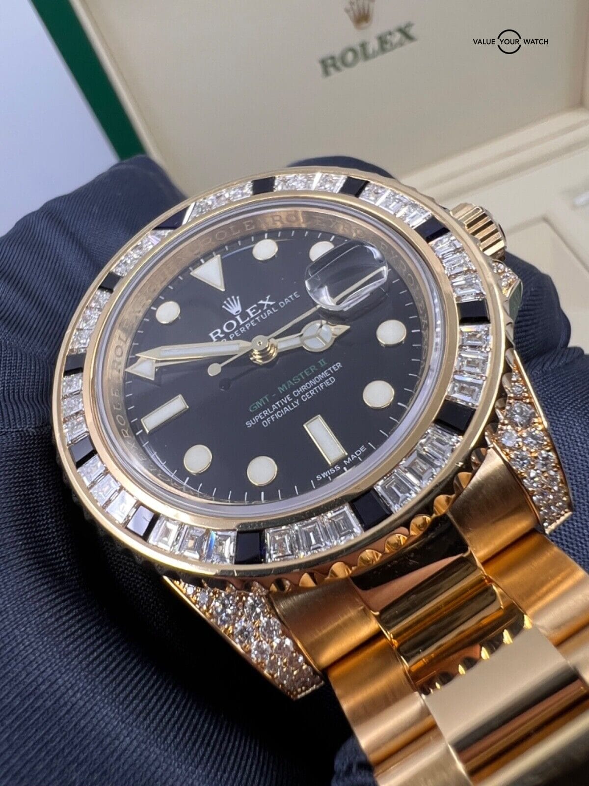 Factory Diamond Black Sapphire Rolex GMT Master II 116758 SANR 18k Yellow Gold