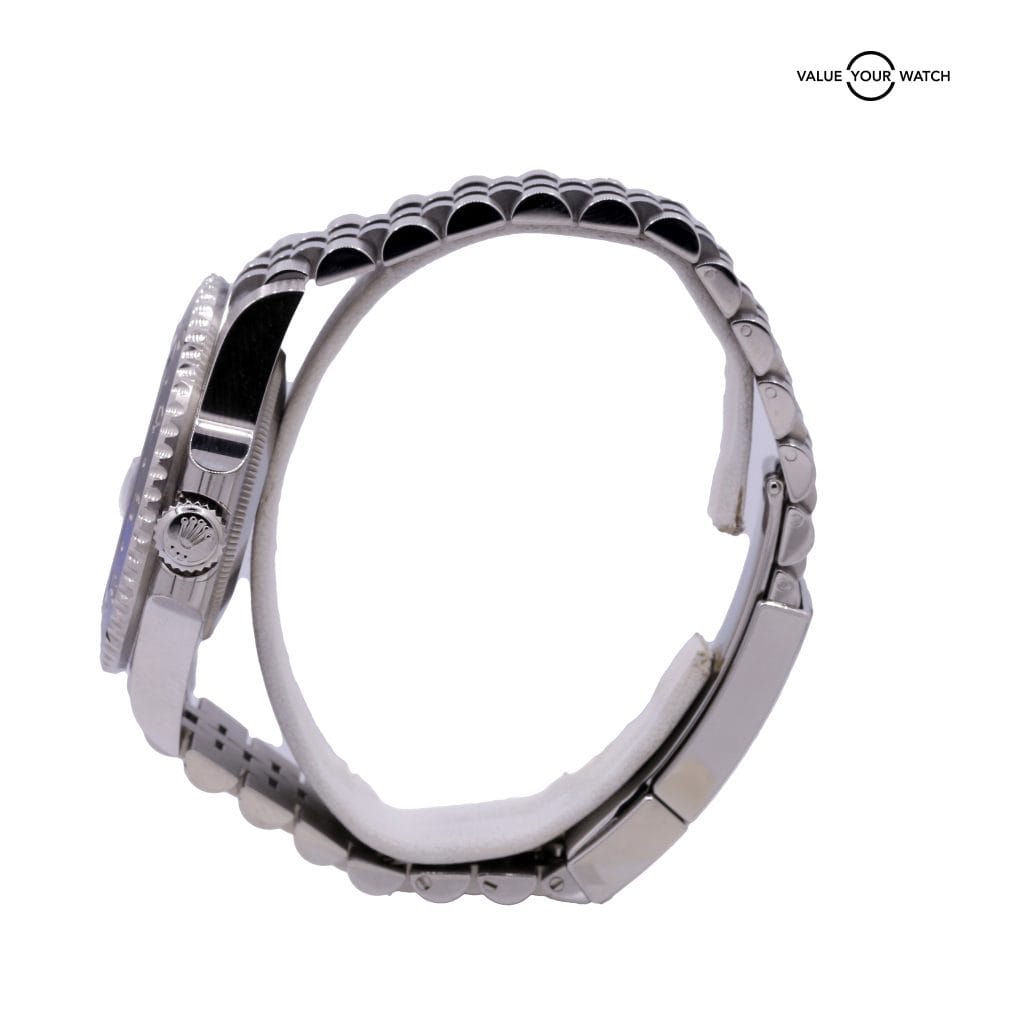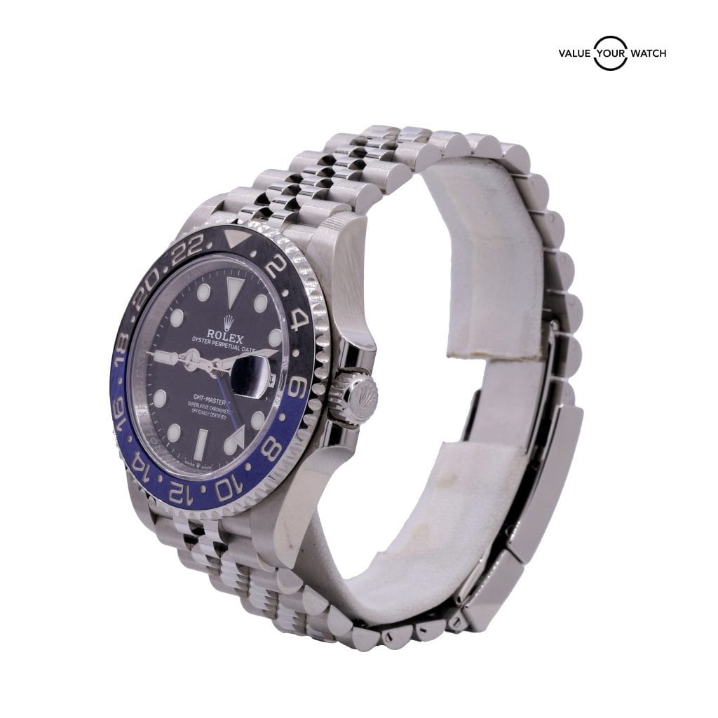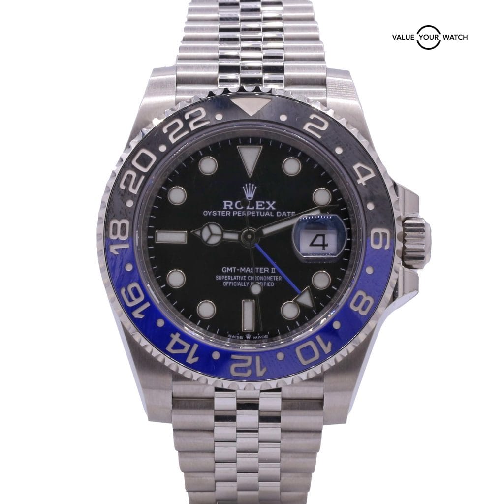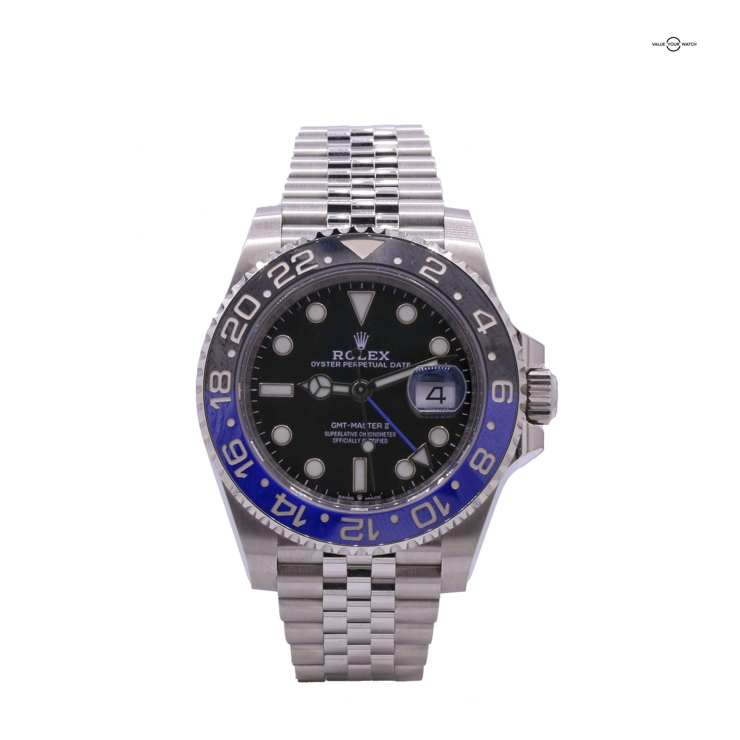 Rolex GMT-Master II, Batman, 40mm. Stainless steel case with polished finished edges and a brushed/satin-finished top. Black dial with applied polished white gold dot hour markers with luminous fill. Polished white gold time hands with luminous fill. Minute markers around the outer rim. This model is distinguished by the presence of the GMT/2nd Time Zone. GMT/Dual Time zone is indicated by the blue hand with a luminous filled arrowhead tip pointing to the 24-hour indications on the bezel. Wherein The GMT hour hand makes a single revolution once in 24 hours. The watch dial is protected by a Scratch-resistant sapphire crystal with Cyclops lens over the date. Date display at the 3 o’clock position. They have a screw-down polished Stainless Steel Triplock crown with a Rolex logo. Bidirectional rotating Stainless steel bezel with 24-hour markings and ribbed edge for a sure grip. It is called Batman because of the Blue and black Cerachrom insert. Look luxurious on it and matte platinum-coated numbers, and graduation indexes. The movement is a mechanical self-winding Rolex caliber 3285 automatics with 31 jewels and 70 hours of power reserve. The watch presented on a Stainless Steel Jubilee bracelet of five-piece links with folding Oysterlock safety clasp with Easylink 5 mm comfort extension link. The water resistance is up to 100m/330ft.