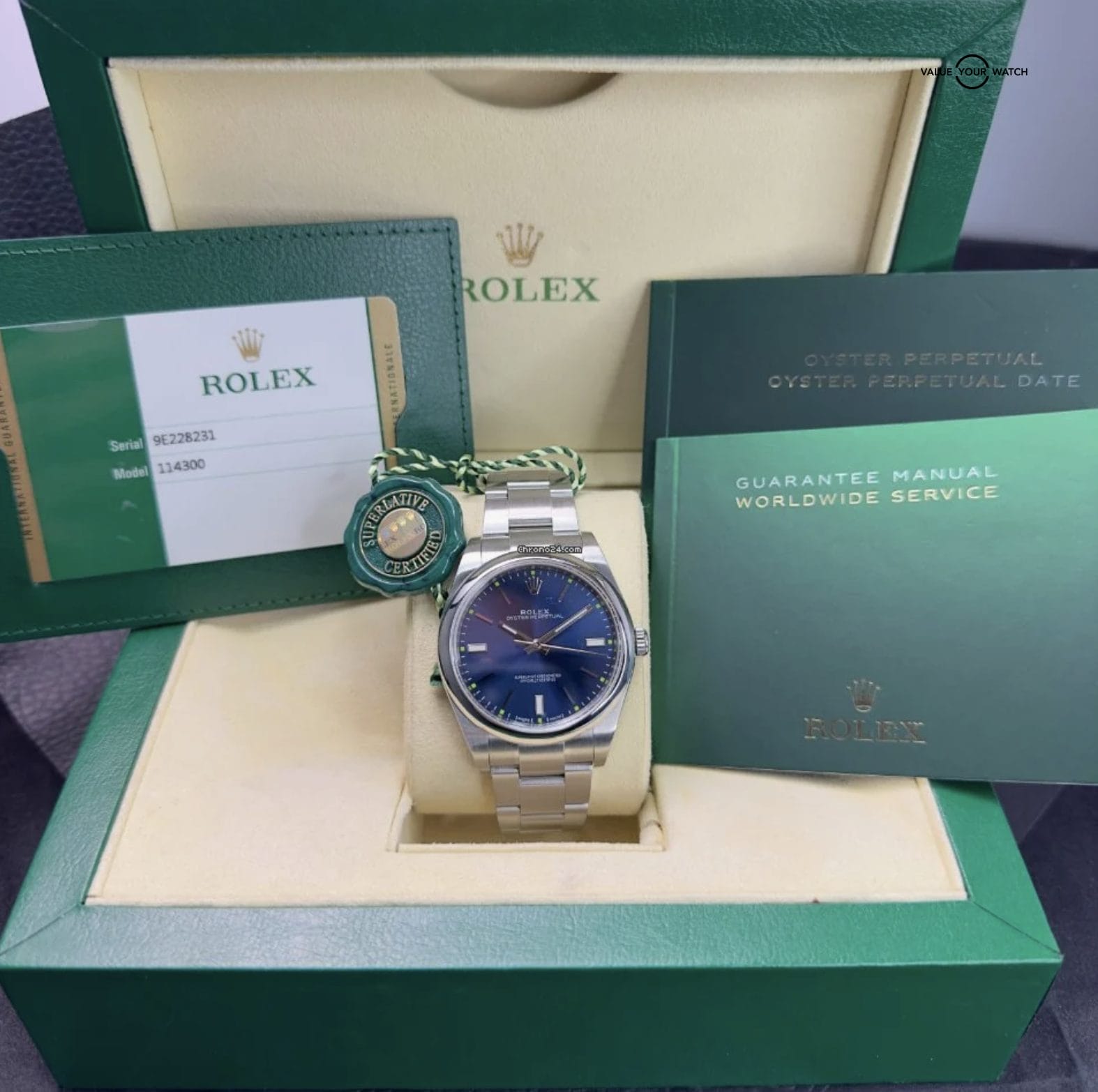 Specification: FS: 39mm Rolex Oyster Blue Dial Ref# 114300 complete box and papers