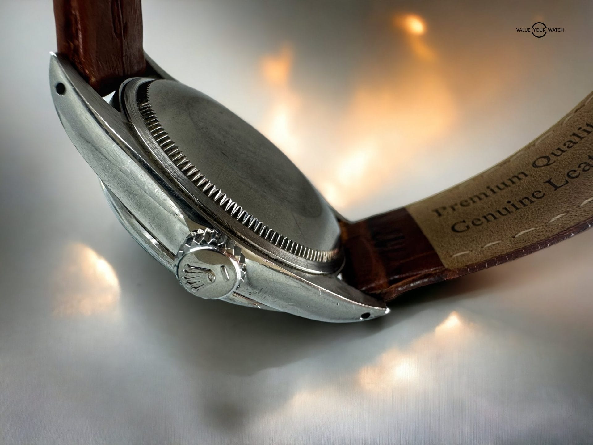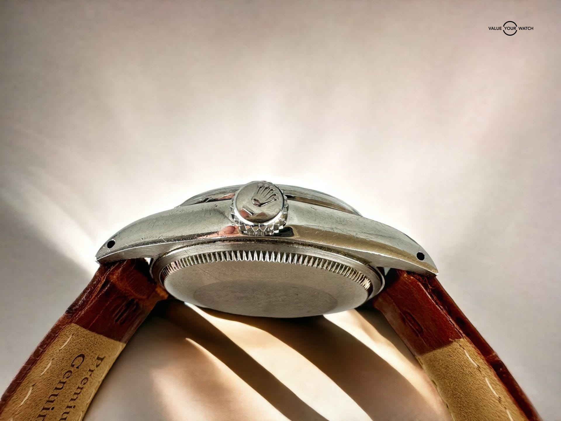 The watch features an acrylic crystal, which is a common characteristic of vintage Rolex timepieces. Acrylic crystals are known for their unique distortion of light, lending a charming and nostalgic quality to the watch’s appearance.