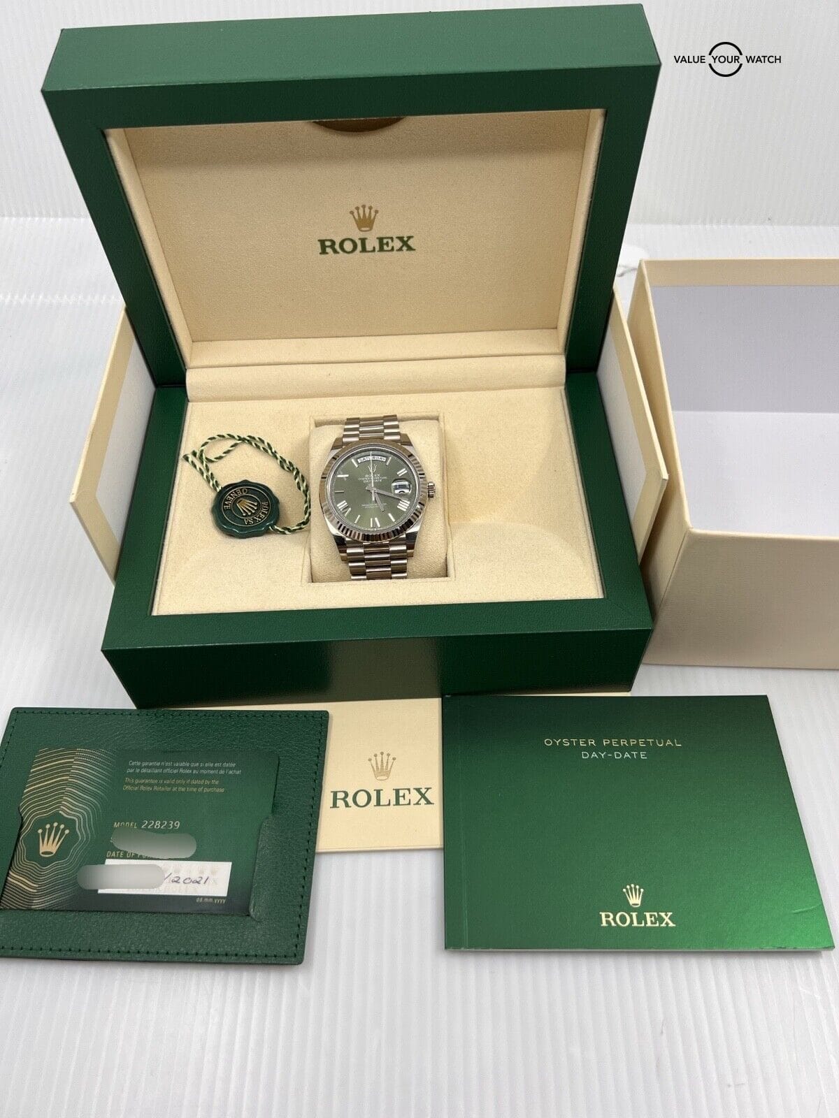 Specification: 2021 Olive Green Dial Full Links 40mm White Gold Rolex President Modern Card