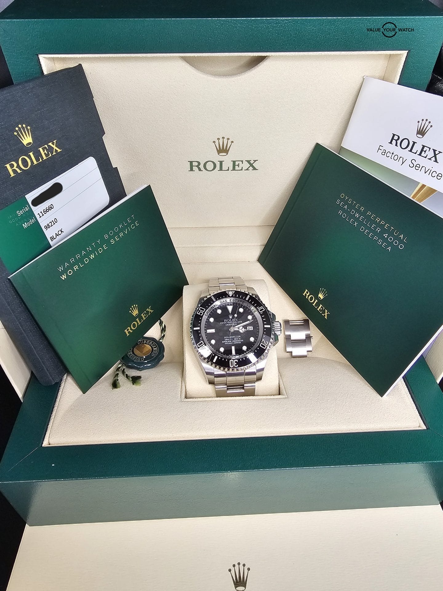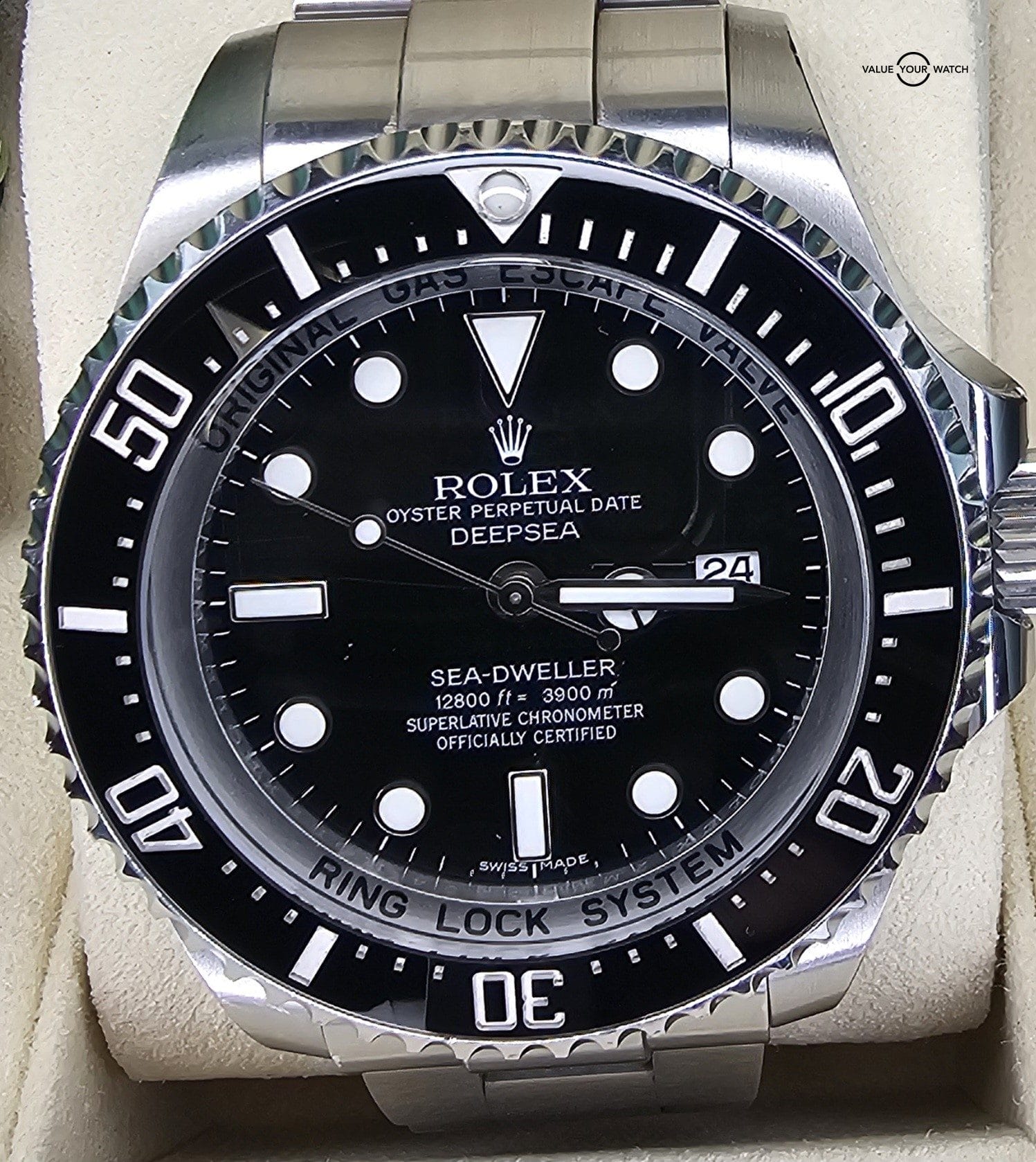 The Rolex Sea-Dweller Deepsea Men’s watch 116660 is an authentic Swiss-made luxury watch that features a 904L Oystersteel stainless case and matching stainless steel oyster bracelet with Oysterlock deployment buckle that includes the new Glide lock extension system. Luminescent hands and hour markers with date aperture at the 3 o’clock position reside on the beautiful deep black.  The case is encompassed by a black Cerachrom insert ceramic bezel with engraved 60-minute scale and graduations. This durable watch is driven by COSC Superlative Chronometer Certified Self-winding movement with a 48-hour power reserve.  The helium escape valve is unidirectional and is automatically activated when the pressure inside the case is greater than the external pressure. It releases the helium atoms, therefore preserving the integrity of the watch during the return to the surface making it waterproof to 1,220 meters or 4,000 feet.