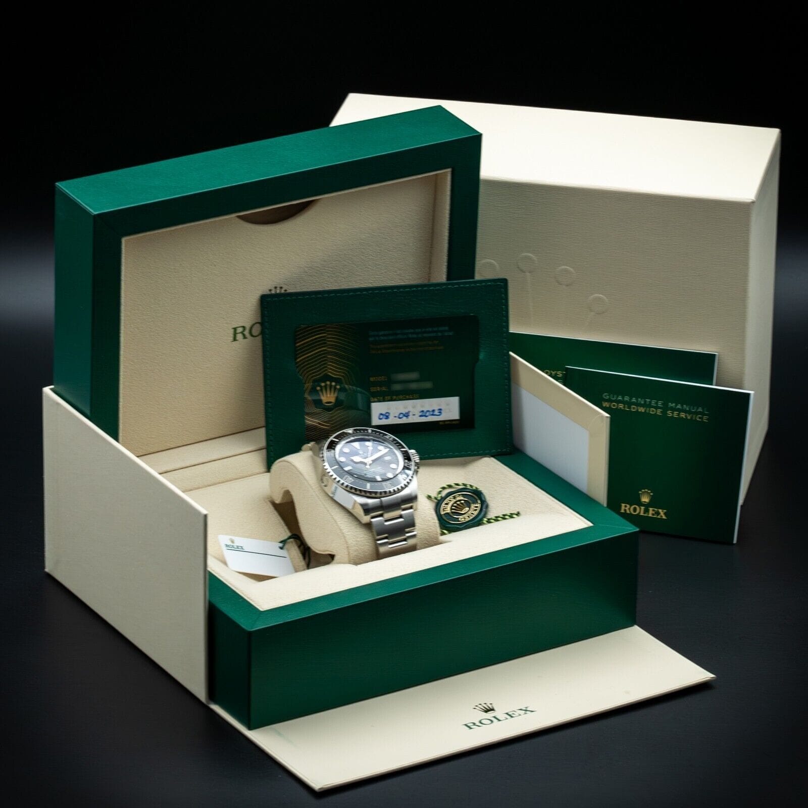 This timepiece comes with outer white Rolex box, the green Rolex box, warranty card, card holder, warranty booklet, green tag, and white tag. The Rolex International warranty card is dated August 4th, 2023, so the 5 year Rolex International Warranty is valid until August 2028.
