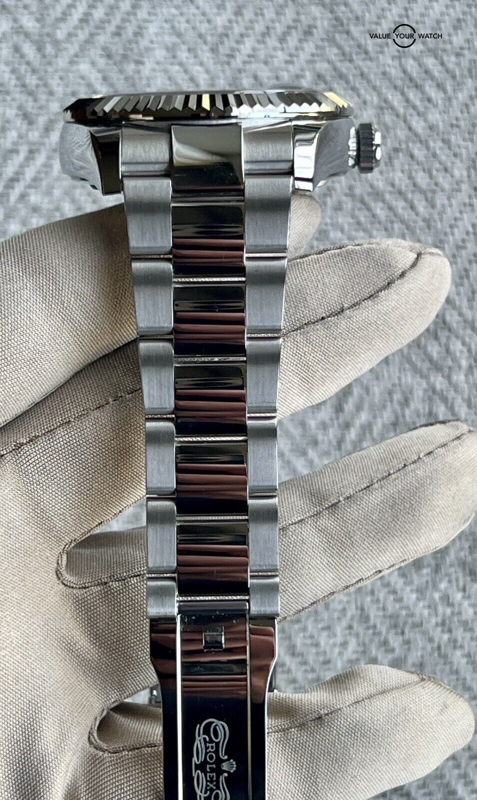 This Rolex Sky-Dweller boasts a stunning blue dial with baton indexes and a sunburst dial pattern. With a case size of 42mm and a lug width of 21mm, this luxury timepiece is made of stainless steel and white gold. The fluted bezel, silver case color, and solid caseback add to the watch’s elegance. The bracelet is a Rolex Oyster, and the watch has 40 jewels, an annual calendar, chronometer, date indicator, self-winding movement, and sapphire crystal. It is also water-resistant up to 100m.