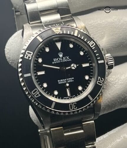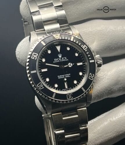 Powered by the Rolex Caliber 3130 self-winding mechanical movement, the Submariner No-Date 14060 Flat 4 delivers exceptional accuracy, durability, and reliability. It operates at a frequency of 28,800 vibrations per hour and offers a power reserve of approximately 48 hours. The watch also boasts Rolex’s renowned Oyster case construction, providing water resistance up to 300 meters (1,000 feet).
