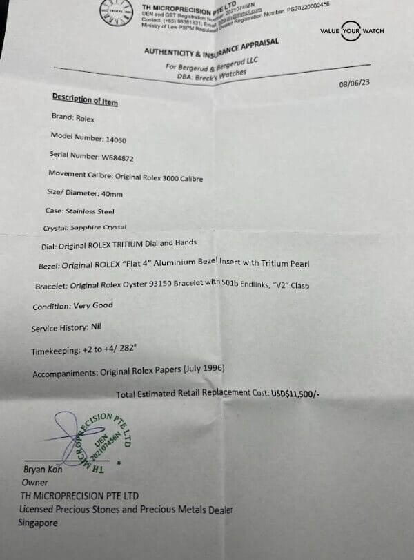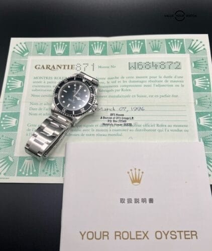 The 1995 Rolex Submariner No-Date 14060 Flat 4 comes with its original papers, contributing to its authenticity and provenance. The presence of these documents adds value and provides assurance to collectors and buyers regarding the watch’s history and authenticity.