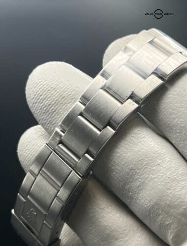 This example is in excellent pre-owned condition. It has just been expertly polished and has a minty finish. The movement runs strong with a greater than 280 amplitude and runs between +2 and +4 seconds per day. My Rolex-trained watchmaker has verified that the movement is in excellent condition and does not need service for at least a few more years. Minor hairline scratches on the case and bracelet may be observed under magnification. I left protective plastic on the bracelet since it is such nice aesthetic condition. Minor blemishes may be observed on the bezel insert.