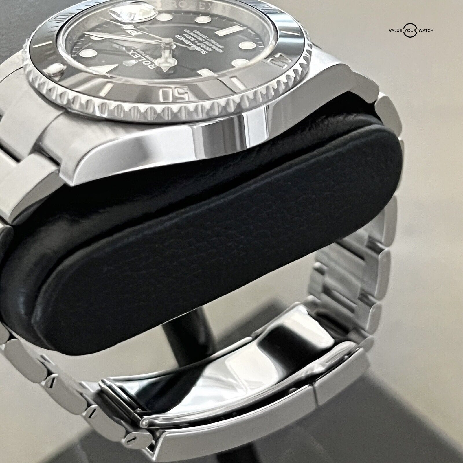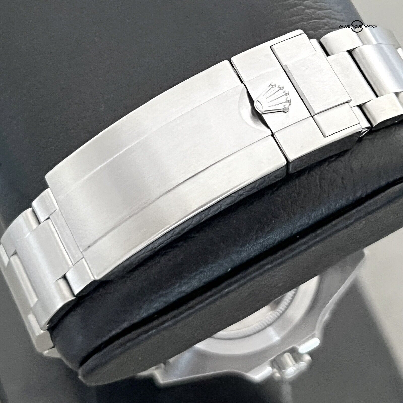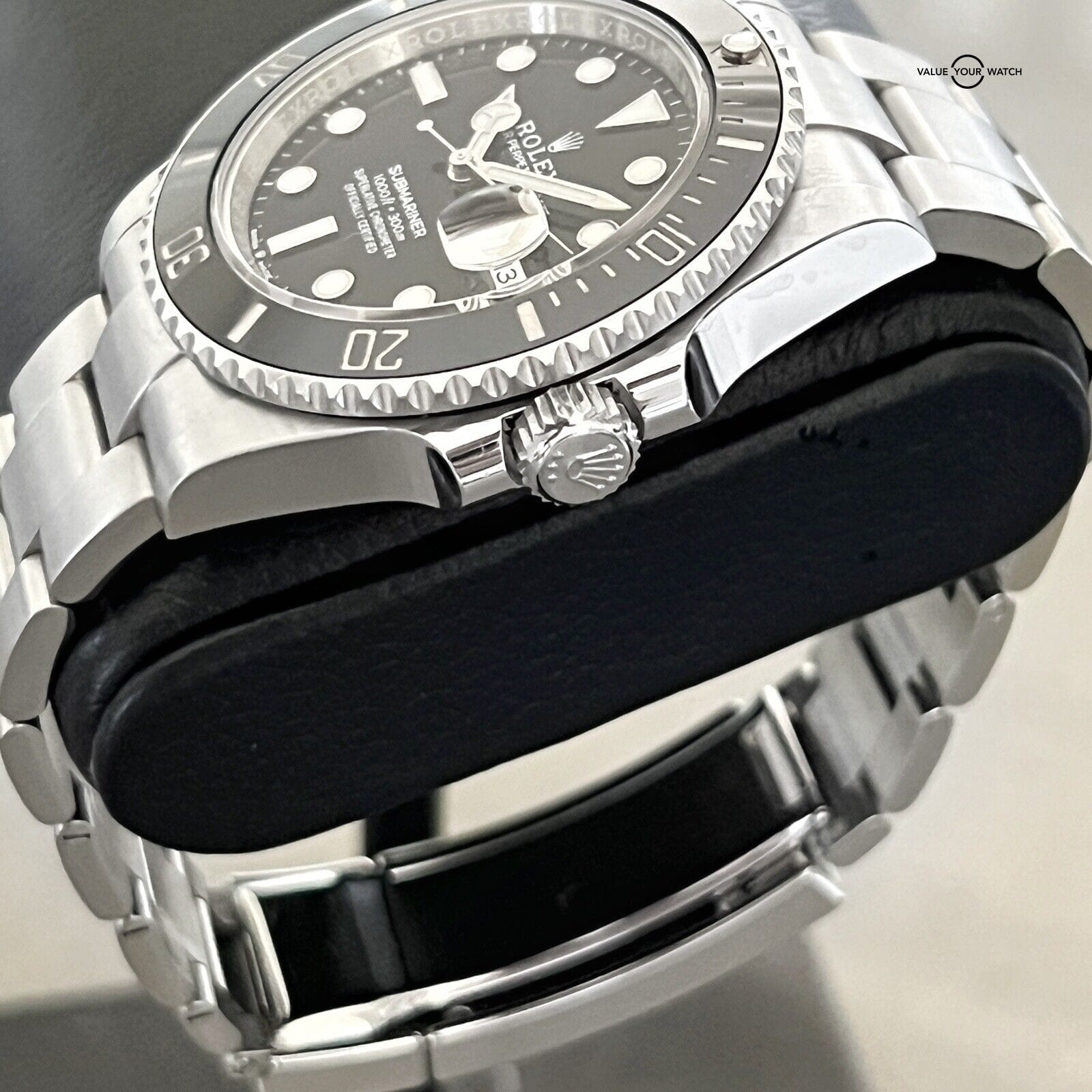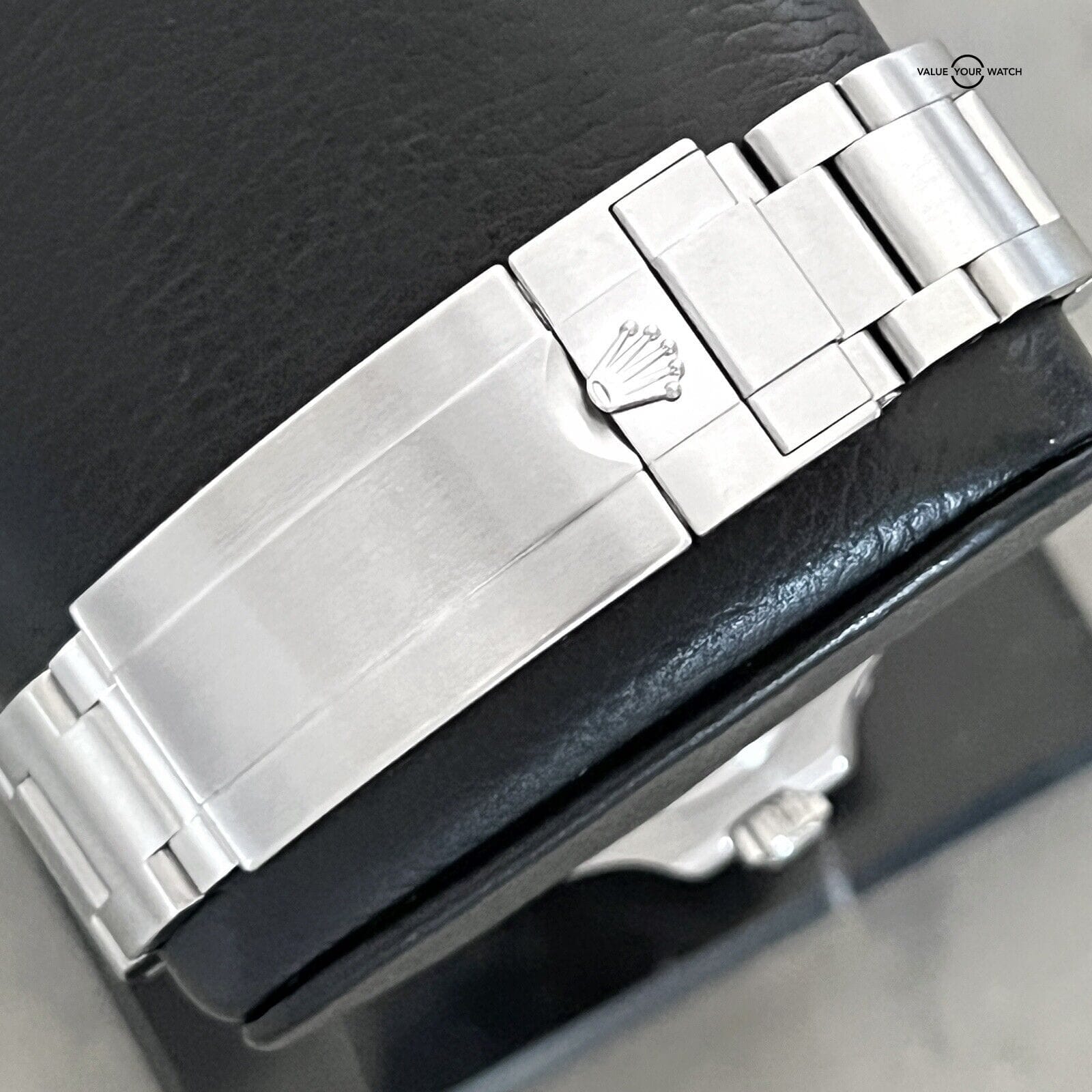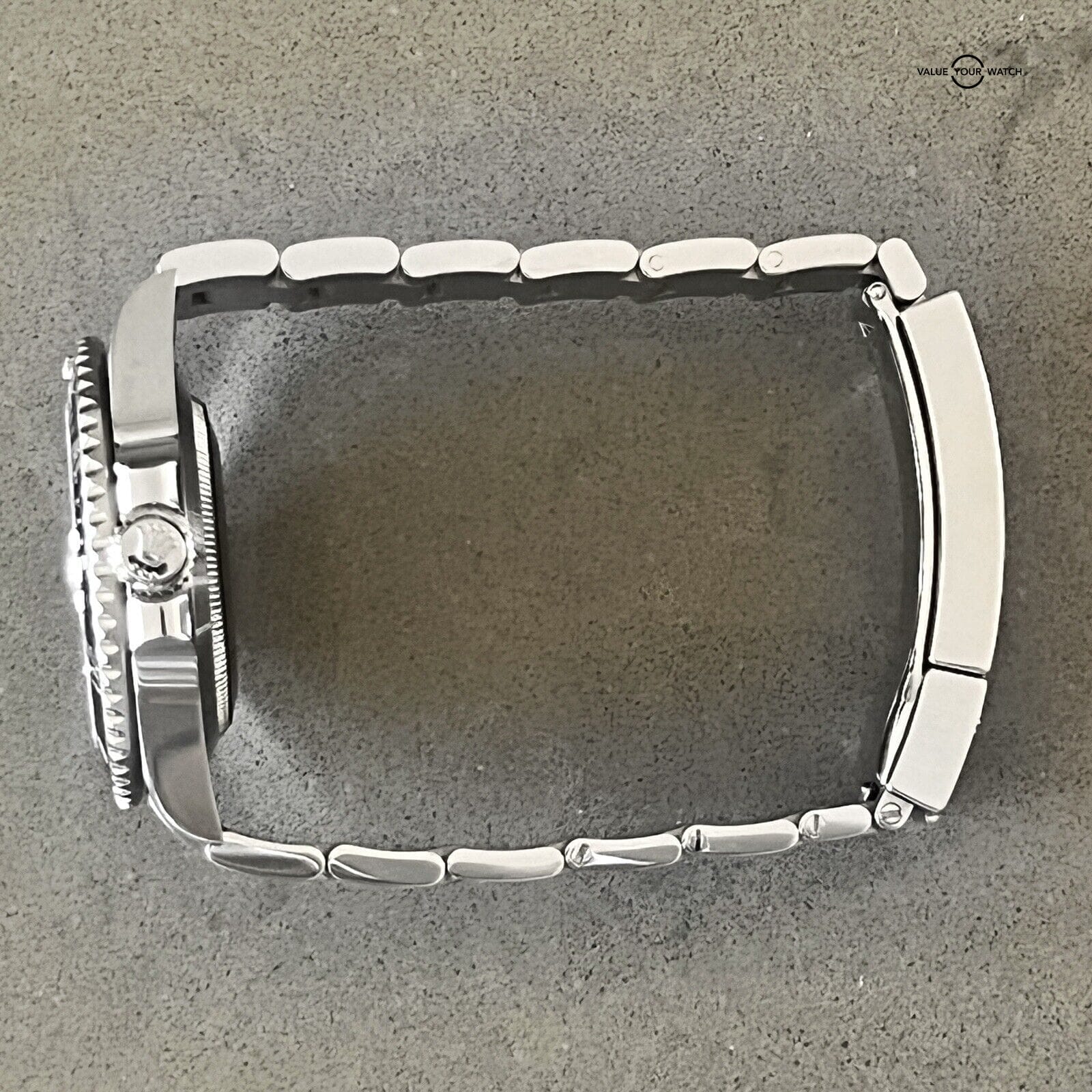 The watch has a 31-jewel mechanical automatic movement, which is self-winding and has a chronometer certification. The stainless steel Oyster bracelet with a fold-over clasp is comfortable to wear, and the lug width is 21mm. This Rolex Submariner Date comes with its original box and papers.